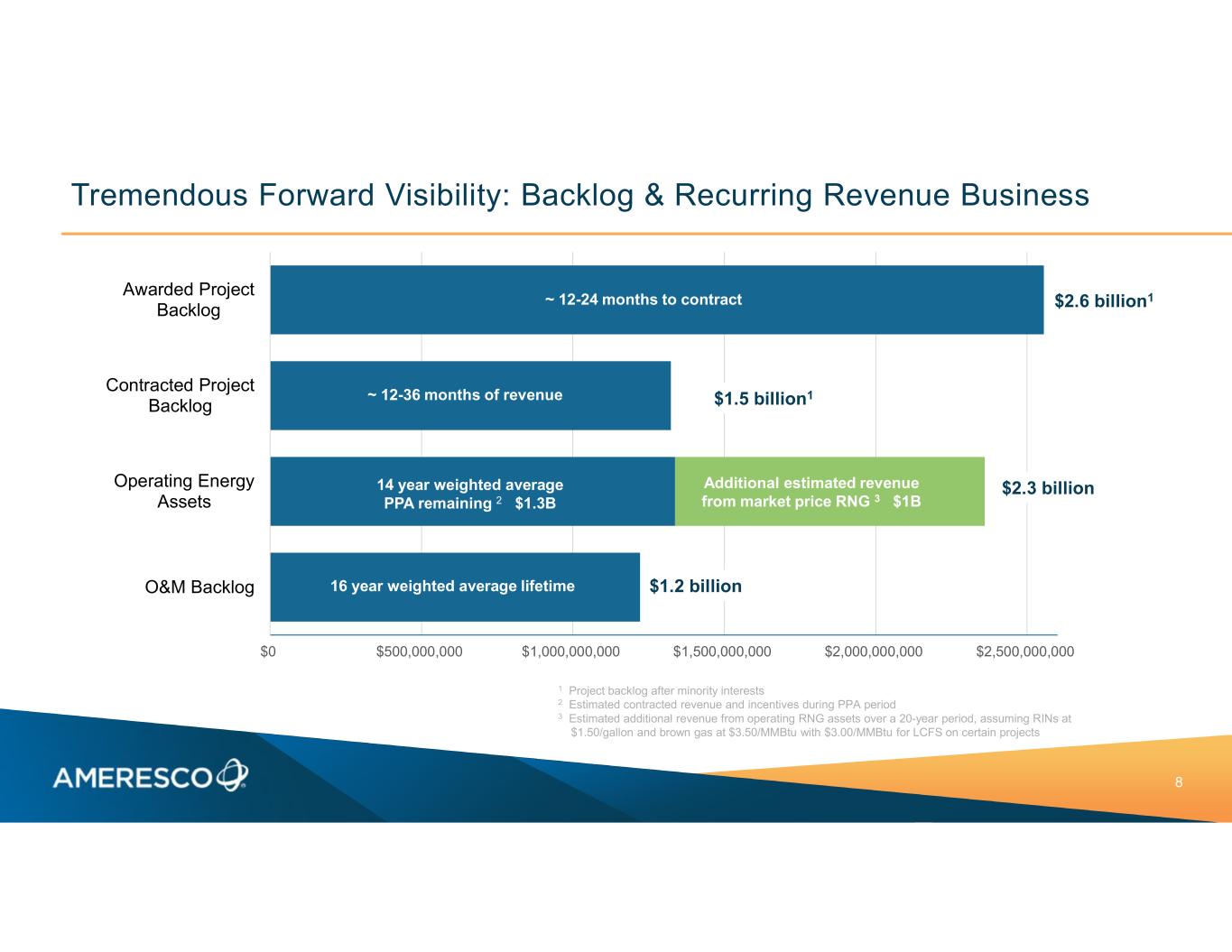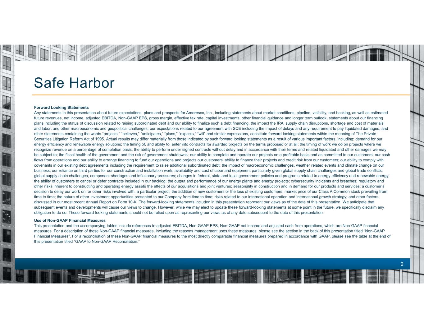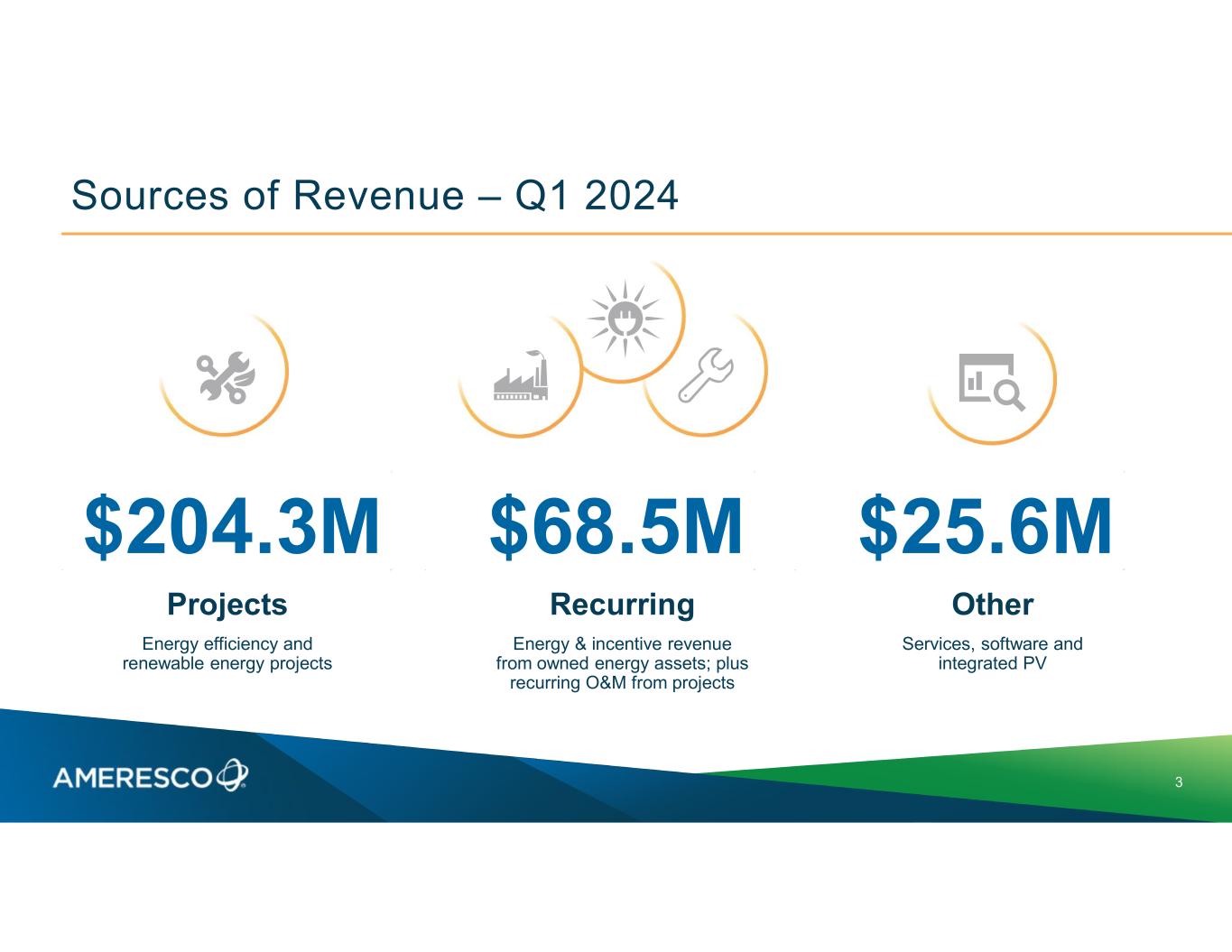 2 Safe Harbor Forward Looking Statements Any statements in this presentation about future expectations, plans and prospects for Ameresco, Inc., including statements about market conditions, pipeline, visibility, and backlog, as well as estimated future revenues, net income, adjusted EBITDA, Non-GAAP EPS, gross margin, effective tax rate, capital investments, other financial guidance and longer term outlook, statements about our financing plans including the status of discussion related to raising subordinated debt and our ability to finalize such a debt financing, the impact the IRA, supply chain disruptions, shortage and cost of materials and labor, and other macroeconomic and geopolitical challenges; our expectations related to our agreement with SCE including the impact of delays and any requirement to pay liquidated damages, and other statements containing the words “projects,” “believes,” “anticipates,” “plans,” “expects,” “will” and similar expressions, constitute forward-looking statements within the meaning of The Private Securities Litigation Reform Act of 1995. Actual results may differ materially from those indicated by such forward looking statements as a result of various important factors, including: demand for our energy efficiency and renewable energy solutions; the timing of, and ability to, enter into contracts for awarded projects on the terms proposed or at all; the timing of work we do on projects where we recognize revenue on a percentage of completion basis; the ability to perform under signed contracts without delay and in accordance with their terms and related liquidated and other damages we may be subject to; the fiscal health of the government and the risk of government shutdowns; our ability to complete and operate our projects on a profitable basis and as committed to our customers; our cash flows from operations and our ability to arrange financing to fund our operations and projects our customers’ ability to finance their projects and credit risk from our customers; our ability to comply with covenants in our existing debt agreements including the requirement to raise additional subordinated debt; the impact of macroeconomic challenges, weather related events and climate change on our business; our reliance on third parties for our construction and installation work; availability and cost of labor and equipment particularly given global supply chain challenges and global trade conflicts; global supply chain challenges, component shortages and inflationary pressures; changes in federal, state and local government policies and programs related to energy efficiency and renewable energy; the ability of customers to cancel or defer contracts included in our backlog; the output and performance of our energy plants and energy projects; cybersecurity incidents and breaches; regulatory and other risks inherent to constructing and operating energy assets the effects of our acquisitions and joint ventures; seasonality in construction and in demand for our products and services; a customer’s decision to delay our work on, or other risks involved with, a particular project; the addition of new customers or the loss of existing customers; market price of our Class A Common stock prevailing from time to time; the nature of other investment opportunities presented to our Company from time to time; risks related to our international operation and international growth strategy; and other factors discussed in our most recent Annual Report on Form 10-K. The forward-looking statements included in this presentation represent our views as of the date of this presentation. We anticipate that subsequent events and developments will cause our views to change. However, while we may elect to update these forward-looking statements at some point in the future, we specifically disclaim any obligation to do so. These forward-looking statements should not be relied upon as representing our views as of any date subsequent to the date of this presentation. Use of Non-GAAP Financial Measures This presentation and the accompanying tables include references to adjusted EBITDA, Non-GAAP EPS, Non-GAAP net income and adjusted cash from operations, which are Non-GAAP financial measures. For a description of these Non-GAAP financial measures, including the reasons management uses these measures, please see the section in the back of this presentation titled “Non-GAAP Financial Measures”. For a reconciliation of these Non-GAAP financial measures to the most directly comparable financial measures prepared in accordance with GAAP, please see the table at the end of this presentation titled “GAAP to Non-GAAP Reconciliation.”
