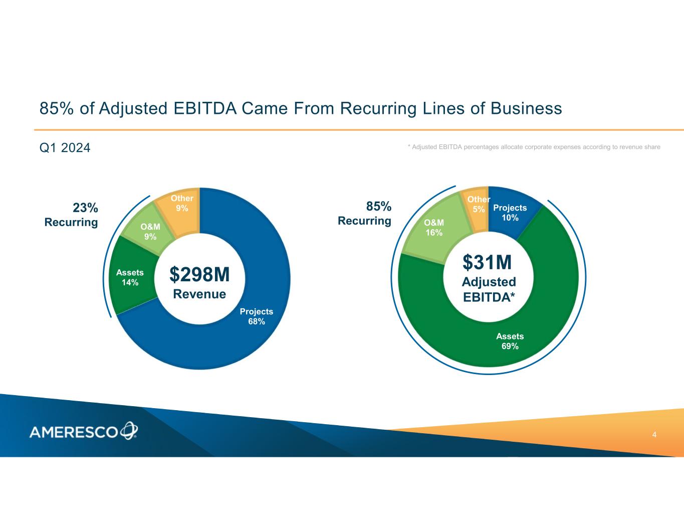Projects 10% Assets 69% O&M 16% Other 5% $31M Adjusted EBITDA* 85% of Adjusted EBITDA Came From Recurring Lines of Business 4 Projects 68% Assets 14% O&M 9% Other 9%23% Recurring $298M Revenue * Adjusted EBITDA percentages allocate corporate expenses according to revenue shareQ1 2024 85% Recurring
