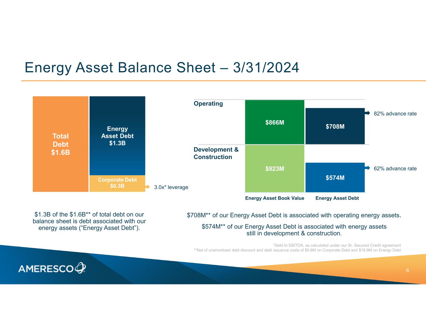 Energy Asset Portfolio – 3/31/2024 5 518 MWe of Energy Assets in operation. 92 MW of non-RNG biogas, 49 MW of RNG, Solar is 325 MW, Other is 53 MW 762 MWe of total assets in development. 756 MWe of Ameresco-owned capacity after minority interest Operating Energy Assets 518 MWe Other: 10% Solar: 63% Biogas: RNG 9% Biogas: Non-RNG 18% Energy Assets in Development & Construction, 756 MWe EaaS*: 18% Battery: 34% Solar: 30% Biogas: 18% Numbers may not sum due to rounding *$5M of our anticipated Assets in Development spending is for Energy as a Service assets which do not include generation assets that can be measured in MWe. This metric also includes Puuloa and Ukiu Energy engine plants. Ameresco’s Ownership