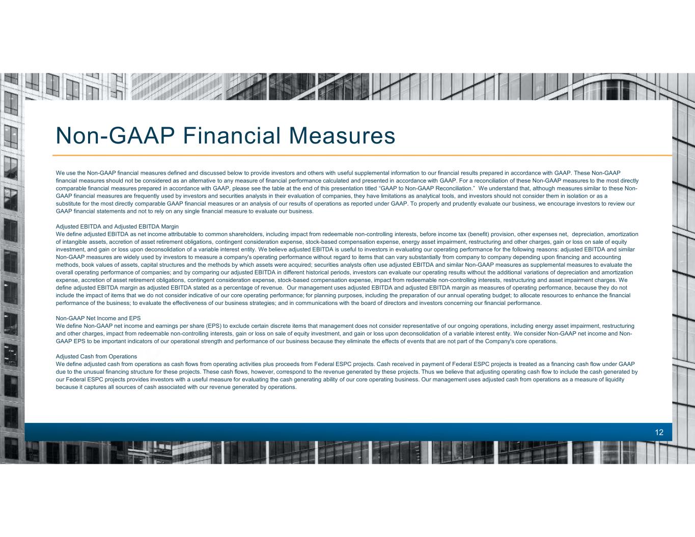 12 Non-GAAP Financial Measures We use the Non-GAAP financial measures defined and discussed below to provide investors and others with useful supplemental information to our financial results prepared in accordance with GAAP. These Non-GAAP financial measures should not be considered as an alternative to any measure of financial performance calculated and presented in accordance with GAAP. For a reconciliation of these Non-GAAP measures to the most directly comparable financial measures prepared in accordance with GAAP, please see the table at the end of this presentation titled “GAAP to Non-GAAP Reconciliation.” We understand that, although measures similar to these Non- GAAP financial measures are frequently used by investors and securities analysts in their evaluation of companies, they have limitations as analytical tools, and investors should not consider them in isolation or as a substitute for the most directly comparable GAAP financial measures or an analysis of our results of operations as reported under GAAP. To properly and prudently evaluate our business, we encourage investors to review our GAAP financial statements and not to rely on any single financial measure to evaluate our business. Adjusted EBITDA and Adjusted EBITDA Margin We define adjusted EBITDA as net income attributable to common shareholders, including impact from redeemable non-controlling interests, before income tax (benefit) provision, other expenses net, depreciation, amortization of intangible assets, accretion of asset retirement obligations, contingent consideration expense, stock-based compensation expense, energy asset impairment, restructuring and other charges, gain or loss on sale of equity investment, and gain or loss upon deconsolidation of a variable interest entity. We believe adjusted EBITDA is useful to investors in evaluating our operating performance for the following reasons: adjusted EBITDA and similar Non-GAAP measures are widely used by investors to measure a company's operating performance without regard to items that can vary substantially from company to company depending upon financing and accounting methods, book values of assets, capital structures and the methods by which assets were acquired; securities analysts often use adjusted EBITDA and similar Non-GAAP measures as supplemental measures to evaluate the overall operating performance of companies; and by comparing our adjusted EBITDA in different historical periods, investors can evaluate our operating results without the additional variations of depreciation and amortization expense, accretion of asset retirement obligations, contingent consideration expense, stock-based compensation expense, impact from redeemable non-controlling interests, restructuring and asset impairment charges. We define adjusted EBITDA margin as adjusted EBITDA stated as a percentage of revenue. Our management uses adjusted EBITDA and adjusted EBITDA margin as measures of operating performance, because they do not include the impact of items that we do not consider indicative of our core operating performance; for planning purposes, including the preparation of our annual operating budget; to allocate resources to enhance the financial performance of the business; to evaluate the effectiveness of our business strategies; and in communications with the board of directors and investors concerning our financial performance. Non-GAAP Net Income and EPS We define Non-GAAP net income and earnings per share (EPS) to exclude certain discrete items that management does not consider representative of our ongoing operations, including energy asset impairment, restructuring and other charges, impact from redeemable non-controlling interests, gain or loss on sale of equity investment, and gain or loss upon deconsolidation of a variable interest entity. We consider Non-GAAP net income and Non- GAAP EPS to be important indicators of our operational strength and performance of our business because they eliminate the effects of events that are not part of the Company's core operations. Adjusted Cash from Operations We define adjusted cash from operations as cash flows from operating activities plus proceeds from Federal ESPC projects. Cash received in payment of Federal ESPC projects is treated as a financing cash flow under GAAP due to the unusual financing structure for these projects. These cash flows, however, correspond to the revenue generated by these projects. Thus we believe that adjusting operating cash flow to include the cash generated by our Federal ESPC projects provides investors with a useful measure for evaluating the cash generating ability of our core operating business. Our management uses adjusted cash from operations as a measure of liquidity because it captures all sources of cash associated with our revenue generated by operations.