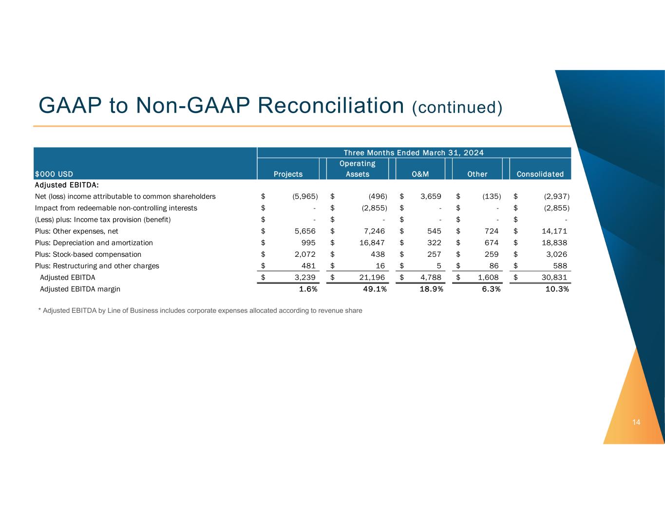 GAAP to Non-GAAP Reconciliation (continued) 14 * Adjusted EBITDA by Line of Business includes corporate expenses allocated according to revenue share $000 USD Projects Operating Assets O&M Other Consolidated Adjusted EBITDA: Net (loss) income attributable to common shareholders (5,965)$ (496)$ 3,659$ (135)$ (2,937)$ Impact from redeemable non-controlling interests -$ (2,855)$ -$ -$ (2,855)$ (Less) plus: Income tax provision (benefit) -$ -$ -$ -$ -$ Plus: Other expenses, net 5,656$ 7,246$ 545$ 724$ 14,171$ Plus: Depreciation and amortization 995$ 16,847$ 322$ 674$ 18,838$ Plus: Stock-based compensation 2,072$ 438$ 257$ 259$ 3,026$ Plus: Restructuring and other charges 481$ 16$ 5$ 86$ 588$ Adjusted EBITDA 3,239$ 21,196$ 4,788$ 1,608$ 30,831$ Adjusted EBITDA margin 1.6% 49.1% 18.9% 6.3% 10.3% Three Months Ended March 31, 2024