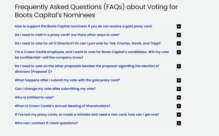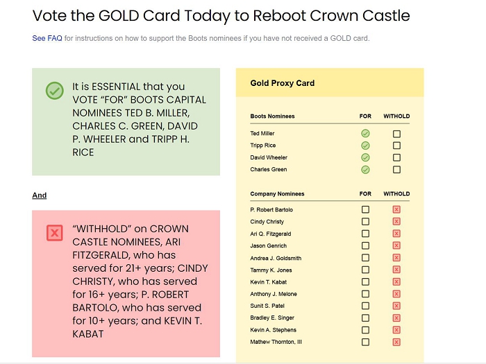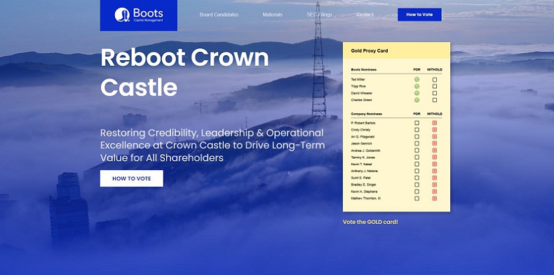 Boots Capital and the other Participants have filed a definitive proxy statement and accompanying GOLD proxy card (the “Definitive Proxy Statement”) with the Securities and Exchange Commission (the “SEC”) on April 22, 2024 to be used to solicit proxies for, among other matters, the election of its slate of director nominees at the 2024 annual meeting of stockholders of Crown Castle Inc., a Delaware corporation (“Crown Castle” or the “Corporation”).