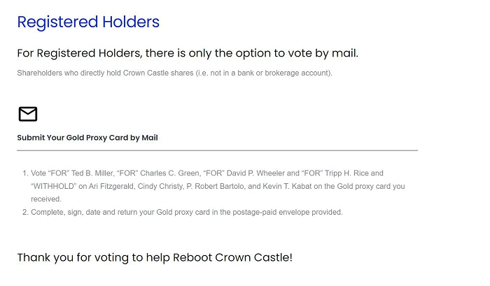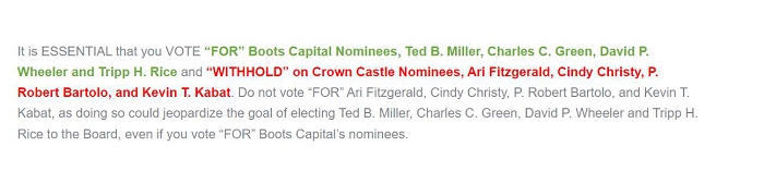 BOOTS CAPITAL STRONGLY ADVISES ALL STOCKHOLDERS OF CROWN CASTLE TO READ THE DEFINITIVE PROXY STATEMENT, ANY AMENDMENTS OR SUPPLEMENTS TO SUCH DEFINITIVE PROXY STATEMENT, AND OTHER PROXY MATERIALS FILED BY BOOTS CAPITAL AS THEY CONTAIN IMPORTANT INFORMATION. SUCH PROXY MATERIALS ARE AVAILABLE AT NO CHARGE ON THE SEC’S WEBSITE AT WWW.SEC.GOV AND AT BOOTS CAPITAL’S WEBSITE AT WWW.REBOOTCROWNCASTLE.COM. THE DEFINITIVE PROXY STATEMENT AND ACCOMPANYING PROXY CARD WILL BE FURNISHED TO SOME OR ALL OF THE CORPORATION’S STOCKHOLDERS. STOCKHOLDERS MAY ALSO DIRECT A REQUEST TO THE PARTICIPANTS’ PROXY SOLICITOR, MORROW SODALI LLC, 430 PARK AVE., 14TH FLOOR, NEW YORK, NEW YORK 10022 (STOCKHOLDERS CAN CALL TOLL-FREE: (800) 662-5200).