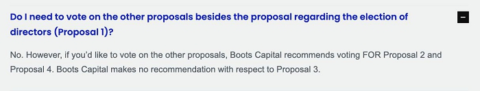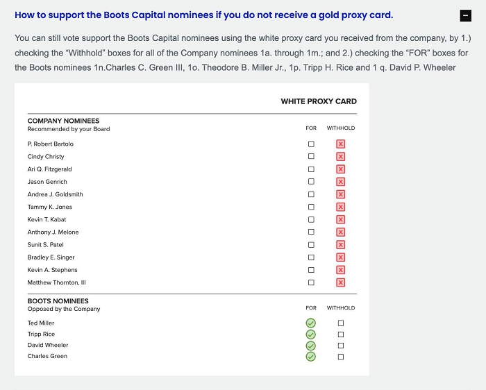 The information herein contains “forward-looking statements.” Specific forward-looking statements can be identified by the fact that they do not relate strictly to historical or current facts and include, without limitation, words such as “may,” “will,” “expects,” “believes,” “anticipates,” “plans,” “estimates,” “projects,” “potential,” “targets,” “forecasts,” “seeks,” “could,” “should” or the negative of such terms or other variations on such terms or comparable terminology. Similarly, statements that describe the Participants’ (as defined below) objectives, plans or goals are forward-looking. Forward-looking statements are subject to various risks and uncertainties and assumptions. There can be no assurance that any idea or assumption herein is, or will be proven, correct. If one or more of the risks or uncertainties materialize, or if the underlying assumptions of Boots Capital (as defined below) or any of the other Participants in the proxy solicitation described herein prove to be incorrect, the actual results may vary materially from outcomes indicated by these statements. Accordingly, forward-looking statements should not be regarded as a representation by Boots Capital or the other Participants that the future plans, estimates or expectations contemplated will ever be achieved. You should not rely upon forward-looking statements as a prediction of actual results and actual results may vary materially from what is expressed in or indicated by the forward-looking statements. Except to the extent required by applicable law, neither Boots Capital nor any Participant will undertake and specifically declines any obligation to disclose the results of any revisions that may be made to any projected results or forward-looking statements herein to reflect events or circumstances after the date of such projected results or statements or to reflect the occurrence of anticipated or unanticipated events.