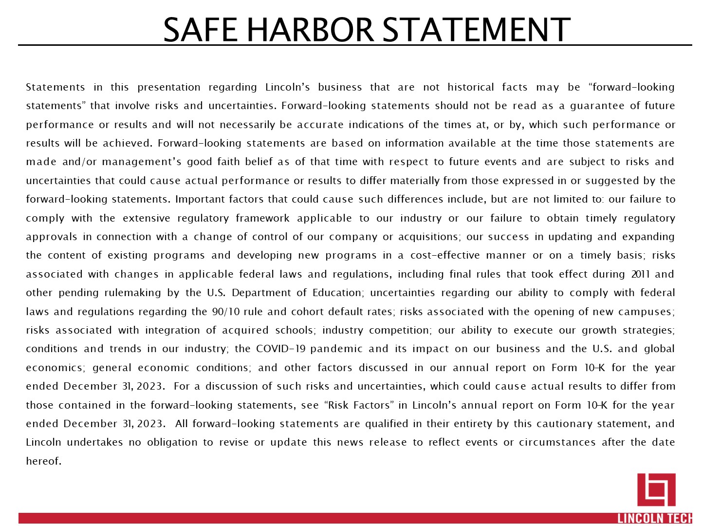 Statements in this press release and in oral statements made from time to time by representatives of Lincoln Educational Services