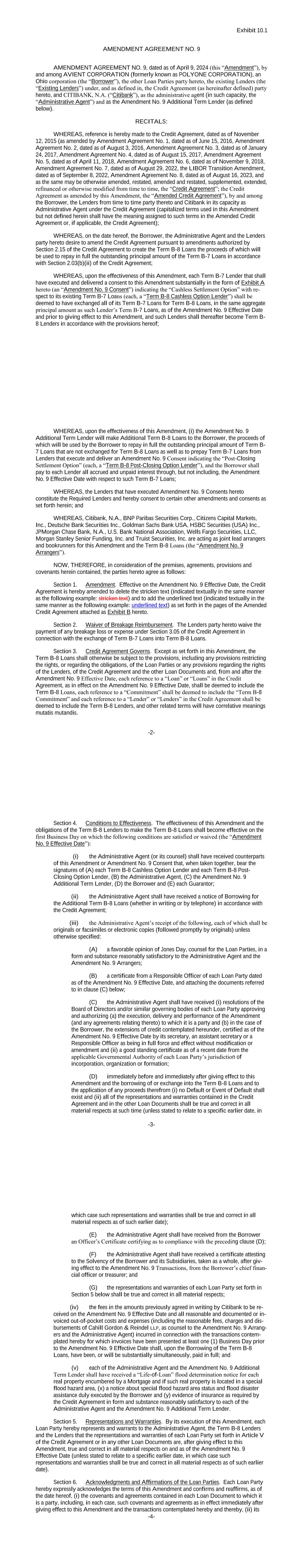 Exhibit 10.1 AMENDMENT AGREEMENT NO. 9 AMENDMENT AGREEMENT NO. 9, dated as of April 9, 2024 (this “Amendment”), by and among AVIENT CORPORATION (formerly known as POLYONE CORPORATION), an Ohio corporation (the “Borrower”), the other Loan Parties party hereto, the existing Lenders (the “Existing Lenders”) under, and as defined in, the Credit Agreement (as hereinafter defined) party hereto, and CITIBANK, N.A. (“Citibank”), as the administrative agent (in such capacity, the “Administrative Agent”) and as the Amendment No. 9 Additional Term Lender (as defined below). RECITALS: WHEREAS, reference is hereby made to the Credit Agreement, dated as of November 12, 2015 (as amended by Amendment Agreement No. 1, dated as of June 15, 2016, Amendment Agreement No. 2, dated as of August 3, 2016, Amendment Agreement No. 3, dated as of January 24, 2017, Amendment Agreement No. 4, dated as of August 15, 2017, Amendment Agreement No. 5, dated as of April 11, 2018, Amendment Agreement No. 6, dated as of November 9, 2018, Amendment Agreement No. 7, dated as of August 29, 2022, the LIBOR Transition Amendment, dated as of September 8, 2022, Amendment Agreement No. 8, dated as of August 16, 2023, and as the same may be otherwise amended, restated, amended and restated, supplemented, extended, refinanced or otherwise modified from time to time, the “Credit Agreement”; the Credit Agreement as amended by this Amendment, the “Amended Credit Agreement”), by and among the Borrower, the Lenders from time to time party thereto and Citibank in its capacity as Administrative Agent under the Credit Agreement (capitalized terms used in this Amendment but not defined herein shall have the meaning assigned to such terms in the Amended Credit Agreement or, if applicable, the Credit Agreement); WHEREAS, on the date hereof, the Borrower, the Administrative Agent and the Lenders party hereto desire to amend the Credit Agreement pursuant to amendments authorized by Section 2.15 of the Credit Agreement to create the Term B-8 Loans the proceeds of which will be used to repay in full the outstanding principal amount of the Term B-7 Loans in accordance with Section 2.03(b)(ii) of the Credit Agreement; WHEREAS, upon the effectiveness of this Amendment, each Term B-7 Lender that shall have executed and delivered a consent to this Amendment substantially in the form of Exhibit A hereto (an “Amendment No. 9 Consent”) indicating the “Cashless Settlement Option” with re- spect to its existing Term B-7 Loans (each, a “Term B-8 Cashless Option Lender”) shall be deemed to have exchanged all of its Term B-7 Loans for Term B-8 Loans, in the same aggregate principal amount as such Lender’s Term B-7 Loans, as of the Amendment No. 9 Effective Date and prior to giving effect to this Amendment, and such Lenders shall thereafter become Term B- 8 Lenders in accordance with the provisions hereof; -2- WHEREAS, upon the effectiveness of this Amendment, (i) the Amendment No. 9 Additional Term Lender will make Additional Term B-8 Loans to the Borrower, the proceeds of which will be used by the Borrower to repay in full the outstanding principal amount of Term B- 7 Loans that are not exchanged for Term B-8 Loans as well as to prepay Term B-7 Loans from Lenders that execute and deliver an Amendment No. 9 Consent indicating the “Post-Closing Settlement Option” (each, a “Term B-8 Post-Closing Option Lender”), and the Borrower shall pay to each Lender all accrued and unpaid interest through, but not including, the Amendment No. 9 Effective Date with respect to such Term B-7 Loans; WHEREAS, the Lenders that have executed Amendment No. 9 Consents hereto constitute the Required Lenders and hereby consent to certain other amendments and consents as set forth herein; and WHEREAS, Citibank, N.A., BNP Paribas Securities Corp., Citizens Capital Markets, Inc., Deutsche Bank Securities Inc., Goldman Sachs Bank USA, HSBC Securities (USA) Inc., JPMorgan Chase Bank, N.A., U.S. Bank National Association, Wells Fargo Securities, LLC, Morgan Stanley Senior Funding, Inc. and Truist Securities, Inc. are acting as joint lead arrangers and bookrunners for this Amendment and the Term B-8 Loans (the “Amendment No. 9 Arrangers”). NOW, THEREFORE, in consideration of the premises, agreements, provisions and covenants herein contained, the parties hereto agree as follows: Section 1. Amendment. Effective on the Amendment No. 9 Effective Date, the Credit Agreement is hereby amended to delete the stricken text (indicated textually in the same manner as the following example: stricken text) and to add the underlined text (indicated textually in the same manner as the following example: underlined text) as set forth in the pages of the Amended Credit Agreement attached as Exhibit B hereto. Section 2. Waiver of Breakage Reimbursement. The Lenders party hereto waive the payment of any breakage loss or expense under Section 3.05 of the Credit Agreement in connection with the exchange of Term B-7 Loans into Term B-8 Loans. Section 3. Credit Agreement Governs. Except as set forth in this Amendment, the Term B-8 Loans shall otherwise be subject to the provisions, including any provisions restricting the rights, or regarding the obligations, of the Loan Parties or any provisions regarding the rights of the Lenders, of the Credit Agreement and the other Loan Documents and, from and after the Amendment No. 9 Effective Date, each reference to a “Loan” or “Loans” in the Credit Agreement, as in effect on the Amendment No. 9 Effective Date, shall be deemed to include the Term B-8 Loans, each reference to a “Commitment” shall be deemed to include the “Term B-8 Commitment” and each reference to a “Lender” or “Lenders” in the Credit Agreement shall be deemed to include the Term B-8 Lenders, and other related terms will have correlative meanings mutatis mutandis. -3- Section 4. Conditions to Effectiveness. The effectiveness of thi