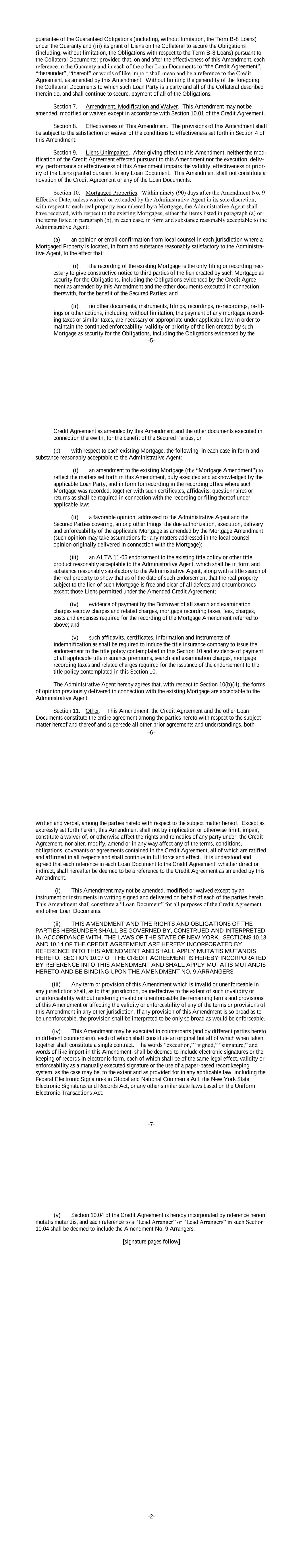 -5- guarantee of the Guaranteed Obligations (including, without limitation, the Term B-8 Loans) under the Guaranty and (iii) its grant of Liens on the Collateral to secure the Obligations (including, without limitation, the Obligations with respect to the Term B-8 Loans) pursuant to the Collateral Documents; provided that, on and after the effectiveness of this Amendment, each reference in the Guaranty and in each of the other Loan Documents to “the Credit Agreement”, “thereunder”, “thereof” or words of like import shall mean and be a reference to the Credit Agreement, as amended by this Amendment. Without limiting the generality of the foregoing, the Collateral Documents to which such Loan Party is a party and all of the Collateral described therein do, and shall continue to secure, payment of all of the Obligations. Section 7. Amendment, Modification and Waiver. This Amendment may not be amended, modified or waived except in accordance with Section 10.01 of the Credit Agreement. Section 8. Effectiveness of This Amendment. The provisions of this Amendment shall be subject to the satisfaction or waiver of the conditions to effectiveness set forth in Section 4 of this Amendment. Section 9. Liens Unimpaired. After giving effect to this Amendment, neither the mod- ification of the Credit Agreement effected pursuant to this Amendment nor the execution, deliv- ery, performance or effectiveness of this Amendment impairs the validity, effectiveness or prior- ity of the Liens granted pursuant to any Loan Document. This Amendment shall not constitute a novation of the Credit Agreement or any of the Loan Documents. Section 10. Mortgaged Properties. Within ninety (90) days after the Amendment No. 9 Effective Date, unless waived or extended by the Administrative Agent in its sole discretion, with respect to each real property encumbered by a Mortgage, the Administrative Agent shall have received, with respect to the existing Mortgages, either the items listed in paragraph (a) or the items listed in paragraph (b), in each case, in form and substance reasonably acceptable to the Administrative Agent: (a) an opinion or email confirmation from local counsel in each jurisdiction where a Mortgaged Property is located, in form and substance reasonably satisfactory to the Administra- tive Agent, to the effect that: (i) the recording of the existing Mortgage is the only filing or recording nec- essary to give constructive notice to third parties of the lien created by such Mortgage as security for the Obligations, including the Obligations evidenced by the Credit Agree- ment as amended by this Amendment and the other documents executed in connection therewith, for the benefit of the Secured Parties; and (ii) no other documents, instruments, filings, recordings, re-recordings, re-fil- ings or other actions, including, without limitation, the payment of any mortgage record- ing taxes or similar taxes, are necessary or appropriate under applicable law in order to maintain the continued enforceability, validity or priority of the lien created by such Mortgage as security for the Obligations, including the Obligations evidenced by the -6- Credit Agreement as amended by this Amendment and the other documents executed in connection therewith, for the benefit of the Secured Parties; or (b) with respect to each existing Mortgage, the following, in each case in form and substance reasonably acceptable to the Administrative Agent: (i) an amendment to the existing Mortgage (the “Mortgage Amendment”) to reflect the matters set forth in this Amendment, duly executed and acknowledged by the applicable Loan Party, and in form for recording in the recording office where such Mortgage was recorded, together with such certificates, affidavits, questionnaires or returns as shall be required in connection with the recording or filing thereof under applicable law; (ii) a favorable opinion, addressed to the Administrative Agent and the Secured Parties covering, among other things, the due authorization, execution, delivery and enforceability of the applicable Mortgage as amended by the Mortgage Amendment (such opinion may take assumptions for any matters addressed in the local counsel opinion originally delivered in connection with the Mortgage); (iii) an ALTA 11-06 endorsement to the existing title policy or other title product reasonably acceptable to the Administrative Agent, which shall be in form and substance reasonably satisfactory to the Administrative Agent, along with a title search of the real property to show that as of the date of such endorsement that the real property subject to the lien of such Mortgage is free and clear of all defects and encumbrances except those Liens permitted under the Amended Credit Agreement; (iv) evidence of payment by the Borrower of all search and examination charges escrow charges and related charges, mortgage recording taxes, fees, charges, costs and expenses required for the recording of the Mortgage Amendment referred to above; and (v) such affidavits, certificates, information and instruments of indemnification as shall be required to induce the title insurance company to issue the endorsement to the title policy contemplated in this Section 10 and evidence of payment of all applicable title insurance premiums, search and examination charges, mortgage recording taxes and related charges required for the issuance of the endorsement to the title policy contemplated in this Section 10. The Administrative Agent hereby agrees that, with respect to Section 10(b)(ii), the forms of opinion previously delivered in connection with the existing Mortgage are acceptable to the Administrative Agent. Section 11. Other. This Amendment, the Credit Agreement and the other Loan Documents constitute the entire agreement among the parties hereto with respect to the subject matter hereof and thereof and supersede all other prior agreements and understandings, both -7- written and verbal, a