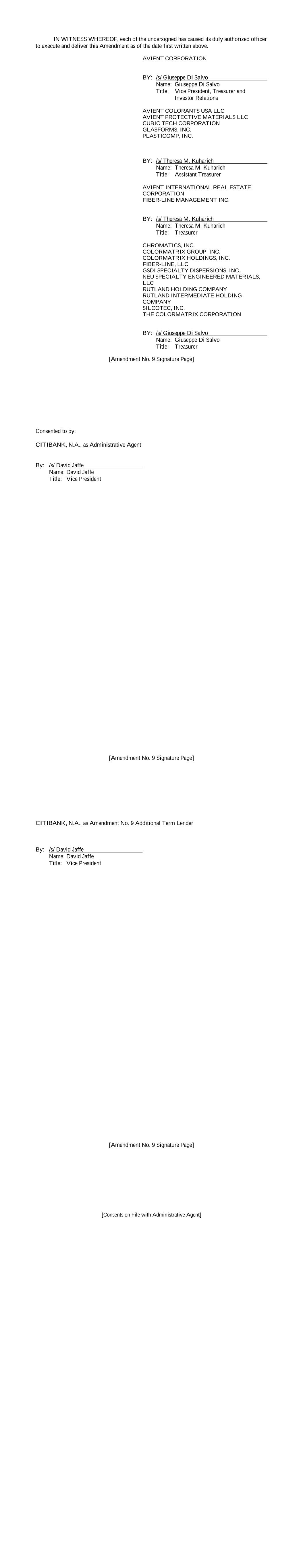 [Amendment No. 9 Signature Page] IN WITNESS WHEREOF, each of the undersigned has caused its duly authorized officer to execute and deliver this Amendment as of the date first written above. AVIENT CORPORATION BY: /s/ Giuseppe Di Salvo Name: Giuseppe Di Salvo Title: Vice President, Treasurer and Investor Relations AVIENT COLORANTS USA LLC AVIENT PROTECTIVE MATERIALS LLC CUBIC TECH CORPORATION GLASFORMS, INC. PLASTICOMP, INC. BY: /s/ Theresa M. Kuharich Name: Theresa M. Kuharich Title: Assistant Treasurer AVIENT INTERNATIONAL REAL ESTATE CORPORATION FIBER-LINE MANAGEMENT INC. BY: /s/ Theresa M. Kuharich Name: Theresa M. Kuharich Title: Treasurer CHROMATICS, INC. COLORMATRIX GROUP, INC. COLORMATRIX HOLDINGS, INC. FIBER-LINE, LLC GSDI SPECIALTY DISPERSIONS, INC. NEU SPECIALTY ENGINEERED MATERIALS, LLC RUTLAND HOLDING COMPANY RUTLAND INTERMEDIATE HOLDING COMPANY SILCOTEC, INC. THE COLORMATRIX CORPORATION BY: /s/ Giuseppe Di Salvo Name: Giuseppe Di Salvo Title: Treasurer [Amendment No. 9 Signature Page] Consented to by: CITIBANK, N.A., as Administrative Agent By: /s/ David Jaffe Name: David Jaffe Title: Vice President [Amendment No. 9 Signature Page] CITIBANK, N.A., as Amendment No. 9 Additional Term Lender By: /s/ David Jaffe Name: David Jaffe Title: Vice President [Consents on File with Administrative Agent]