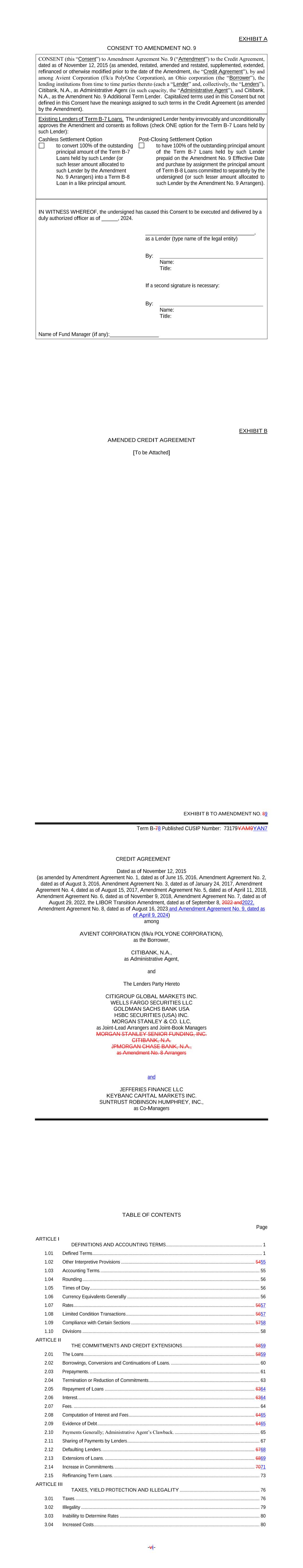 EXHIBIT A CONSENT TO AMENDMENT NO. 9 CONSENT (this “Consent”) to Amendment Agreement No. 9 (“Amendment”) to the Credit Agreement, dated as of November 12, 2015 (as amended, restated, amended and restated, supplemented, extended, refinanced or otherwise modified prior to the date of the Amendment, the “Credit Agreement”), by and among Avient Corporation (f/k/a PolyOne Corporation), an Ohio corporation (the “Borrower”), the lending institutions from time to time parties thereto (each a “Lender” and, collectively, the “Lenders”), Citibank, N.A., as Administrative Agent (in such capacity, the “Administrative Agent”), and Citibank, N.A., as the Amendment No. 9 Additional Term Lender. Capitalized terms used in this Consent but not defined in this Consent have the meanings assigned to such terms in the Credit Agreement (as amended by the Amendment). Existing Lenders of Term B-7 Loans. The undersigned Lender hereby irrevocably and unconditionally approves the Amendment and consents as follows (check ONE option for the Term B-7 Loans held by such Lender): Cashless Settlement Option to convert 100% of the outstanding principal amount of the Term B-7 Loans held by such Lender (or such lesser amount allocated to such Lender by the Amendment No. 9 Arrangers) into a Term B-8 Loan in a like principal amount. Post-Closing Settlement Option to have 100% of the outstanding principal amount of the Term B-7 Loans held by such Lender prepaid on the Amendment No. 9 Effective Date and purchase by assignment the principal amount of Term B-8 Loans committed to separately by the undersigned (or such lesser amount allocated to such Lender by the Amendment No. 9 Arrangers). IN WITNESS WHEREOF, the undersigned has caused this Consent to be executed and delivered by a duly authorized officer as of ______, 2024. ________________________________________, as a Lender (type name of the legal entity) By: Name: Title: If a second signature is necessary: By: Name: Title: Name of Fund Manager (if any):__________________ EXHIBIT B AMENDED CREDIT AGREEMENT [To be Attached] EXHIBIT B TO AMENDMENT NO. 89 Term B-78 Published CUSIP Number: 73179YAM9YAN7 CREDIT AGREEMENT Dated as of November 12, 2015 (as amended by Amendment Agreement No. 1, dated as of June 15, 2016, Amendment Agreement No. 2, dated as of August 3, 2016, Amendment Agreement No. 3, dated as of January 24, 2017, Amendment Agreement No. 4, dated as of August 15, 2017, Amendment Agreement No. 5, dated as of April 11, 2018, Amendment Agreement No. 6, dated as of November 9, 2018, Amendment Agreement No. 7, dated as of August 29, 2022, the LIBOR Transition Amendment, dated as of September 8, 2022 and2022, Amendment Agreement No. 8, dated as of August 16, 2023 and Amendment Agreement No. 9, dated as of April 9, 2024) among AVIENT CORPORATION (f/k/a POLYONE CORPORATION), as the Borrower, CITIBANK, N.A., as Administrative Agent, and The Lenders Party Hereto CITIGROUP GLOBAL MARKETS INC. WELLS FARGO SECURITIES LLC GOLDMAN SACHS BANK USA HSBC SECURITIES (USA) INC. MORGAN STANLEY & CO. LLC, as Joint-Lead Arrangers and Joint-Book Managers MORGAN STANLEY SENIOR FUNDING, INC. CITIBANK, N.A. JPMORGAN CHASE BANK, N.A., as Amendment No. 8 Arrangers and JEFFERIES FINANCE LLC KEYBANC CAPITAL MARKETS INC. SUNTRUST ROBINSON HUMPHREY, INC., as Co-Managers -vi- TABLE OF CONTENTS Page ARTICLE I DEFINITIONS AND ACCOUNTING TERMS ............................................................................. 1 1.01 Defined Terms ........................................................................................................................................ 1 1.02 Other Interpretive Provisions ........................................................................................................... 5455 1.03 Accounting Terms. ............................................................................................................................... 55 1.04 Rounding .............................................................................................................................................. 56 1.05 Times of Day ........................................................................................................................................ 56 1.06 Currency Equivalents Generally .......................................................................................................... 56 1.07 Rates ................................................................................................................................................. 5657 1.08 Limited Condition Transactions ....................................................................................................... 5657 1.09 Compliance with Certain Sections ................................................................................................... 5758 1.10 Divisions .............................................................................................................................................. 58 ARTICLE II THE COMMITMENTS AND CREDIT EXTENSIONS.......................................................... 5859 2.01 The Loans ......................................................................................................................................... 5859 2.02 Borrowings, Conversions and Continuations of Loans. ....................................................................... 60 2.03 Prepayments. ........................................................................................................................................ 61 2.04 Termination or Reduction of Commitments......................................................................................... 63 2.05 Repayment of Loans ........................................................................................................................ 6364 2.06 Interest. ...........................................................................................................