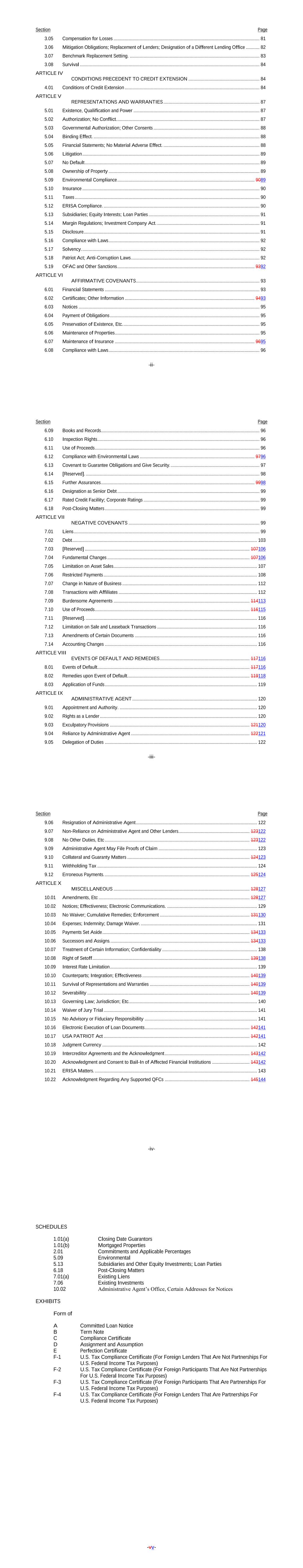 Section Page -ii- 3.05 Compensation for Losses ..................................................................................................................... 81 3.06 Mitigation Obligations; Replacement of Lenders; Designation of a Different Lending Office ........... 82 3.07 Benchmark Replacement Setting. ........................................................................................................ 83 3.08 Survival ................................................................................................................................................ 84 ARTICLE IV CONDITIONS PRECEDENT TO CREDIT EXTENSION ......................................................... 84 4.01 Conditions of Credit Extension ............................................................................................................ 84 ARTICLE V REPRESENTATIONS AND WARRANTIES ............................................................................. 87 5.01 Existence, Qualification and Power ..................................................................................................... 87 5.02 Authorization; No Conflict................................................................................................................... 87 5.03 Governmental Authorization; Other Consents ..................................................................................... 88 5.04 Binding Effect. ..................................................................................................................................... 88 5.05 Financial Statements; No Material Adverse Effect. ............................................................................. 88 5.06 Litigation .............................................................................................................................................. 89 5.07 No Default ............................................................................................................................................ 89 5.08 Ownership of Property ......................................................................................................................... 89 5.09 Environmental Compliance .............................................................................................................. 9089 5.10 Insurance .............................................................................................................................................. 90 5.11 Taxes .................................................................................................................................................... 90 5.12 ERISA Compliance. ............................................................................................................................. 90 5.13 Subsidiaries; Equity Interests; Loan Parties ......................................................................................... 91 5.14 Margin Regulations; Investment Company Act. .................................................................................. 91 5.15 Disclosure ............................................................................................................................................. 91 5.16 Compliance with Laws ......................................................................................................................... 92 5.17 Solvency. .............................................................................................................................................. 92 5.18 Patriot Act; Anti-Corruption Laws ....................................................................................................... 92 5.19 OFAC and Other Sanctions .............................................................................................................. 9392 ARTICLE VI AFFIRMATIVE COVENANTS ................................................................................................... 93 6.01 Financial Statements ............................................................................................................................ 93 6.02 Certificates; Other Information ........................................................................................................ 9493 6.03 Notices ................................................................................................................................................. 95 6.04 Payment of Obligations ........................................................................................................................ 95 6.05 Preservation of Existence, Etc. ............................................................................................................. 95 6.06 Maintenance of Properties .................................................................................................................... 95 6.07 Maintenance of Insurance ................................................................................................................ 9695 6.08 Compliance with Laws ......................................................................................................................... 96 Section Page -iii- 6.09 Books and Records ............................................................................................................................... 96 6.10 Inspection Rights .................................................................................................................................. 96 6.11 Use of Proceeds .................................................................................................................................... 96 6.12 Compliance with Environmental Laws ............................................................................................ 9796 6.13 Covenant to Guarantee Obligations and Give Security. ....................................................................... 97 6.14 [Reserved]. ..........................................