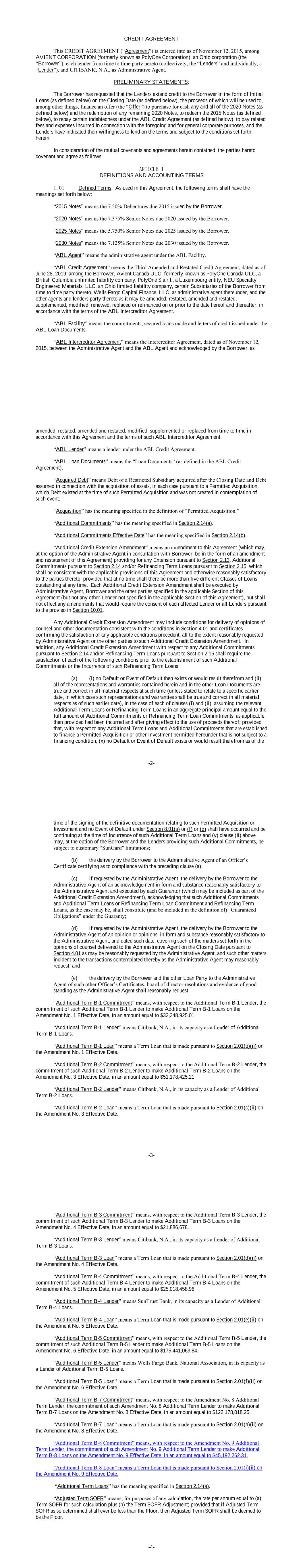 CREDIT AGREEMENT This CREDIT AGREEMENT (“Agreement”) is entered into as of November 12, 2015, among AVIENT CORPORATION (formerly known as PolyOne Corporation), an Ohio corporation (the “Borrower”), each lender from time to time party hereto (collectively, the “Lenders” and individually, a “Lender”), and CITIBANK, N.A., as Administrative Agent. PRELIMINARY STATEMENTS: The Borrower has requested that the Lenders extend credit to the Borrower in the form of Initial Loans (as defined below) on the Closing Date (as defined below), the proceeds of which will be used to, among other things, finance an offer (the “Offer”) to purchase for cash any and all of the 2020 Notes (as defined below) and the redemption of any remaining 2020 Notes, to redeem the 2015 Notes (as defined below), to repay certain indebtedness under the ABL Credit Agreement (as defined below), to pay related fees and expenses incurred in connection with the foregoing and for general corporate purposes, and the Lenders have indicated their willingness to lend on the terms and subject to the conditions set forth herein. In consideration of the mutual covenants and agreements herein contained, the parties hereto covenant and agree as follows: ARTICLE I DEFINITIONS AND ACCOUNTING TERMS 1.01 Defined Terms. As used in this Agreement, the following terms shall have the meanings set forth below: “2015 Notes” means the 7.50% Debentures due 2015 issued by the Borrower. “2020 Notes” means the 7.375% Senior Notes due 2020 issued by the Borrower. “2025 Notes” means the 5.750% Senior Notes due 2025 issued by the Borrower. “2030 Notes” means the 7.125% Senior Notes due 2030 issued by the Borrower. “ABL Agent” means the administrative agent under the ABL Facility. “ABL Credit Agreement” means the Third Amended and Restated Credit Agreement, dated as of June 28, 2019, among the Borrower, Avient Canada ULC, formerly known as PolyOne Canada ULC, a British Columbia unlimited liability company, PolyOne S.a.r.l., a Luxembourg entity, NEU Specialty Engineered Materials, LLC, an Ohio limited liability company, certain Subsidiaries of the Borrower from time to time party thereto, Wells Fargo Capital Finance, LLC, as administrative agent thereunder, and the other agents and lenders party thereto as it may be amended, restated, amended and restated, supplemented, modified, renewed, replaced or refinanced on or prior to the date hereof and thereafter, in accordance with the terms of the ABL Intercreditor Agreement. “ABL Facility” means the commitments, secured loans made and letters of credit issued under the ABL Loan Documents. “ABL Intercreditor Agreement” means the Intercreditor Agreement, dated as of November 12, 2015, between the Administrative Agent and the ABL Agent and acknowledged by the Borrower, as -2- amended, restated, amended and restated, modified, supplemented or replaced from time to time in accordance with this Agreement and the terms of such ABL Intercreditor Agreement. “ABL Lender” means a lender under the ABL Credit Agreement. “ABL Loan Documents” means the “Loan Documents” (as defined in the ABL Credit Agreement). “Acquired Debt” means Debt of a Restricted Subsidiary acquired after the Closing Date and Debt assumed in connection with the acquisition of assets, in each case pursuant to a Permitted Acquisition, which Debt existed at the time of such Permitted Acquisition and was not created in contemplation of such event. “Acquisition” has the meaning specified in the definition of “Permitted Acquisition.” “Additional Commitments” has the meaning specified in Section 2.14(a). “Additional Commitments Effective Date” has the meaning specified in Section 2.14(b). “Additional Credit Extension Amendment” means an amendment to this Agreement (which may, at the option of the Administrative Agent in consultation with Borrower, be in the form of an amendment and restatement of this Agreement) providing for any Extension pursuant to Section 2.13, Additional Commitments pursuant to Section 2.14 and/or Refinancing Term Loans pursuant to Section 2.15, which shall be consistent with the applicable provisions of this Agreement and otherwise reasonably satisfactory to the parties thereto; provided that at no time shall there be more than five different Classes of Loans outstanding at any time. Each Additional Credit Extension Amendment shall be executed by Administrative Agent, Borrower and the other parties specified in the applicable Section of this Agreement (but not any other Lender not specified in the applicable Section of this Agreement), but shall not effect any amendments that would require the consent of each affected Lender or all Lenders pursuant to the proviso in Section 10.01. Any Additional Credit Extension Amendment may include conditions for delivery of opinions of counsel and other documentation consistent with the conditions in Section 4.01 and certificates confirming the satisfaction of any applicable conditions precedent, all to the extent reasonably requested by Administrative Agent or the other parties to such Additional Credit Extension Amendment. In addition, any Additional Credit Extension Amendment with respect to any Additional Commitments pursuant to Section 2.14 and/or Refinancing Term Loans pursuant to Section 2.15 shall require the satisfaction of each of the following conditions prior to the establishment of such Additional Commitments or the Incurrence of such Refinancing Term Loans: (a) (i) no Default or Event of Default then exists or would result therefrom and (ii) all of the representations and warranties contained herein and in the other Loan Documents are true and correct in all material respects at such time (unless stated to relate to a specific earlier date, in which case such representations and warranties shall be true and correct in all material respects as of such earlier date), in the case of each of clauses (i) and (