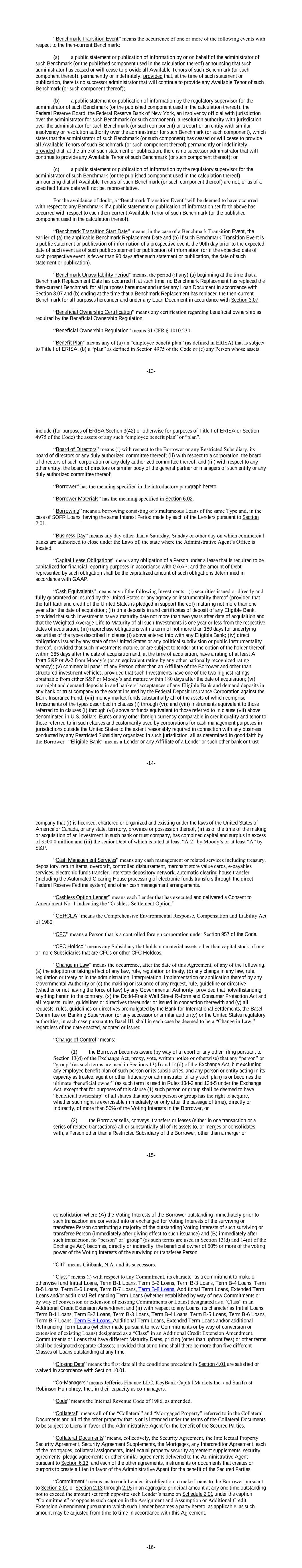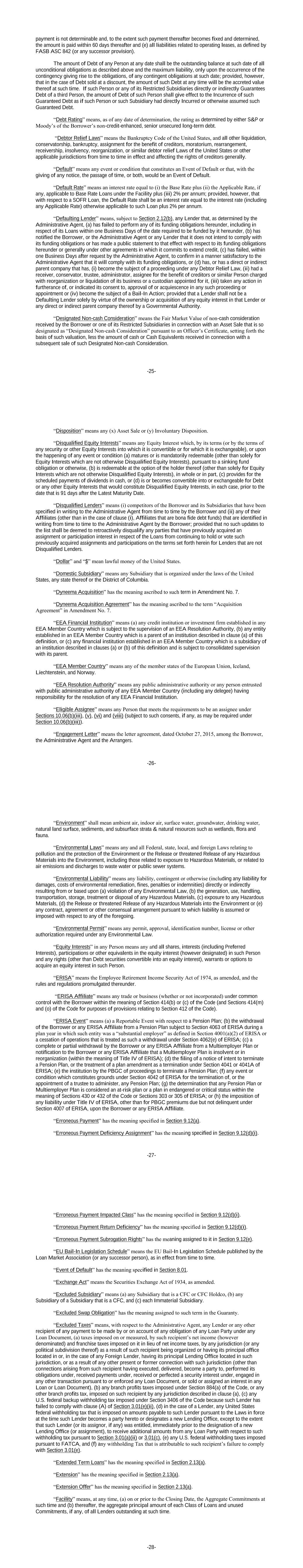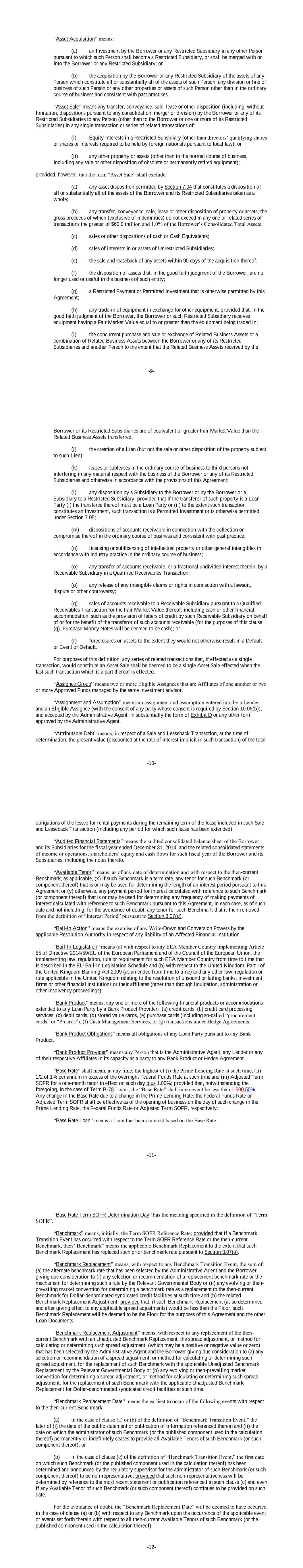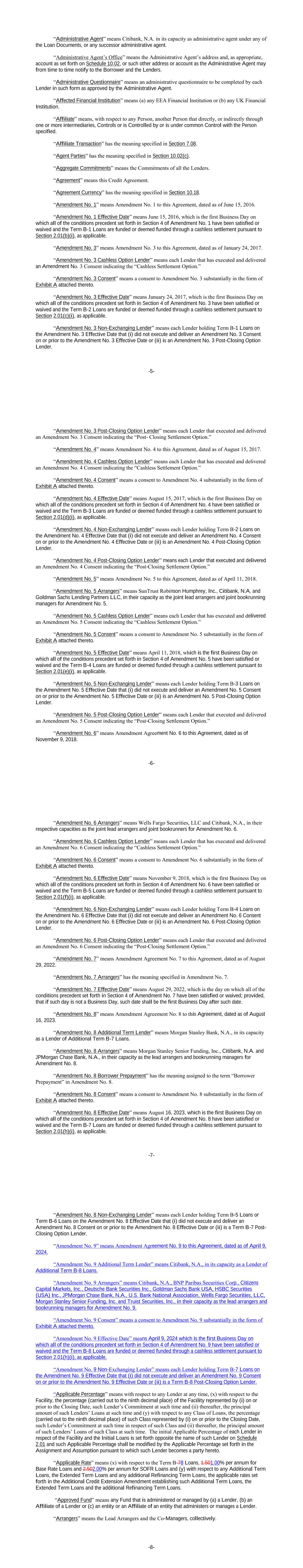 -5- “Administrative Agent” means Citibank, N.A. in its capacity as administrative agent under any of the Loan Documents, or any successor administrative agent. “Administrative Agent’s Office” means the Administrative Agent’s address and, as appropriate, account as set forth on Schedule 10.02, or such other address or account as the Administrative Agent may from time to time notify to the Borrower and the Lenders. “Administrative Questionnaire” means an administrative questionnaire to be completed by each Lender in such form as approved by the Administrative Agent. “Affected Financial Institution” means (a) any EEA Financial Institution or (b) any UK Financial Institution. “Affiliate” means, with respect to any Person, another Person that directly, or indirectly through one or more intermediaries, Controls or is Controlled by or is under common Control with the Person specified. “Affiliate Transaction” has the meaning specified in Section 7.08. “Agent Parties” has the meaning specified in Section 10.02(c). “Aggregate Commitments” means the Commitments of all the Lenders. “Agreement” means this Credit Agreement. “Agreement Currency” has the meaning specified in Section 10.18. “Amendment No. 1” means Amendment No. 1 to this Agreement, dated as of June 15, 2016. “Amendment No. 1 Effective Date” means June 15, 2016, which is the first Business Day on which all of the conditions precedent set forth in Section 4 of Amendment No. 1 have been satisfied or waived and the Term B-1 Loans are funded or deemed funded through a cashless settlement pursuant to Section 2.01(b)(i), as applicable. “Amendment No. 3” means Amendment No. 3 to this Agreement, dated as of January 24, 2017. “Amendment No. 3 Cashless Option Lender” means each Lender that has executed and delivered an Amendment No. 3 Consent indicating the “Cashless Settlement Option.” “Amendment No. 3 Consent” means a consent to Amendment No. 3 substantially in the form of Exhibit A attached thereto. “Amendment No. 3 Effective Date” means January 24, 2017, which is the first Business Day on which all of the conditions precedent set forth in Section 4 of Amendment No. 3 have been satisfied or waived and the Term B-2 Loans are funded or deemed funded through a cashless settlement pursuant to Section 2.01(c)(i), as applicable. “Amendment No. 3 Non-Exchanging Lender” means each Lender holding Term B-1 Loans on the Amendment No. 3 Effective Date that (i) did not execute and deliver an Amendment No. 3 Consent on or prior to the Amendment No. 3 Effective Date or (ii) is an Amendment No. 3 Post-Closing Option Lender. -6- “Amendment No. 3 Post-Closing Option Lender” means each Lender that executed and delivered an Amendment No. 3 Consent indicating the “Post- Closing Settlement Option.” “Amendment No. 4” means Amendment No. 4 to this Agreement, dated as of August 15, 2017. “Amendment No. 4 Cashless Option Lender” means each Lender that has executed and delivered an Amendment No. 4 Consent indicating the “Cashless Settlement Option.” “Amendment No. 4 Consent” means a consent to Amendment No. 4 substantially in the form of Exhibit A attached thereto. “Amendment No. 4 Effective Date” means August 15, 2017, which is the first Business Day on which all of the conditions precedent set forth in Section 4 of Amendment No. 4 have been satisfied or waived and the Term B-3 Loans are funded or deemed funded through a cashless settlement pursuant to Section 2.01(d)(i), as applicable. “Amendment No. 4 Non-Exchanging Lender” means each Lender holding Term B-2 Loans on the Amendment No. 4 Effective Date that (i) did not execute and deliver an Amendment No. 4 Consent on or prior to the Amendment No. 4 Effective Date or (ii) is an Amendment No. 4 Post-Closing Option Lender. “Amendment No. 4 Post-Closing Option Lender” means each Lender that executed and delivered an Amendment No. 4 Consent indicating the “Post-Closing Settlement Option.” “Amendment No. 5” means Amendment No. 5 to this Agreement, dated as of April 11, 2018. “Amendment No. 5 Arrangers” means SunTrust Robinson Humphrey, Inc., Citibank, N.A. and Goldman Sachs Lending Partners LLC, in their capacity as the joint lead arrangers and joint bookrunning managers for Amendment No. 5. “Amendment No. 5 Cashless Option Lender” means each Lender that has executed and delivered an Amendment No. 5 Consent indicating the “Cashless Settlement Option.” “Amendment No. 5 Consent” means a consent to Amendment No. 5 substantially in the form of Exhibit A attached thereto. “Amendment No. 5 Effective Date” means April 11, 2018, which is the first Business Day on which all of the conditions precedent set forth in Section 4 of Amendment No. 5 have been satisfied or waived and the Term B-4 Loans are funded or deemed funded through a cashless settlement pursuant to Section 2.01(e)(i), as applicable. “Amendment No. 5 Non-Exchanging Lender” means each Lender holding Term B-3 Loans on the Amendment No. 5 Effective Date that (i) did not execute and deliver an Amendment No. 5 Consent on or prior to the Amendment No. 5 Effective Date or (ii) is an Amendment No. 5 Post-Closing Option Lender. “Amendment No. 5 Post-Closing Option Lender” means each Lender that executed and delivered an Amendment No. 5 Consent indicating the “Post-Closing Settlement Option.” “Amendment No. 6” means Amendment Agreement No. 6 to this Agreement, dated as of November 9, 2018. -7- “Amendment No. 6 Arrangers” means Wells Fargo Securities, LLC and Citibank, N.A., in their respective capacities as the joint lead arrangers and joint bookrunners for Amendment No. 6. “Amendment No. 6 Cashless Option Lender” means each Lender that has executed and delivered an Amendment No. 6 Consent indicating the “Cashless Settlement Option.” “Amendment No. 6 Consent” means a consent to Amendment No. 6 substantially in 