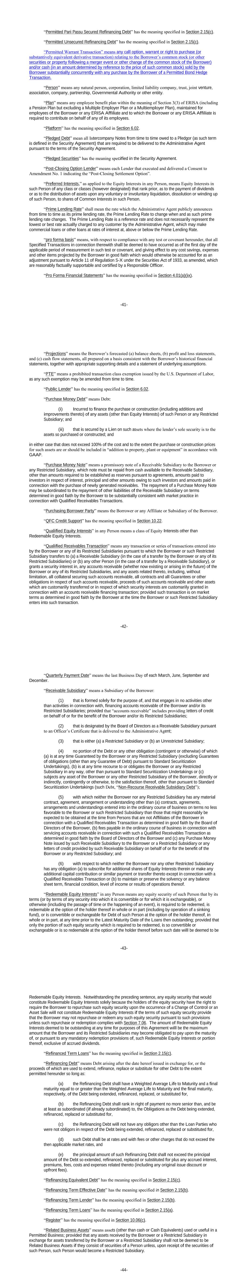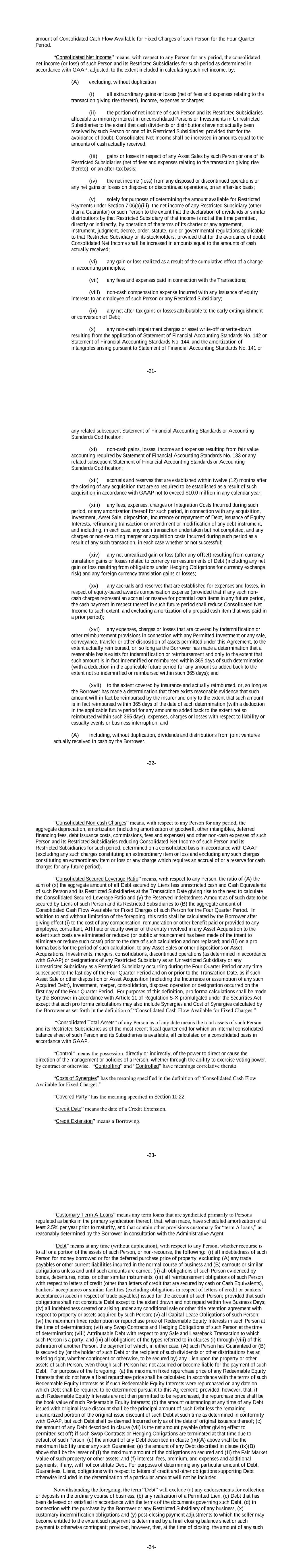 -41- “Permitted Pari Passu Secured Refinancing Debt” has the meaning specified in Section 2.15(c). “Permitted Unsecured Refinancing Debt” has the meaning specified in Section 2.15(c). “Permitted Warrant Transaction” means any call option, warrant or right to purchase (or substantively equivalent derivative transaction) relating to the Borrower’s common stock (or other securities or property following a merger event or other change of the common stock of the Borrower) and/or cash (in an amount determined by reference to the price of such common stock) sold by the Borrower substantially concurrently with any purchase by the Borrower of a Permitted Bond Hedge Transaction. “Person” means any natural person, corporation, limited liability company, trust, joint venture, association, company, partnership, Governmental Authority or other entity. “Plan” means any employee benefit plan within the meaning of Section 3(3) of ERISA (including a Pension Plan but excluding a Multiple Employer Plan or a Multiemployer Plan), maintained for employees of the Borrower or any ERISA Affiliate and to which the Borrower or any ERISA Affiliate is required to contribute on behalf of any of its employees. “Platform” has the meaning specified in Section 6.02. “Pledged Debt” mean all Intercompany Notes from time to time owed to a Pledgor (as such term is defined in the Security Agreement) that are required to be delivered to the Administrative Agent pursuant to the terms of the Security Agreement. “Pledged Securities” has the meaning specified in the Security Agreement. “Post-Closing Option Lender” means each Lender that executed and delivered a Consent to Amendment No. 1 indicating the “Post-Closing Settlement Option”. “Preferred Interests,” as applied to the Equity Interests in any Person, means Equity Interests in such Person of any class or classes (however designated) that rank prior, as to the payment of dividends or as to the distribution of assets upon any voluntary or involuntary liquidation, dissolution or winding up of such Person, to shares of Common Interests in such Person. “Prime Lending Rate” shall mean the rate which the Administrative Agent publicly announces from time to time as its prime lending rate, the Prime Lending Rate to change when and as such prime lending rate changes. The Prime Lending Rate is a reference rate and does not necessarily represent the lowest or best rate actually charged to any customer by the Administrative Agent, which may make commercial loans or other loans at rates of interest at, above or below the Prime Lending Rate. “pro forma basis” means, with respect to compliance with any test or covenant hereunder, that all Specified Transactions in connection therewith shall be deemed to have occurred as of the first day of the applicable period of measurement in such test or covenant, and giving effect to any cost savings, expenses and other items projected by the Borrower in good faith which would otherwise be accounted for as an adjustment pursuant to Article 11 of Regulation S-X under the Securities Act of 1933, as amended, which are reasonably factually supportable and certified by a Responsible Officer. “Pro Forma Financial Statements” has the meaning specified in Section 4.01(a)(ix). -42- “Projections” means the Borrower’s forecasted (a) balance sheets, (b) profit and loss statements, and (c) cash flow statements, all prepared on a basis consistent with the Borrower’s historical financial statements, together with appropriate supporting details and a statement of underlying assumptions. “PTE” means a prohibited transaction class exemption issued by the U.S. Department of Labor, as any such exemption may be amended from time to time. “Public Lender” has the meaning specified in Section 6.02. “Purchase Money Debt” means Debt: (i) Incurred to finance the purchase or construction (including additions and improvements thereto) of any assets (other than Equity Interests) of such Person or any Restricted Subsidiary; and (ii) that is secured by a Lien on such assets where the lender’s sole security is to the assets so purchased or constructed; and in either case that does not exceed 100% of the cost and to the extent the purchase or construction prices for such assets are or should be included in “addition to property, plant or equipment” in accordance with GAAP. “Purchase Money Note” means a promissory note of a Receivable Subsidiary to the Borrower or any Restricted Subsidiary, which note must be repaid from cash available to the Receivable Subsidiary, other than amounts required to be established as reserves pursuant to agreements, amounts paid to investors in respect of interest, principal and other amounts owing to such investors and amounts paid in connection with the purchase of newly generated receivables. The repayment of a Purchase Money Note may be subordinated to the repayment of other liabilities of the Receivable Subsidiary on terms determined in good faith by the Borrower to be substantially consistent with market practice in connection with Qualified Receivables Transactions. “Purchasing Borrower Party” means the Borrower or any Affiliate or Subsidiary of the Borrower. “QFC Credit Support” has the meaning specified in Section 10.22. “Qualified Equity Interests” in any Person means a class of Equity Interests other than Redeemable Equity Interests. “Qualified Receivables Transaction” means any transaction or series of transactions entered into by the Borrower or any of its Restricted Subsidiaries pursuant to which the Borrower or such Restricted Subsidiary transfers to (a) a Receivable Subsidiary (in the case of a transfer by the Borrower or any of its Restricted Subsidiaries) or (b) any other Person (in the case of a transfer by a Receivable Subsidiary), or grants a security interest in, any accounts receivable (whether now existing or arising in the future) 