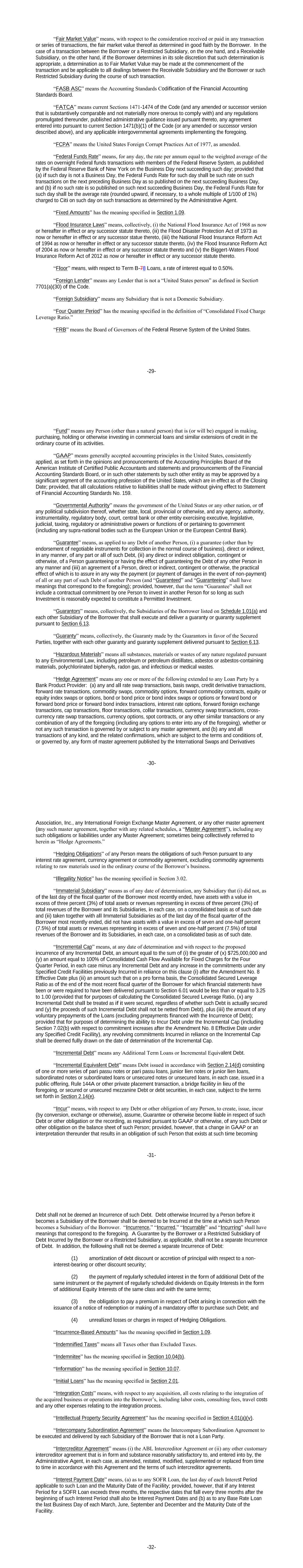 -29- “Fair Market Value” means, with respect to the consideration received or paid in any transaction or series of transactions, the fair market value thereof as determined in good faith by the Borrower. In the case of a transaction between the Borrower or a Restricted Subsidiary, on the one hand, and a Receivable Subsidiary, on the other hand, if the Borrower determines in its sole discretion that such determination is appropriate, a determination as to Fair Market Value may be made at the commencement of the transaction and be applicable to all dealings between the Receivable Subsidiary and the Borrower or such Restricted Subsidiary during the course of such transaction. “FASB ASC” means the Accounting Standards Codification of the Financial Accounting Standards Board. “FATCA” means current Sections 1471-1474 of the Code (and any amended or successor version that is substantively comparable and not materially more onerous to comply with) and any regulations promulgated thereunder, published administrative guidance issued pursuant thereto, any agreement entered into pursuant to current Section 1471(b)(1) of the Code (or any amended or successor version described above), and any applicable intergovernmental agreements implementing the foregoing. “FCPA” means the United States Foreign Corrupt Practices Act of 1977, as amended. “Federal Funds Rate” means, for any day, the rate per annum equal to the weighted average of the rates on overnight Federal funds transactions with members of the Federal Reserve System, as published by the Federal Reserve Bank of New York on the Business Day next succeeding such day; provided that (a) if such day is not a Business Day, the Federal Funds Rate for such day shall be such rate on such transactions on the next preceding Business Day as so published on the next succeeding Business Day, and (b) if no such rate is so published on such next succeeding Business Day, the Federal Funds Rate for such day shall be the average rate (rounded upward, if necessary, to a whole multiple of 1/100 of 1%) charged to Citi on such day on such transactions as determined by the Administrative Agent. “Fixed Amounts” has the meaning specified in Section 1.09. “Flood Insurance Laws” means, collectively, (i) the National Flood Insurance Act of 1968 as now or hereafter in effect or any successor statute thereto, (ii) the Flood Disaster Protection Act of 1973 as now or hereafter in effect or any successor statue thereto, (iii) the National Flood Insurance Reform Act of 1994 as now or hereafter in effect or any successor statute thereto, (iv) the Flood Insurance Reform Act of 2004 as now or hereafter in effect or any successor statute thereto and (v) the Biggert-Waters Flood Insurance Reform Act of 2012 as now or hereafter in effect or any successor statute thereto. “Floor” means, with respect to Term B-78 Loans, a rate of interest equal to 0.50%. “Foreign Lender” means any Lender that is not a “United States person” as defined in Section 7701(a)(30) of the Code. “Foreign Subsidiary” means any Subsidiary that is not a Domestic Subsidiary. “Four Quarter Period” has the meaning specified in the definition of “Consolidated Fixed Charge Leverage Ratio.” “FRB” means the Board of Governors of the Federal Reserve System of the United States. -30- “Fund” means any Person (other than a natural person) that is (or will be) engaged in making, purchasing, holding or otherwise investing in commercial loans and similar extensions of credit in the ordinary course of its activities. “GAAP” means generally accepted accounting principles in the United States, consistently applied, as set forth in the opinions and pronouncements of the Accounting Principles Board of the American Institute of Certified Public Accountants and statements and pronouncements of the Financial Accounting Standards Board, or in such other statements by such other entity as may be approved by a significant segment of the accounting profession of the United States, which are in effect as of the Closing Date; provided, that all calculations relative to liabilities shall be made without giving effect to Statement of Financial Accounting Standards No. 159. “Governmental Authority” means the government of the United States or any other nation, or of any political subdivision thereof, whether state, local, provincial or otherwise, and any agency, authority, instrumentality, regulatory body, court, central bank or other entity exercising executive, legislative, judicial, taxing, regulatory or administrative powers or functions of or pertaining to government (including any supra-national bodies such as the European Union or the European Central Bank). “Guarantee” means, as applied to any Debt of another Person, (i) a guarantee (other than by endorsement of negotiable instruments for collection in the normal course of business), direct or indirect, in any manner, of any part or all of such Debt, (ii) any direct or indirect obligation, contingent or otherwise, of a Person guaranteeing or having the effect of guaranteeing the Debt of any other Person in any manner and (iii) an agreement of a Person, direct or indirect, contingent or otherwise, the practical effect of which is to assure in any way the payment (or payment of damages in the event of non-payment) of all or any part of such Debt of another Person (and “Guaranteed” and “Guaranteeing” shall have meanings that correspond to the foregoing); provided, however, that the term “Guarantee” shall not include a contractual commitment by one Person to invest in another Person for so long as such Investment is reasonably expected to constitute a Permitted Investment. “Guarantors” means, collectively, the Subsidiaries of the Borrower listed on Schedule 1.01(a) and each other Subsidiary of the Borrower that shall execute and deliver a guaranty or guaranty supplement pursuant to Section 6.13. “Guaranty