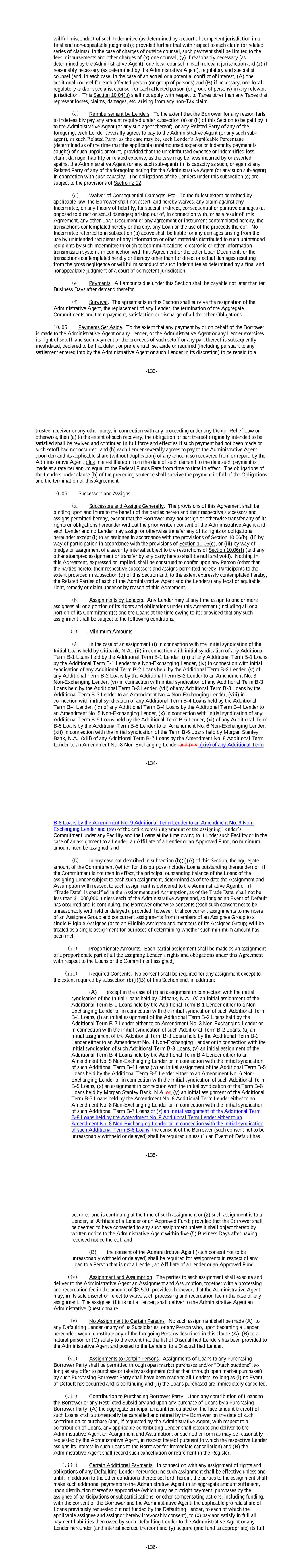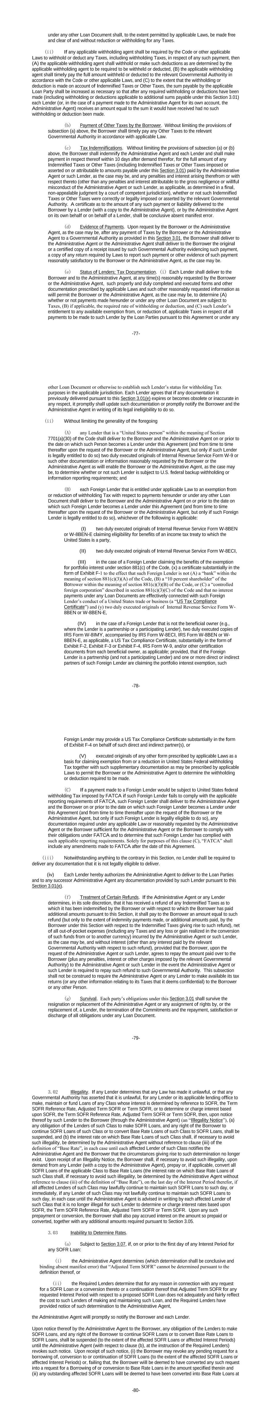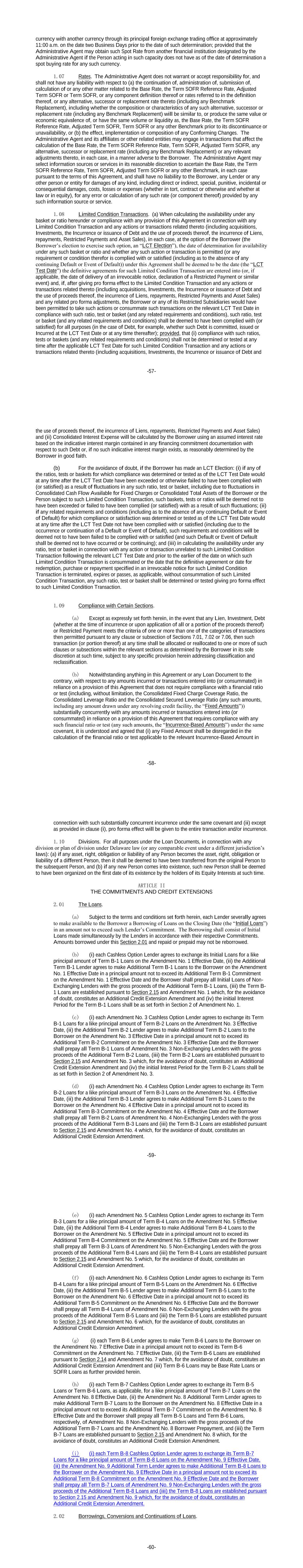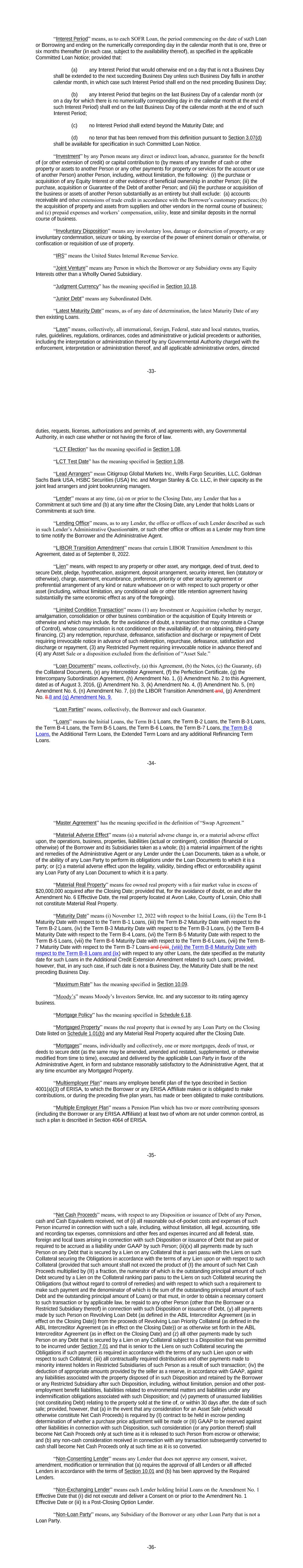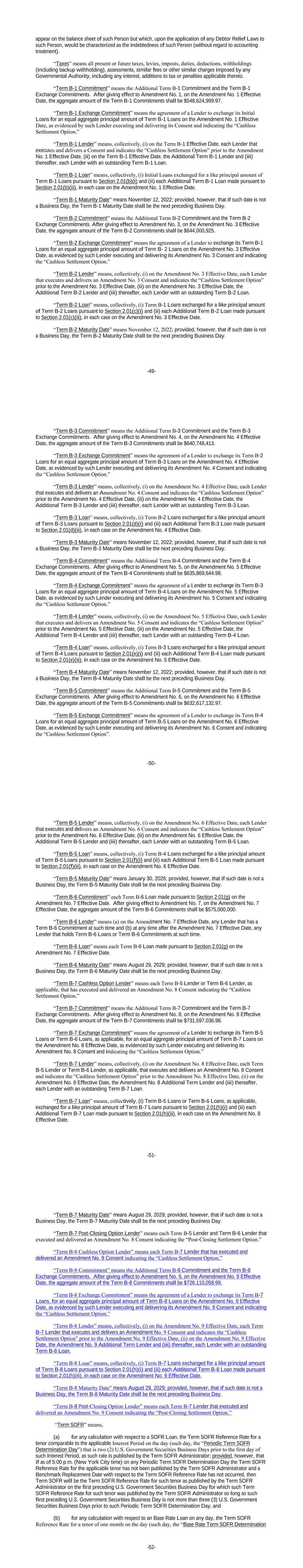 -49- appear on the balance sheet of such Person but which, upon the application of any Debtor Relief Laws to such Person, would be characterized as the indebtedness of such Person (without regard to accounting treatment). “Taxes” means all present or future taxes, levies, imposts, duties, deductions, withholdings (including backup withholding), assessments, similar fees or other similar charges imposed by any Governmental Authority, including any interest, additions to tax or penalties applicable thereto. “Term B-1 Commitment” means the Additional Term B-1 Commitment and the Term B-1 Exchange Commitments. After giving effect to Amendment No. 1, on the Amendment No. 1 Effective Date, the aggregate amount of the Term B-1 Commitments shall be $548,624,999.97. “Term B-1 Exchange Commitment” means the agreement of a Lender to exchange its Initial Loans for an equal aggregate principal amount of Term B-1 Loans on the Amendment No. 1 Effective Date, as evidenced by such Lender executing and delivering its Consent and indicating the “Cashless Settlement Option.” “Term B-1 Lender” means, collectively, (i) on the Term B-1 Effective Date, each Lender that executes and delivers a Consent and indicates the “Cashless Settlement Option” prior to the Amendment No. 1 Effective Date, (ii) on the Term B-1 Effective Date, the Additional Term B-1 Lender and (iii) thereafter, each Lender with an outstanding Term B-1 Loan. “Term B-1 Loan” means, collectively, (i) Initial Loans exchanged for a like principal amount of Term B-1 Loans pursuant to Section 2.01(b)(i) and (ii) each Additional Term B-1 Loan made pursuant to Section 2.01(b)(ii), in each case on the Amendment No. 1 Effective Date. “Term B-1 Maturity Date” means November 12, 2022; provided, however, that if such date is not a Business Day, the Term B-1 Maturity Date shall be the next preceding Business Day. “Term B-2 Commitment” means the Additional Term B-2 Commitment and the Term B-2 Exchange Commitments. After giving effect to Amendment No. 3, on the Amendment No. 3 Effective Date, the aggregate amount of the Term B-2 Commitments shall be $644,000,925. “Term B-2 Exchange Commitment” means the agreement of a Lender to exchange its Term B-1 Loans for an equal aggregate principal amount of Term B- 2 Loans on the Amendment No. 3 Effective Date, as evidenced by such Lender executing and delivering its Amendment No. 3 Consent and indicating the “Cashless Settlement Option.” “Term B-2 Lender” means, collectively, (i) on the Amendment No. 3 Effective Date, each Lender that executes and delivers an Amendment No. 3 Consent and indicates the “Cashless Settlement Option” prior to the Amendment No. 3 Effective Date, (ii) on the Amendment No. 3 Effective Date, the Additional Term B-2 Lender and (iii) thereafter, each Lender with an outstanding Term B-2 Loan. “Term B-2 Loan” means, collectively, (i) Term B-1 Loans exchanged for a like principal amount of Term B-2 Loans pursuant to Section 2.01(c)(i) and (ii) each Additional Term B-2 Loan made pursuant to Section 2.01(c)(ii), in each case on the Amendment No. 3 Effective Date. “Term B-2 Maturity Date” means November 12, 2022; provided, however, that if such date is not a Business Day, the Term B-2 Maturity Date shall be the next preceding Business Day. -50- “Term B-3 Commitment” means the Additional Term B-3 Commitment and the Term B-3 Exchange Commitments. After giving effect to Amendment No. 4, on the Amendment No. 4 Effective Date, the aggregate amount of the Term B-3 Commitments shall be $640,748,413. “Term B-3 Exchange Commitment” means the agreement of a Lender to exchange its Term B-2 Loans for an equal aggregate principal amount of Term B-3 Loans on the Amendment No. 4 Effective Date, as evidenced by such Lender executing and delivering its Amendment No. 4 Consent and indicating the “Cashless Settlement Option.” “Term B-3 Lender” means, collectively, (i) on the Amendment No. 4 Effective Date, each Lender that executes and delivers an Amendment No. 4 Consent and indicates the “Cashless Settlement Option” prior to the Amendment No. 4 Effective Date, (ii) on the Amendment No. 4 Effective Date, the Additional Term B-3 Lender and (iii) thereafter, each Lender with an outstanding Term B-3 Loan. “Term B-3 Loan” means, collectively, (i) Term B-2 Loans exchanged for a like principal amount of Term B-3 Loans pursuant to Section 2.01(d)(i) and (ii) each Additional Term B-3 Loan made pursuant to Section 2.01(d)(ii), in each case on the Amendment No. 4 Effective Date. “Term B-3 Maturity Date” means November 12, 2022; provided, however, that if such date is not a Business Day, the Term B-3 Maturity Date shall be the next preceding Business Day. “Term B-4 Commitment” means the Additional Term B-4 Commitment and the Term B-4 Exchange Commitments. After giving effect to Amendment No. 5, on the Amendment No. 5 Effective Date, the aggregate amount of the Term B-4 Commitments shall be $635,869,644.98. “Term B-4 Exchange Commitment” means the agreement of a Lender to exchange its Term B-3 Loans for an equal aggregate principal amount of Term B-4 Loans on the Amendment No. 5 Effective Date, as evidenced by such Lender executing and delivering its Amendment No. 5 Consent and indicating the “Cashless Settlement Option.” “Term B-4 Lender” means, collectively, (i) on the Amendment No. 5 Effective Date, each Lender that executes and delivers an Amendment No. 5 Consent and indicates the “Cashless Settlement Option” prior to the Amendment No. 5 Effective Date, (ii) on the Amendment No. 5 Effective Date, the Additional Term B-4 Lender and (iii) thereafter, each Lender with an outstanding Term B-4 Loan. “Term B-4 Loan” means, collectively, (i) Term B-3 Loans exchanged for a like principal amount of Term B-4 Loans pursuant to Section 2.01(e)(i) and (ii) each Additional Term B-4 Loan made pursuant to Section 2.01(e)(ii), in each c