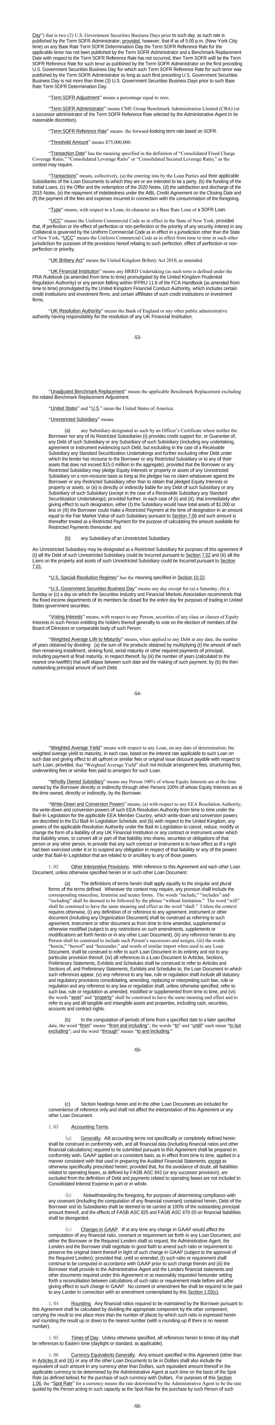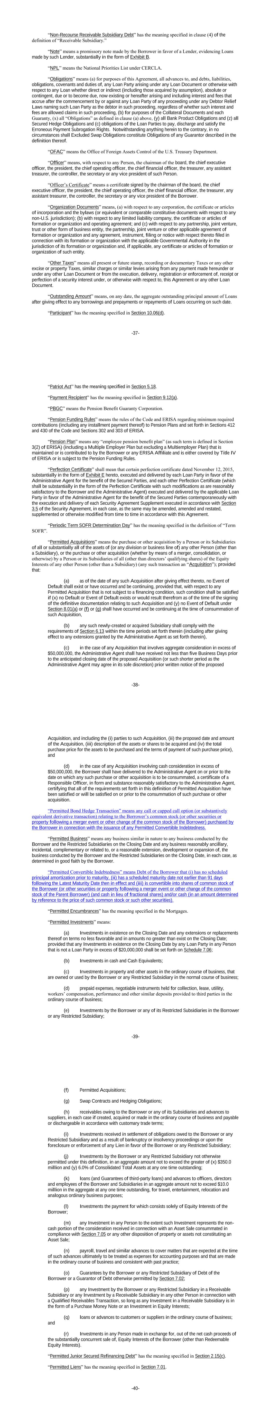 -53- Day”) that is two (2) U.S. Government Securities Business Days prior to such day, as such rate is published by the Term SOFR Administrator; provided, however, that if as of 5:00 p.m. (New York City time) on any Base Rate Term SOFR Determination Day the Term SOFR Reference Rate for the applicable tenor has not been published by the Term SOFR Administrator and a Benchmark Replacement Date with respect to the Term SOFR Reference Rate has not occurred, then Term SOFR will be the Term SOFR Reference Rate for such tenor as published by the Term SOFR Administrator on the first preceding U.S. Government Securities Business Day for which such Term SOFR Reference Rate for such tenor was published by the Term SOFR Administrator so long as such first preceding U.S. Government Securities Business Day is not more than three (3) U.S. Government Securities Business Days prior to such Base Rate Term SOFR Determination Day. “Term SOFR Adjustment” means a percentage equal to zero. “Term SOFR Administrator” means CME Group Benchmark Administration Limited (CBA) (or a successor administrator of the Term SOFR Reference Rate selected by the Administrative Agent in its reasonable discretion). “Term SOFR Reference Rate” means the forward-looking term rate based on SOFR. “Threshold Amount” means $75,000,000. “Transaction Date” has the meaning specified in the definition of “Consolidated Fixed Charge Coverage Ratio,” “Consolidated Leverage Ratio” or “Consolidated Secured Leverage Ratio,” as the context may require. “Transactions” means, collectively, (a) the entering into by the Loan Parties and their applicable Subsidiaries of the Loan Documents to which they are or are intended to be a party, (b) the funding of the Initial Loans, (c) the Offer and the redemption of the 2020 Notes, (d) the satisfaction and discharge of the 2015 Notes, (e) the repayment of indebtedness under the ABL Credit Agreement on the Closing Date and (f) the payment of the fees and expenses incurred in connection with the consummation of the foregoing. “Type” means, with respect to a Loan, its character as a Base Rate Loan or a SOFR Loan. “UCC” means the Uniform Commercial Code as in effect in the State of New York; provided that, if perfection or the effect of perfection or non-perfection or the priority of any security interest in any Collateral is governed by the Uniform Commercial Code as in effect in a jurisdiction other than the State of New York, “UCC” means the Uniform Commercial Code as in effect from time to time in such other jurisdiction for purposes of the provisions hereof relating to such perfection, effect of perfection or non- perfection or priority. “UK Bribery Act” means the United Kingdom Bribery Act 2010, as amended. “UK Financial Institution” means any BRRD Undertaking (as such term is defined under the PRA Rulebook (as amended from time to time) promulgated by the United Kingdom Prudential Regulation Authority) or any person falling within IFPRU 11.6 of the FCA Handbook (as amended from time to time) promulgated by the United Kingdom Financial Conduct Authority, which includes certain credit institutions and investment firms, and certain affiliates of such credit institutions or investment firms. “UK Resolution Authority” means the Bank of England or any other public administrative authority having responsibility for the resolution of any UK Financial Institution. -54- “Unadjusted Benchmark Replacement” means the applicable Benchmark Replacement excluding the related Benchmark Replacement Adjustment. “United States” and “U.S.” mean the United States of America. “Unrestricted Subsidiary” means (a) any Subsidiary designated as such by an Officer’s Certificate where neither the Borrower nor any of its Restricted Subsidiaries (i) provides credit support for, or Guarantee of, any Debt of such Subsidiary or any Subsidiary of such Subsidiary (including any undertaking, agreement or instrument evidencing such Debt, but excluding in the case of a Receivable Subsidiary any Standard Securitization Undertakings and further excluding other Debt under which the lender has recourse to the Borrower or any Restricted Subsidiary or to any of their assets that does not exceed $15.0 million in the aggregate), provided that the Borrower or any Restricted Subsidiary may pledge Equity Interests or property or assets of any Unrestricted Subsidiary on a non-recourse basis as long as the pledgee has no claim whatsoever against the Borrower or any Restricted Subsidiary other than to obtain that pledged Equity Interests or property or assets, or (ii) is directly or indirectly liable for any Debt of such Subsidiary or any Subsidiary of such Subsidiary (except in the case of a Receivable Subsidiary any Standard Securitization Undertakings); provided further, in each case of (i) and (ii), that immediately after giving effect to such designation, either (I) the Subsidiary would have total assets of $1,000 or less or (II) the Borrower could make a Restricted Payment at the time of designation in an amount equal to the Fair Market Value of such Subsidiary pursuant to Section 7.06 and such amount is thereafter treated as a Restricted Payment for the purpose of calculating the amount available for Restricted Payments thereunder, and (b) any Subsidiary of an Unrestricted Subsidiary. An Unrestricted Subsidiary may be designated as a Restricted Subsidiary for purposes of this agreement if (i) all the Debt of such Unrestricted Subsidiary could be Incurred pursuant to Section 7.02 and (ii) all the Liens on the property and assets of such Unrestricted Subsidiary could be Incurred pursuant to Section 7.01. “U.S. Special Resolution Regimes” has the meaning specified in Section 10.22. “U.S. Government Securities Business Day” means any day except for (a) a Saturday, (b) a Sunday or (c) a day on which the Securities Industry and Financial Markets Association recommends tha