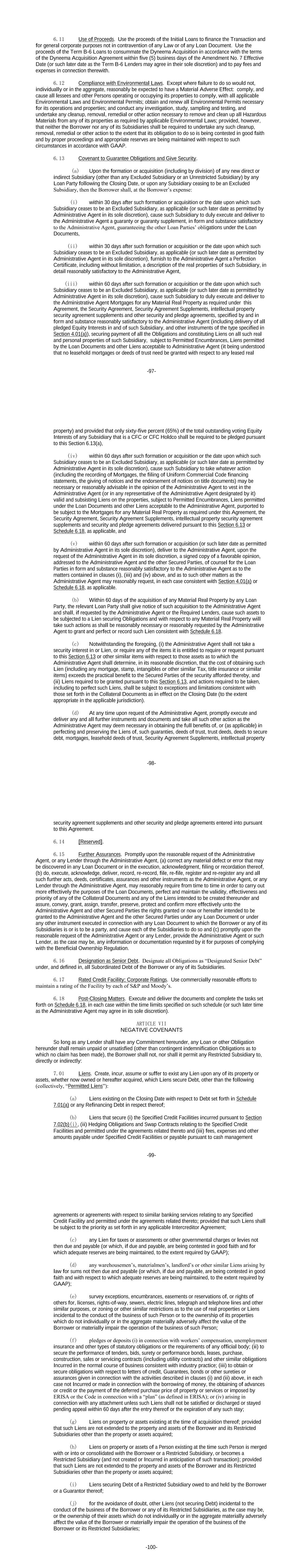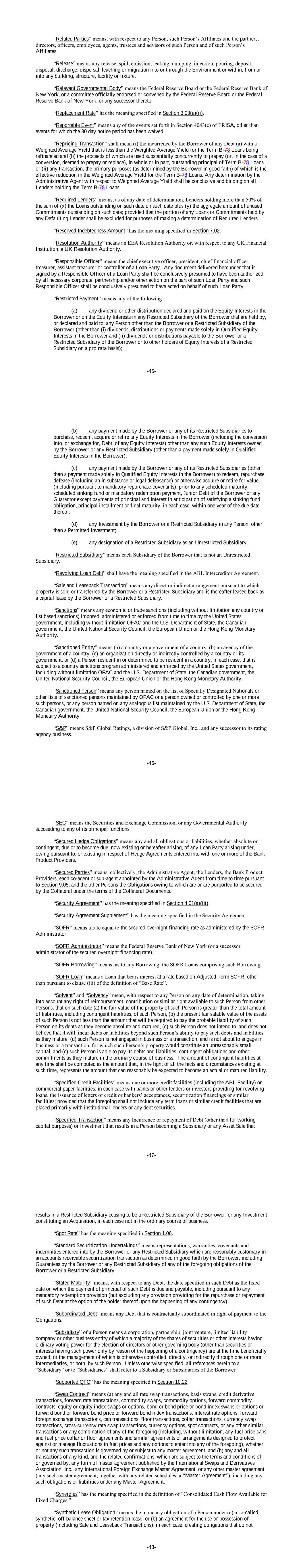 -45- “Related Parties” means, with respect to any Person, such Person’s Affiliates and the partners, directors, officers, employees, agents, trustees and advisors of such Person and of such Person’s Affiliates. “Release” means any release, spill, emission, leaking, dumping, injection, pouring, deposit, disposal, discharge, dispersal, leaching or migration into or through the Environment or within, from or into any building, structure, facility or fixture. “Relevant Governmental Body” means the Federal Reserve Board or the Federal Reserve Bank of New York, or a committee officially endorsed or convened by the Federal Reserve Board or the Federal Reserve Bank of New York, or any successor thereto. “Replacement Rate” has the meaning specified in Section 3.03(a)(ii). “Reportable Event” means any of the events set forth in Section 4043(c) of ERISA, other than events for which the 30 day notice period has been waived. “Repricing Transaction” shall mean (i) the incurrence by the Borrower of any Debt (a) with a Weighted Average Yield that is less than the Weighted Average Yield for the Term B-78 Loans being refinanced and (b) the proceeds of which are used substantially concurrently to prepay (or, in the case of a conversion, deemed to prepay or replace), in whole or in part, outstanding principal of Term B-78 Loans or (ii) any transaction, the primary purposes (as determined by the Borrower in good faith) of which is the effective reduction in the Weighted Average Yield for the Term B-78 Loans. Any determination by the Administrative Agent with respect to Weighted Average Yield shall be conclusive and binding on all Lenders holding the Term B-78 Loans. “Required Lenders” means, as of any date of determination, Lenders holding more than 50% of the sum of (x) the Loans outstanding on such date on such date plus (y) the aggregate amount of unused Commitments outstanding on such date; provided that the portion of any Loans or Commitments held by any Defaulting Lender shall be excluded for purposes of making a determination of Required Lenders. “Reserved Indebtedness Amount” has the meaning specified in Section 7.02. “Resolution Authority” means an EEA Resolution Authority or, with respect to any UK Financial Institution, a UK Resolution Authority. “Responsible Officer” means the chief executive officer, president, chief financial officer, treasurer, assistant treasurer or controller of a Loan Party. Any document delivered hereunder that is signed by a Responsible Officer of a Loan Party shall be conclusively presumed to have been authorized by all necessary corporate, partnership and/or other action on the part of such Loan Party and such Responsible Officer shall be conclusively presumed to have acted on behalf of such Loan Party. “Restricted Payment” means any of the following: (a) any dividend or other distribution declared and paid on the Equity Interests in the Borrower or on the Equity Interests in any Restricted Subsidiary of the Borrower that are held by, or declared and paid to, any Person other than the Borrower or a Restricted Subsidiary of the Borrower (other than (i) dividends, distributions or payments made solely in Qualified Equity Interests in the Borrower and (ii) dividends or distributions payable to the Borrower or a Restricted Subsidiary of the Borrower or to other holders of Equity Interests of a Restricted Subsidiary on a pro rata basis); -46- (b) any payment made by the Borrower or any of its Restricted Subsidiaries to purchase, redeem, acquire or retire any Equity Interests in the Borrower (including the conversion into, or exchange for, Debt, of any Equity Interests) other than any such Equity Interests owned by the Borrower or any Restricted Subsidiary (other than a payment made solely in Qualified Equity Interests in the Borrower); (c) any payment made by the Borrower or any of its Restricted Subsidiaries (other than a payment made solely in Qualified Equity Interests in the Borrower) to redeem, repurchase, defease (including an in substance or legal defeasance) or otherwise acquire or retire for value (including pursuant to mandatory repurchase covenants), prior to any scheduled maturity, scheduled sinking fund or mandatory redemption payment, Junior Debt of the Borrower or any Guarantor except payments of principal and interest in anticipation of satisfying a sinking fund obligation, principal installment or final maturity, in each case, within one year of the due date thereof; (d) any Investment by the Borrower or a Restricted Subsidiary in any Person, other than a Permitted Investment; (e) any designation of a Restricted Subsidiary as an Unrestricted Subsidiary. “Restricted Subsidiary” means each Subsidiary of the Borrower that is not an Unrestricted Subsidiary. “Revolving Loan Debt” shall have the meaning specified in the ABL Intercreditor Agreement. “Sale and Leaseback Transaction” means any direct or indirect arrangement pursuant to which property is sold or transferred by the Borrower or a Restricted Subsidiary and is thereafter leased back as a capital lease by the Borrower or a Restricted Subsidiary. “Sanctions” means any economic or trade sanctions (including without limitation any country or list based sanctions) imposed, administered or enforced from time to time by the United States government, including without limitation OFAC and the U.S. Department of State, the Canadian government, the United National Security Council, the European Union or the Hong Kong Monetary Authority. “Sanctioned Entity” means (a) a country or a government of a country, (b) an agency of the government of a country, (c) an organization directly or indirectly controlled by a country or its government, or (d) a Person resident in or determined to be resident in a country, in each case, that is subject to a country sanctions program administered and enforced by the United States government, including without limitatio