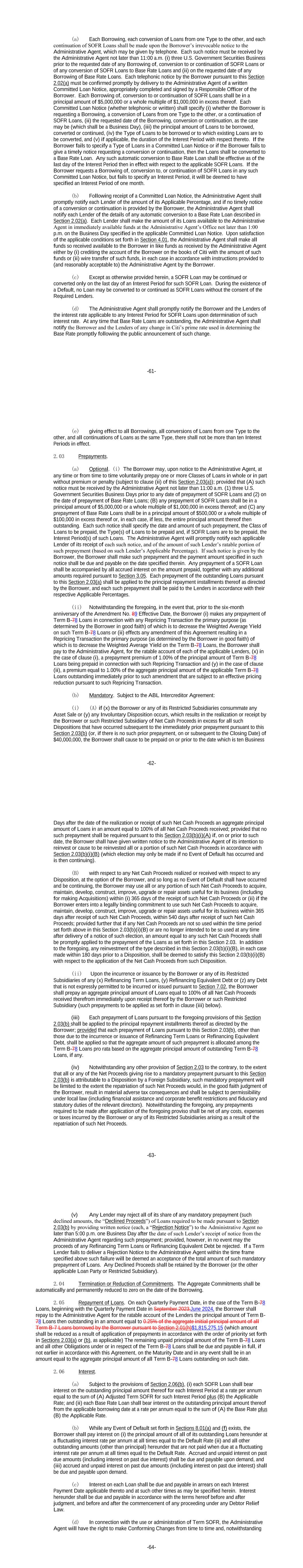 -61- (a) Each Borrowing, each conversion of Loans from one Type to the other, and each continuation of SOFR Loans shall be made upon the Borrower’s irrevocable notice to the Administrative Agent, which may be given by telephone. Each such notice must be received by the Administrative Agent not later than 11:00 a.m. (i) three U.S. Government Securities Business prior to the requested date of any Borrowing of, conversion to or continuation of SOFR Loans or of any conversion of SOFR Loans to Base Rate Loans and (ii) on the requested date of any Borrowing of Base Rate Loans. Each telephonic notice by the Borrower pursuant to this Section 2.02(a) must be confirmed promptly by delivery to the Administrative Agent of a written Committed Loan Notice, appropriately completed and signed by a Responsible Officer of the Borrower. Each Borrowing of, conversion to or continuation of SOFR Loans shall be in a principal amount of $5,000,000 or a whole multiple of $1,000,000 in excess thereof. Each Committed Loan Notice (whether telephonic or written) shall specify (i) whether the Borrower is requesting a Borrowing, a conversion of Loans from one Type to the other, or a continuation of SOFR Loans, (ii) the requested date of the Borrowing, conversion or continuation, as the case may be (which shall be a Business Day), (iii) the principal amount of Loans to be borrowed, converted or continued, (iv) the Type of Loans to be borrowed or to which existing Loans are to be converted, and (v) if applicable, the duration of the Interest Period with respect thereto. If the Borrower fails to specify a Type of Loans in a Committed Loan Notice or if the Borrower fails to give a timely notice requesting a conversion or continuation, then the Loans shall be converted to a Base Rate Loan. Any such automatic conversion to Base Rate Loan shall be effective as of the last day of the Interest Period then in effect with respect to the applicable SOFR Loans. If the Borrower requests a Borrowing of, conversion to, or continuation of SOFR Loans in any such Committed Loan Notice, but fails to specify an Interest Period, it will be deemed to have specified an Interest Period of one month. (b) Following receipt of a Committed Loan Notice, the Administrative Agent shall promptly notify each Lender of the amount of its Applicable Percentage, and if no timely notice of a conversion or continuation is provided by the Borrower, the Administrative Agent shall notify each Lender of the details of any automatic conversion to a Base Rate Loan described in Section 2.02(a). Each Lender shall make the amount of its Loans available to the Administrative Agent in immediately available funds at the Administrative Agent’s Office not later than 1:00 p.m. on the Business Day specified in the applicable Committed Loan Notice. Upon satisfaction of the applicable conditions set forth in Section 4.01, the Administrative Agent shall make all funds so received available to the Borrower in like funds as received by the Administrative Agent either by (i) crediting the account of the Borrower on the books of Citi with the amount of such funds or (ii) wire transfer of such funds, in each case in accordance with instructions provided to (and reasonably acceptable to) the Administrative Agent by the Borrower. (c) Except as otherwise provided herein, a SOFR Loan may be continued or converted only on the last day of an Interest Period for such SOFR Loan. During the existence of a Default, no Loan may be converted to or continued as SOFR Loans without the consent of the Required Lenders. (d) The Administrative Agent shall promptly notify the Borrower and the Lenders of the interest rate applicable to any Interest Period for SOFR Loans upon determination of such interest rate. At any time that Base Rate Loans are outstanding, the Administrative Agent shall notify the Borrower and the Lenders of any change in Citi’s prime rate used in determining the Base Rate promptly following the public announcement of such change. -62- (e) giving effect to all Borrowings, all conversions of Loans from one Type to the other, and all continuations of Loans as the same Type, there shall not be more than ten Interest Periods in effect. 2.03 Prepayments. (a) Optional. (i) The Borrower may, upon notice to the Administrative Agent, at any time or from time to time voluntarily prepay one or more Classes of Loans in whole or in part without premium or penalty (subject to clause (ii) of this Section 2.03(a)); provided that (A) such notice must be received by the Administrative Agent not later than 11:00 a.m. (1) three U.S. Government Securities Business Days prior to any date of prepayment of SOFR Loans and (2) on the date of prepayment of Base Rate Loans; (B) any prepayment of SOFR Loans shall be in a principal amount of $5,000,000 or a whole multiple of $1,000,000 in excess thereof; and (C) any prepayment of Base Rate Loans shall be in a principal amount of $500,000 or a whole multiple of $100,000 in excess thereof or, in each case, if less, the entire principal amount thereof then outstanding. Each such notice shall specify the date and amount of such prepayment, the Class of Loans to be prepaid, the Type(s) of Loans to be prepaid and, if SOFR Loans are to be prepaid, the Interest Period(s) of such Loans. The Administrative Agent will promptly notify each applicable Lender of its receipt of each such notice, and of the amount of such Lender’s ratable portion of such prepayment (based on such Lender’s Applicable Percentage). If such notice is given by the Borrower, the Borrower shall make such prepayment and the payment amount specified in such notice shall be due and payable on the date specified therein. Any prepayment of a SOFR Loan shall be accompanied by all accrued interest on the amount prepaid, together with any additional amounts required pursuant to Section 3.05. Each prepayment of the outstanding Loans pursuant to this Section 2.03(a) shall be applied to the principa