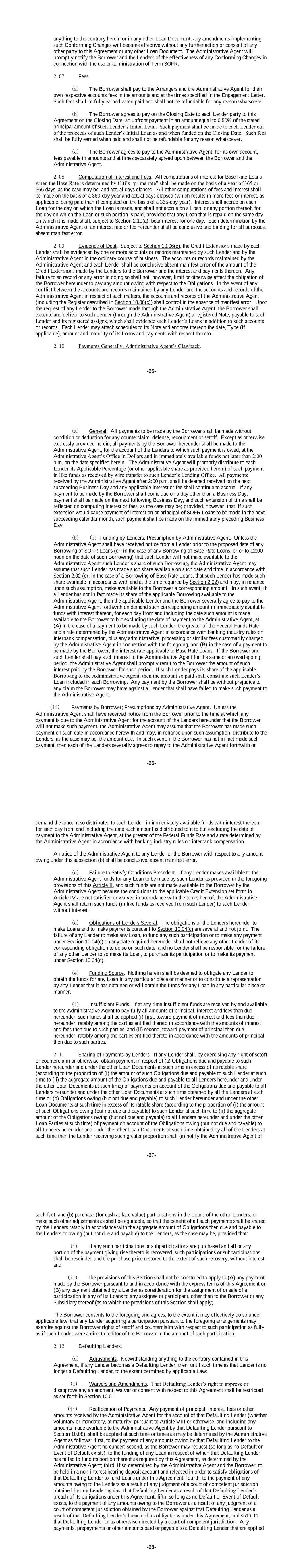 -65- anything to the contrary herein or in any other Loan Document, any amendments implementing such Conforming Changes will become effective without any further action or consent of any other party to this Agreement or any other Loan Document. The Administrative Agent will promptly notify the Borrower and the Lenders of the effectiveness of any Conforming Changes in connection with the use or administration of Term SOFR. 2.07 Fees. (a) The Borrower shall pay to the Arrangers and the Administrative Agent for their own respective accounts fees in the amounts and at the times specified in the Engagement Letter. Such fees shall be fully earned when paid and shall not be refundable for any reason whatsoever. (b) The Borrower agrees to pay on the Closing Date to each Lender party to this Agreement on the Closing Date, an upfront payment in an amount equal to 0.50% of the stated principal amount of such Lender’s Initial Loan. Such payment shall be made to each Lender out of the proceeds of such Lender’s Initial Loan as and when funded on the Closing Date. Such fees shall be fully earned when paid and shall not be refundable for any reason whatsoever. (c) The Borrower agrees to pay to the Administrative Agent, for its own account, fees payable in amounts and at times separately agreed upon between the Borrower and the Administrative Agent. 2.08 Computation of Interest and Fees. All computations of interest for Base Rate Loans when the Base Rate is determined by Citi’s “prime rate” shall be made on the basis of a year of 365 or 366 days, as the case may be, and actual days elapsed. All other computations of fees and interest shall be made on the basis of a 360-day year and actual days elapsed (which results in more fees or interest, as applicable, being paid than if computed on the basis of a 365-day year). Interest shall accrue on each Loan for the day on which the Loan is made, and shall not accrue on a Loan, or any portion thereof, for the day on which the Loan or such portion is paid, provided that any Loan that is repaid on the same day on which it is made shall, subject to Section 2.10(a), bear interest for one day. Each determination by the Administrative Agent of an interest rate or fee hereunder shall be conclusive and binding for all purposes, absent manifest error. 2.09 Evidence of Debt. Subject to Section 10.06(c), the Credit Extensions made by each Lender shall be evidenced by one or more accounts or records maintained by such Lender and by the Administrative Agent in the ordinary course of business. The accounts or records maintained by the Administrative Agent and each Lender shall be conclusive absent manifest error of the amount of the Credit Extensions made by the Lenders to the Borrower and the interest and payments thereon. Any failure to so record or any error in doing so shall not, however, limit or otherwise affect the obligation of the Borrower hereunder to pay any amount owing with respect to the Obligations. In the event of any conflict between the accounts and records maintained by any Lender and the accounts and records of the Administrative Agent in respect of such matters, the accounts and records of the Administrative Agent (including the Register described in Section 10.06(c)) shall control in the absence of manifest error. Upon the request of any Lender to the Borrower made through the Administrative Agent, the Borrower shall execute and deliver to such Lender (through the Administrative Agent) a registered Note, payable to such Lender and its registered assigns, which shall evidence such Lender’s Loans in addition to such accounts or records. Each Lender may attach schedules to its Note and endorse thereon the date, Type (if applicable), amount and maturity of its Loans and payments with respect thereto. 2.10 Payments Generally; Administrative Agent’s Clawback. -66- (a) General. All payments to be made by the Borrower shall be made without condition or deduction for any counterclaim, defense, recoupment or setoff. Except as otherwise expressly provided herein, all payments by the Borrower hereunder shall be made to the Administrative Agent, for the account of the Lenders to which such payment is owed, at the Administrative Agent’s Office in Dollars and in immediately available funds not later than 2:00 p.m. on the date specified herein. The Administrative Agent will promptly distribute to each Lender its Applicable Percentage (or other applicable share as provided herein) of such payment in like funds as received by wire transfer to such Lender’s Lending Office. All payments received by the Administrative Agent after 2:00 p.m. shall be deemed received on the next succeeding Business Day and any applicable interest or fee shall continue to accrue. If any payment to be made by the Borrower shall come due on a day other than a Business Day, payment shall be made on the next following Business Day, and such extension of time shall be reflected on computing interest or fees, as the case may be; provided, however, that, if such extension would cause payment of interest on or principal of SOFR Loans to be made in the next succeeding calendar month, such payment shall be made on the immediately preceding Business Day. (b) (i) Funding by Lenders; Presumption by Administrative Agent. Unless the Administrative Agent shall have received notice from a Lender prior to the proposed date of any Borrowing of SOFR Loans (or, in the case of any Borrowing of Base Rate Loans, prior to 12:00 noon on the date of such Borrowing) that such Lender will not make available to the Administrative Agent such Lender’s share of such Borrowing, the Administrative Agent may assume that such Lender has made such share available on such date and time in accordance with Section 2.02 (or, in the case of a Borrowing of Base Rate Loans, that such Lender has made such share available in accordance with and at the time required by Section 2.02) and may, in reliance upon such assumptio