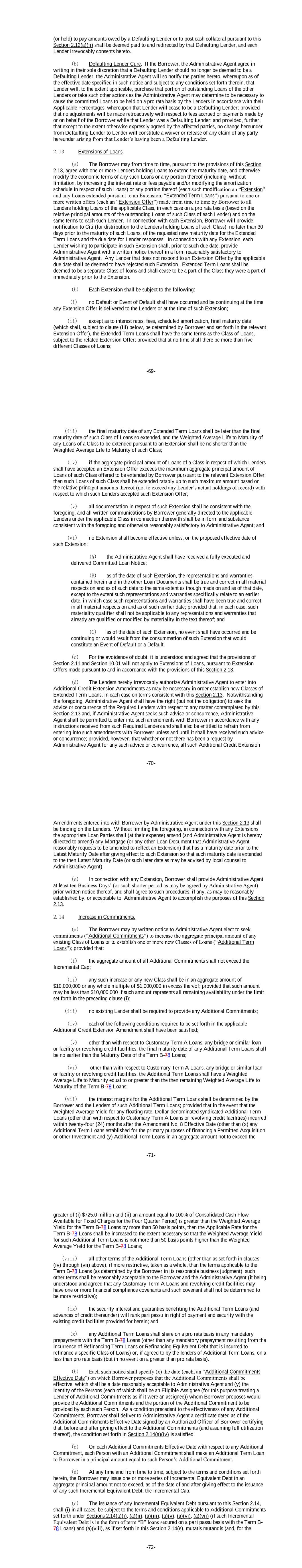 -73- avoidance of doubt, the interest rate, upfront fees and original issue discount for any Incremental Equivalent Debt shall be as determined by the Borrower), (ii) the covenants, events of default, guarantees and other terms of such Incremental Equivalent Debt shall be customary for similar debt instruments in light of then-prevailing market conditions at the time of issuance and in any event not materially more restrictive, taken as a whole, to the Borrower and the other Restricted Subsidiaries than those set forth in this Agreement (other than with respect to interest rate and redemption provisions), except for covenants or other provisions applicable only to periods after the Latest Maturity Date at the time of issuance, it being understood that a certificate of a Responsible Officer of the Borrower delivered to the Administrative Agent prior to or at the incurrence of such Incremental Equivalent Debt, together with a reasonably detailed description of the material terms and conditions of such Incremental Equivalent Debt or drafts of the documentation relating thereto, stating that the Borrower has determined in good faith that such terms and conditions of the Incremental Equivalent Debt satisfy the requirement set forth in this clause (e), shall be conclusive evidence that such terms and conditions have been satisfied; provided that notwithstanding the foregoing, (x) any revolving credit facility or Customary Term A Loan may benefit from one or more financial maintenance covenants and (y) the terms of any revolving credit facility may be more restrictive so long as the terms of such revolving credit facility, when taken as a whole, are not more restrictive than the terms of the ABL Credit Agreement, (iii) such Incremental Equivalent Debt (other than any revolving credit facility or non-Dollar denominated Customary Term A Loan) shall not be subject to any Guarantee by any Person other than a Loan Party, (iv) in the case of Incremental Equivalent Debt that is secured (other than any revolving credit facility or non-Dollar denominated Customary Term A Loan), the obligations in respect thereof shall not be secured by any Lien on any asset the Borrower or any Restricted Subsidiary other than any asset constituting Collateral, (v) if such Incremental Equivalent Debt is secured, such Incremental Equivalent Debt shall be subject to an applicable Intercreditor Agreement, (vi) such Incremental Equivalent Debt shall not include any financial maintenance covenant unless (x) such financial maintenance covenant is also added for the benefit of each Facility remaining outstanding after the incurrence or issuance of such Incremental Equivalent Debt or (y) such Incremental Equivalent Debt consists of revolving credit facilities or Customary Term A Loans and (vii) other than in the case of any Customary Term A Loans or bridge loan facility, the terms of such Incremental Equivalent Debt do not provide for any scheduled amortization or mandatory repayment, mandatory redemption, mandatory offer to purchase or sinking fund obligation prior to the date that is 91 days after the Latest Maturity Date at the time of incurrence, issuance or obtainment of such Incremental Equivalent Debt, other than customary prepayments, repurchases or redemptions of or offers to prepay, redeem or repurchase upon a change of control, asset sale event or casualty or condemnation event, customary prepayments, redemptions or repurchases or offers to prepay, redeem or repurchase based on failure of a specific transaction to occur if the proceeds of such Incremental Equivalent Debt were intended to finance all or a portion of such transaction, customary prepayments, redemptions or repurchases or offers to prepay, redeem or repurchase based on excess cash flow (in the case of loans) and customary acceleration rights upon an event of default. (f) This Section 2.14 shall supersede any provisions in Section 3.06 or Section 10.01 to the contrary. The Additional Commitments shall be documented by an Additional Credit Extension Amendment executed by the Persons providing the Additional Commitments (and the other Persons specified in the definition of “Additional Credit Extension Amendment” but no other existing Lender), and the Additional Credit Extension Amendment may provide for such amendments to this Agreement and the other Loan Documents as may be necessary or appropriate, in the reasonable opinion of Administrative Agent and Borrower, to effect the provisions of this Section 2.14. -74- 2.15 Refinancing Term Loans. (a) Borrower may at any time and from time to time, by written notice to Administrative Agent, request the establishment of one or more additional Classes of Loans under this Agreement or an increase to an existing Class of Loans under this Agreement the proceeds of which are used, concurrently or substantially concurrently with the incurrence thereof, solely to refinance all or any portion of any outstanding Loans (“Refinancing Term Loans”); provided that: (i) each Class of Refinancing Term Loans shall be in an aggregate amount of no less than $10,000,000 (or such other amount necessary to repay any Class of outstanding Loans in full); (ii) such Refinancing Term Loans shall be in an aggregate principal amount not greater than the aggregate principal amount outstanding of Loans to be refinanced plus any accrued interest, premiums, fees, costs and expenses related thereto (including any original issue discount or upfront fees); (iii) the final maturity date of such Refinancing Term Loans shall be no earlier than the maturity date of the Loans being refinanced, and the Weighted Average Life to Maturity of such Refinancing Term Loans shall be no shorter than the then remaining Weighted Average Life to Maturity of each Class of Loans being refinanced; (iv) (A) the pricing, rate floors, discounts, fees and optional and mandatory prepayment or redemption provisions applicable to such Refinancing Term Loans shall be as