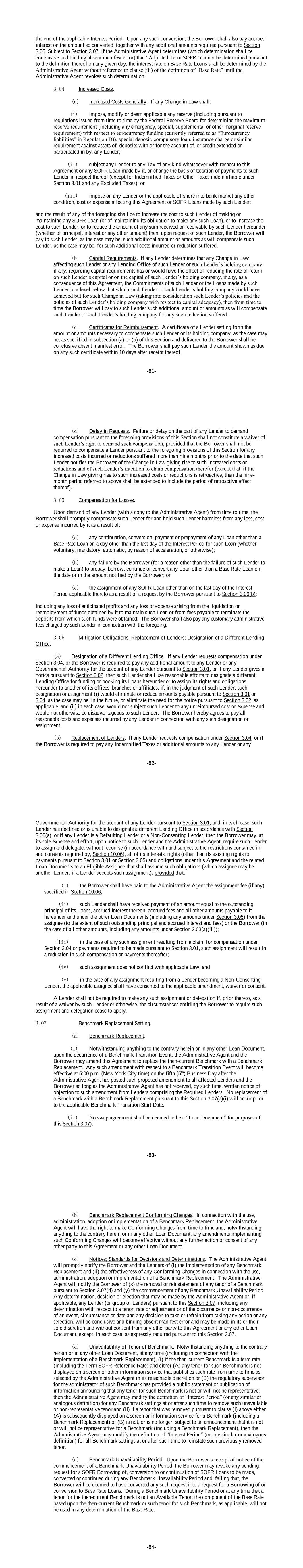 -81- the end of the applicable Interest Period. Upon any such conversion, the Borrower shall also pay accrued interest on the amount so converted, together with any additional amounts required pursuant to Section 3.05. Subject to Section 3.07, if the Administrative Agent determines (which determination shall be conclusive and binding absent manifest error) that “Adjusted Term SOFR” cannot be determined pursuant to the definition thereof on any given day, the interest rate on Base Rate Loans shall be determined by the Administrative Agent without reference to clause (iii) of the definition of “Base Rate” until the Administrative Agent revokes such determination. 3.04 Increased Costs. (a) Increased Costs Generally. If any Change in Law shall: (i) impose, modify or deem applicable any reserve (including pursuant to regulations issued from time to time by the Federal Reserve Board for determining the maximum reserve requirement (including any emergency, special, supplemental or other marginal reserve requirement) with respect to eurocurrency funding (currently referred to as “Eurocurrency liabilities” in Regulation D)), special deposit, compulsory loan, insurance charge or similar requirement against assets of, deposits with or for the account of, or credit extended or participated in by, any Lender; (ii) subject any Lender to any Tax of any kind whatsoever with respect to this Agreement or any SOFR Loan made by it, or change the basis of taxation of payments to such Lender in respect thereof (except for Indemnified Taxes or Other Taxes indemnifiable under Section 3.01 and any Excluded Taxes); or (iii) impose on any Lender or the applicable offshore interbank market any other condition, cost or expense affecting this Agreement or SOFR Loans made by such Lender; and the result of any of the foregoing shall be to increase the cost to such Lender of making or maintaining any SOFR Loan (or of maintaining its obligation to make any such Loan), or to increase the cost to such Lender, or to reduce the amount of any sum received or receivable by such Lender hereunder (whether of principal, interest or any other amount) then, upon request of such Lender, the Borrower will pay to such Lender, as the case may be, such additional amount or amounts as will compensate such Lender, as the case may be, for such additional costs incurred or reduction suffered. (b) Capital Requirements. If any Lender determines that any Change in Law affecting such Lender or any Lending Office of such Lender or such Lender’s holding company, if any, regarding capital requirements has or would have the effect of reducing the rate of return on such Lender’s capital or on the capital of such Lender’s holding company, if any, as a consequence of this Agreement, the Commitments of such Lender or the Loans made by such Lender to a level below that which such Lender or such Lender’s holding company could have achieved but for such Change in Law (taking into consideration such Lender’s policies and the policies of such Lender’s holding company with respect to capital adequacy), then from time to time the Borrower will pay to such Lender such additional amount or amounts as will compensate such Lender or such Lender’s holding company for any such reduction suffered. (c) Certificates for Reimbursement. A certificate of a Lender setting forth the amount or amounts necessary to compensate such Lender or its holding company, as the case may be, as specified in subsection (a) or (b) of this Section and delivered to the Borrower shall be conclusive absent manifest error. The Borrower shall pay such Lender the amount shown as due on any such certificate within 10 days after receipt thereof. -82- (d) Delay in Requests. Failure or delay on the part of any Lender to demand compensation pursuant to the foregoing provisions of this Section shall not constitute a waiver of such Lender’s right to demand such compensation, provided that the Borrower shall not be required to compensate a Lender pursuant to the foregoing provisions of this Section for any increased costs incurred or reductions suffered more than nine months prior to the date that such Lender notifies the Borrower of the Change in Law giving rise to such increased costs or reductions and of such Lender’s intention to claim compensation therefor (except that, if the Change in Law giving rise to such increased costs or reductions is retroactive, then the nine- month period referred to above shall be extended to include the period of retroactive effect thereof). 3.05 Compensation for Losses. Upon demand of any Lender (with a copy to the Administrative Agent) from time to time, the Borrower shall promptly compensate such Lender for and hold such Lender harmless from any loss, cost or expense incurred by it as a result of: (a) any continuation, conversion, payment or prepayment of any Loan other than a Base Rate Loan on a day other than the last day of the Interest Period for such Loan (whether voluntary, mandatory, automatic, by reason of acceleration, or otherwise); (b) any failure by the Borrower (for a reason other than the failure of such Lender to make a Loan) to prepay, borrow, continue or convert any Loan other than a Base Rate Loan on the date or in the amount notified by the Borrower; or (c) the assignment of any SOFR Loan other than on the last day of the Interest Period applicable thereto as a result of a request by the Borrower pursuant to Section 3.06(b); including any loss of anticipated profits and any loss or expense arising from the liquidation or reemployment of funds obtained by it to maintain such Loan or from fees payable to terminate the deposits from which such funds were obtained. The Borrower shall also pay any customary administrative fees charged by such Lender in connection with the foregoing. 3.06 Mitigation Obligations; Replacement of Lenders; Designation of a Different Lending Office. (a) Designation of a Different Lending Office