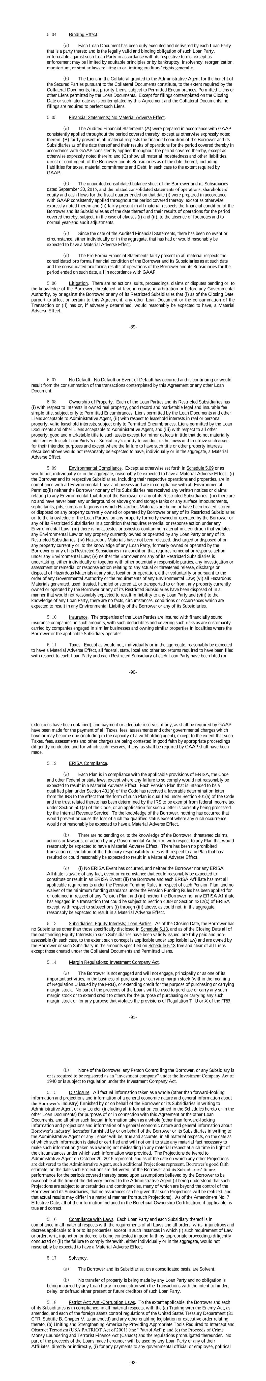 -89- 5.04 Binding Effect. (a) Each Loan Document has been duly executed and delivered by each Loan Party that is a party thereto and is the legally valid and binding obligation of such Loan Party, enforceable against such Loan Party in accordance with its respective terms, except as enforcement may be limited by equitable principles or by bankruptcy, insolvency, reorganization, moratorium, or similar laws relating to or limiting creditors’ rights generally. (b) The Liens in the Collateral granted to the Administrative Agent for the benefit of the Secured Parties pursuant to the Collateral Documents constitute, to the extent required by the Collateral Documents, first priority Liens, subject to Permitted Encumbrances, Permitted Liens or other Liens permitted by the Loan Documents. Except for filings contemplated on the Closing Date or such later date as is contemplated by this Agreement and the Collateral Documents, no filings are required to perfect such Liens. 5.05 Financial Statements; No Material Adverse Effect. (a) The Audited Financial Statements (A) were prepared in accordance with GAAP consistently applied throughout the period covered thereby, except as otherwise expressly noted therein; (B) fairly present in all material respects the financial condition of the Borrower and its Subsidiaries as of the date thereof and their results of operations for the period covered thereby in accordance with GAAP consistently applied throughout the period covered thereby, except as otherwise expressly noted therein; and (C) show all material indebtedness and other liabilities, direct or contingent, of the Borrower and its Subsidiaries as of the date thereof, including liabilities for taxes, material commitments and Debt, in each case to the extent required by GAAP. (b) The unaudited consolidated balance sheet of the Borrower and its Subsidiaries dated September 30, 2015, and the related consolidated statements of operations, shareholders’ equity and cash flows for the fiscal quarter ended on that date (i) were prepared in accordance with GAAP consistently applied throughout the period covered thereby, except as otherwise expressly noted therein and (ii) fairly present in all material respects the financial condition of the Borrower and its Subsidiaries as of the date thereof and their results of operations for the period covered thereby, subject, in the case of clauses (i) and (ii), to the absence of footnotes and to normal year-end audit adjustments. (c) Since the date of the Audited Financial Statements, there has been no event or circumstance, either individually or in the aggregate, that has had or would reasonably be expected to have a Material Adverse Effect. (d) The Pro Forma Financial Statements fairly present in all material respects the consolidated pro forma financial condition of the Borrower and its Subsidiaries as at such date and the consolidated pro forma results of operations of the Borrower and its Subsidiaries for the period ended on such date, all in accordance with GAAP. 5.06 Litigation. There are no actions, suits, proceedings, claims or disputes pending or, to the knowledge of the Borrower, threatened, at law, in equity, in arbitration or before any Governmental Authority, by or against the Borrower or any of its Restricted Subsidiaries that (i) as of the Closing Date, purport to affect or pertain to this Agreement, any other Loan Document or the consummation of the Transaction or (ii) has or, if adversely determined, would reasonably be expected to have, a Material Adverse Effect. -90- 5.07 No Default. No Default or Event of Default has occurred and is continuing or would result from the consummation of the transactions contemplated by this Agreement or any other Loan Document. 5.08 Ownership of Property. Each of the Loan Parties and its Restricted Subsidiaries has (i) with respect to interests in owned real property, good record and marketable legal and insurable fee simple title, subject only to Permitted Encumbrances, Liens permitted by the Loan Documents and other Liens acceptable to Administrative Agent, (ii) with respect to leasehold interests in real or personal property, valid leasehold interests, subject only to Permitted Encumbrances, Liens permitted by the Loan Documents and other Liens acceptable to Administrative Agent, and (iii) with respect to all other property, good and marketable title to such assets except for minor defects in title that do not materially interfere with such Loan Party’s or Subsidiary’s ability to conduct its business and to utilize such assets for their intended purposes and except where the failure to have such title or other property interests described above would not reasonably be expected to have, individually or in the aggregate, a Material Adverse Effect. 5.09 Environmental Compliance. Except as otherwise set forth in Schedule 5.09 or as would not, individually or in the aggregate, reasonably be expected to have a Material Adverse Effect: (i) the Borrower and its respective Subsidiaries, including their respective operations and properties, are in compliance with all Environmental Laws and possess and are in compliance with all Environmental Permits;(ii) neither the Borrower nor any of its Subsidiaries has received any written notices or claims relating to any Environmental Liability of the Borrower or any of its Restricted Subsidiaries; (iii) there are no and have never been any underground or above ground storage tanks or any surface impoundments, septic tanks, pits, sumps or lagoons in which Hazardous Materials are being or have been treated, stored or disposed on any property currently owned or operated by Borrower or any of its Restricted Subsidiaries or, to the knowledge of the Loan Parties, on any property formerly owned or operated by the Borrower or any of its Restricted Subsidiaries in a condition that requires remedial or response action under any Environmental Law; (iii) there is no asbestos or asbestos-cont