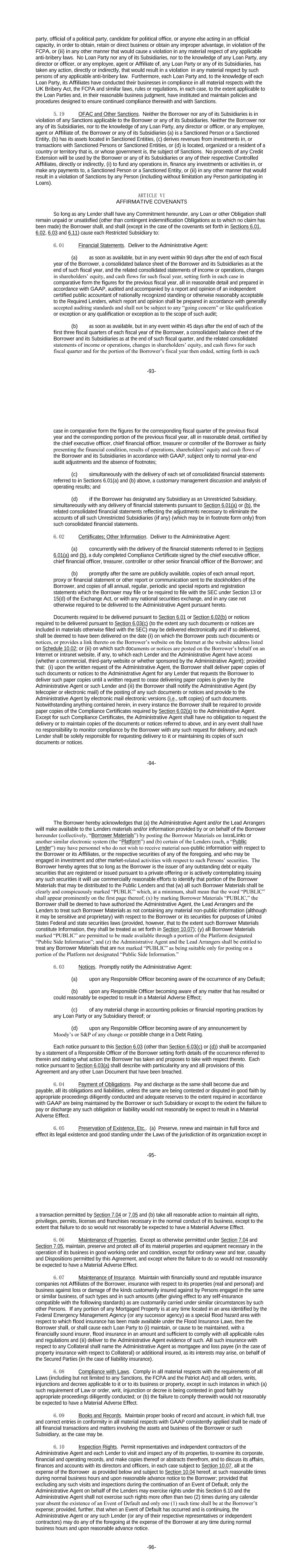 -93- party, official of a political party, candidate for political office, or anyone else acting in an official capacity, in order to obtain, retain or direct business or obtain any improper advantage, in violation of the FCPA, or (ii) in any other manner that would cause a violation in any material respect of any applicable anti-bribery laws. No Loan Party nor any of its Subsidiaries, nor to the knowledge of any Loan Party, any director or officer, or any employee, agent or Affiliate of, any Loan Party or any of its Subsidiaries, has taken any action, directly or indirectly, that would result in a violation in any material respect by such persons of any applicable anti-bribery law. Furthermore, each Loan Party and, to the knowledge of each Loan Party, its Affiliates have conducted their businesses in compliance in all material respects with the UK Bribery Act, the FCPA and similar laws, rules or regulations, in each case, to the extent applicable to the Loan Parties and, in their reasonable business judgment, have instituted and maintain policies and procedures designed to ensure continued compliance therewith and with Sanctions. 5.19 OFAC and Other Sanctions. Neither the Borrower nor any of its Subsidiaries is in violation of any Sanctions applicable to the Borrower or any of its Subsidiaries. Neither the Borrower nor any of its Subsidiaries, nor to the knowledge of any Loan Party, any director or officer, or any employee, agent or Affiliate of, the Borrower or any of its Subsidiaries (a) is a Sanctioned Person or a Sanctioned Entity, (b) has its assets located in Sanctioned Entities, (c) derives revenues from investments in, or transactions with Sanctioned Persons or Sanctioned Entities, or (d) is located, organized or a resident of a country or territory that is, or whose government is, the subject of Sanctions. No proceeds of any Credit Extension will be used by the Borrower or any of its Subsidiaries or any of their respective Controlled Affiliates, directly or indirectly, (i) to fund any operations in, finance any investments or activities in, or make any payments to, a Sanctioned Person or a Sanctioned Entity, or (ii) in any other manner that would result in a violation of Sanctions by any Person (including without limitation any Person participating in Loans). ARTICLE VI AFFIRMATIVE COVENANTS So long as any Lender shall have any Commitment hereunder, any Loan or other Obligation shall remain unpaid or unsatisfied (other than contingent indemnification Obligations as to which no claim has been made) the Borrower shall, and shall (except in the case of the covenants set forth in Sections 6.01, 6.02, 6.03 and 6.11) cause each Restricted Subsidiary to: 6.01 Financial Statements. Deliver to the Administrative Agent: (a) as soon as available, but in any event within 90 days after the end of each fiscal year of the Borrower, a consolidated balance sheet of the Borrower and its Subsidiaries as at the end of such fiscal year, and the related consolidated statements of income or operations, changes in shareholders’ equity, and cash flows for such fiscal year, setting forth in each case in comparative form the figures for the previous fiscal year, all in reasonable detail and prepared in accordance with GAAP, audited and accompanied by a report and opinion of an independent certified public accountant of nationally recognized standing or otherwise reasonably acceptable to the Required Lenders, which report and opinion shall be prepared in accordance with generally accepted auditing standards and shall not be subject to any “going concern” or like qualification or exception or any qualification or exception as to the scope of such audit; (b) as soon as available, but in any event within 45 days after the end of each of the first three fiscal quarters of each fiscal year of the Borrower, a consolidated balance sheet of the Borrower and its Subsidiaries as at the end of such fiscal quarter, and the related consolidated statements of income or operations, changes in shareholders’ equity, and cash flows for such fiscal quarter and for the portion of the Borrower’s fiscal year then ended, setting forth in each -94- case in comparative form the figures for the corresponding fiscal quarter of the previous fiscal year and the corresponding portion of the previous fiscal year, all in reasonable detail, certified by the chief executive officer, chief financial officer, treasurer or controller of the Borrower as fairly presenting the financial condition, results of operations, shareholders’ equity and cash flows of the Borrower and its Subsidiaries in accordance with GAAP, subject only to normal year-end audit adjustments and the absence of footnotes; (c) simultaneously with the delivery of each set of consolidated financial statements referred to in Sections 6.01(a) and (b) above, a customary management discussion and analysis of operating results; and (d) if the Borrower has designated any Subsidiary as an Unrestricted Subsidiary, simultaneously with any delivery of financial statements pursuant to Section 6.01(a) or (b), the related consolidated financial statements reflecting the adjustments necessary to eliminate the accounts of all such Unrestricted Subsidiaries (if any) (which may be in footnote form only) from such consolidated financial statements. 6.02 Certificates; Other Information. Deliver to the Administrative Agent: (a) concurrently with the delivery of the financial statements referred to in Sections 6.01(a) and (b), a duly completed Compliance Certificate signed by the chief executive officer, chief financial officer, treasurer, controller or other senior financial officer of the Borrower; and (b) promptly after the same are publicly available, copies of each annual report, proxy or financial statement or other report or communication sent to the stockholders of the Borrower, and copies of all annual, regular, periodic and special reports and registration statements which 