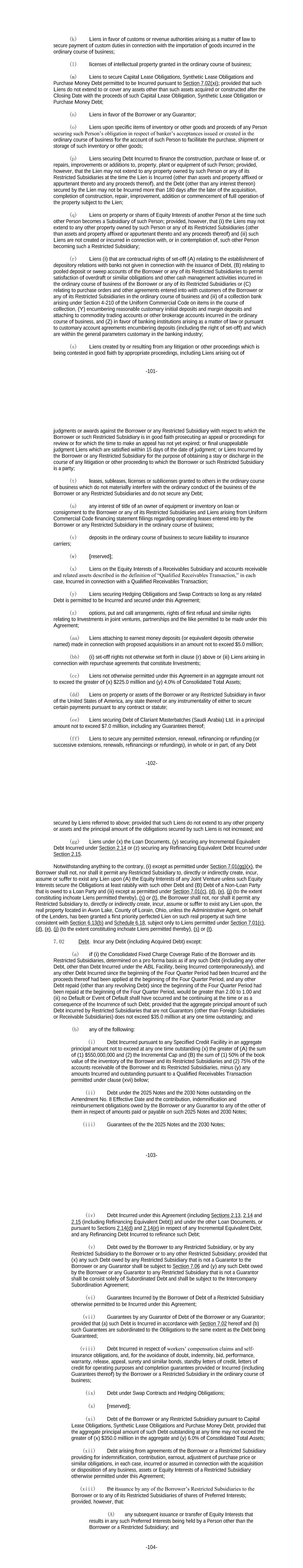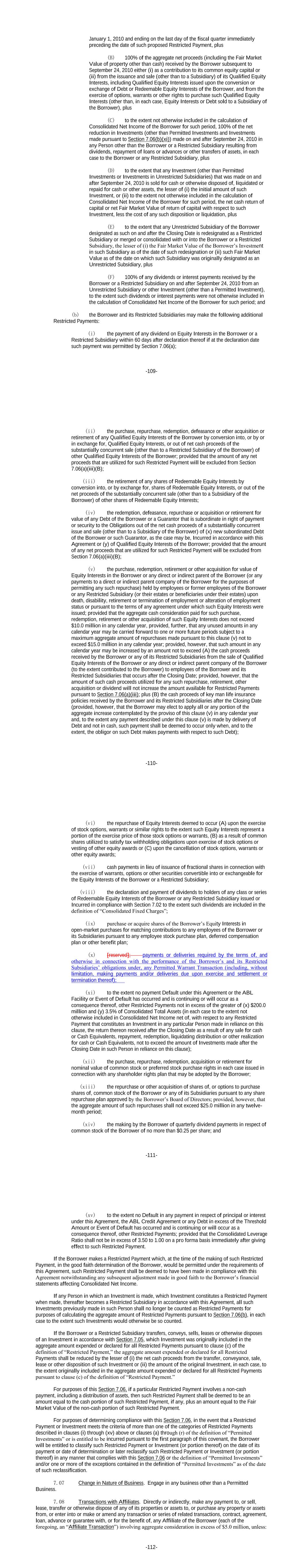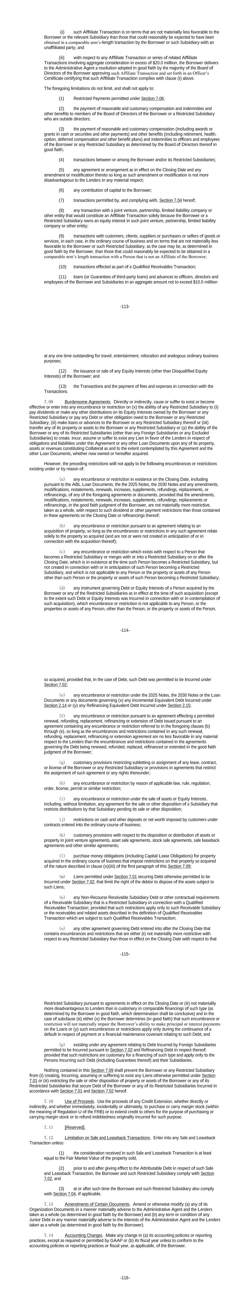 -113- (i) such Affiliate Transaction is on terms that are not materially less favorable to the Borrower or the relevant Subsidiary than those that could reasonably be expected to have been obtained in a comparable arm’s-length transaction by the Borrower or such Subsidiary with an unaffiliated party; and (ii) with respect to any Affiliate Transaction or series of related Affiliate Transactions involving aggregate consideration in excess of $20.0 million, the Borrower delivers to the Administrative Agent a resolution adopted in good faith by the majority of the Board of Directors of the Borrower approving such Affiliate Transaction and set forth in an Officer’s Certificate certifying that such Affiliate Transaction complies with clause (i) above. The foregoing limitations do not limit, and shall not apply to: (1) Restricted Payments permitted under Section 7.06; (2) the payment of reasonable and customary compensation and indemnities and other benefits to members of the Board of Directors of the Borrower or a Restricted Subsidiary who are outside directors; (3) the payment of reasonable and customary compensation (including awards or grants in cash or securities and other payments) and other benefits (including retirement, health, option, deferred compensation and other benefit plans) and indemnities to officers and employees of the Borrower or any Restricted Subsidiary as determined by the Board of Directors thereof in good faith; (4) transactions between or among the Borrower and/or its Restricted Subsidiaries; (5) any agreement or arrangement as in effect on the Closing Date and any amendment or modification thereto so long as such amendment or modification is not more disadvantageous to the Lenders in any material respect; (6) any contribution of capital to the Borrower; (7) transactions permitted by, and complying with, Section 7.04 hereof; (8) any transaction with a joint venture, partnership, limited liability company or other entity that would constitute an Affiliate Transaction solely because the Borrower or a Restricted Subsidiary owns an equity interest in such joint venture, partnership, limited liability company or other entity; (9) transactions with customers, clients, suppliers or purchasers or sellers of goods or services, in each case, in the ordinary course of business and on terms that are not materially less favorable to the Borrower or such Restricted Subsidiary, as the case may be, as determined in good faith by the Borrower, than those that could reasonably be expected to be obtained in a comparable arm’s length transaction with a Person that is not an Affiliate of the Borrower; (10) transactions effected as part of a Qualified Receivables Transaction; (11) loans (or Guarantees of third-party loans) and advances to officers, directors and employees of the Borrower and Subsidiaries in an aggregate amount not to exceed $10.0 million -114- at any one time outstanding for travel, entertainment, relocation and analogous ordinary business purposes; (12) the issuance or sale of any Equity Interests (other than Disqualified Equity Interests) of the Borrower; and (13) the Transactions and the payment of fees and expenses in connection with the Transactions. 7.09 Burdensome Agreements. Directly or indirectly, cause or suffer to exist or become effective or enter into any encumbrance or restriction on (x) the ability of any Restricted Subsidiary to (i) pay dividends or make any other distributions on its Equity Interests owned by the Borrower or any Restricted Subsidiary or pay any Debt or other obligation owed to the Borrower or any Restricted Subsidiary, (ii) make loans or advances to the Borrower or any Restricted Subsidiary thereof or (iii) transfer any of its property or assets to the Borrower or any Restricted Subsidiary or (y) the ability of the Borrower or any of its Restricted Subsidiaries (other than any Foreign Subsidiaries or any Excluded Subsidiaries) to create, incur, assume or suffer to exist any Lien in favor of the Lenders in respect of obligations and liabilities under this Agreement or any other Loan Documents upon any of its property, assets or revenues constituting Collateral as and to the extent contemplated by this Agreement and the other Loan Documents, whether now owned or hereafter acquired. However, the preceding restrictions will not apply to the following encumbrances or restrictions existing under or by reason of: (a) any encumbrance or restriction in existence on the Closing Date, including pursuant to the ABL Loan Documents, the the 2025 Notes, the 2030 Notes and any amendments, modifications, restatements, renewals, increases, supplements, refundings, replacements, or refinancings, of any of the foregoing agreements or documents, provided that the amendments, modifications, restatements, renewals, increases, supplements, refundings, replacements or refinancings, in the good faith judgment of the Borrower, are not materially more restrictive, taken as a whole, with respect to such dividend or other payment restrictions than those contained in these agreements on the Closing Date or refinancings thereof; (b) any encumbrance or restriction pursuant to an agreement relating to an acquisition of property, so long as the encumbrances or restrictions in any such agreement relate solely to the property so acquired (and are not or were not created in anticipation of or in connection with the acquisition thereof); (c) any encumbrance or restriction which exists with respect to a Person that becomes a Restricted Subsidiary or merges with or into a Restricted Subsidiary on or after the Closing Date, which is in existence at the time such Person becomes a Restricted Subsidiary, but not created in connection with or in anticipation of such Person becoming a Restricted Subsidiary, and which is not applicable to any Person or the property or assets of any Person other than such Person or the property or assets of such Person becoming a Restricted Subsidi