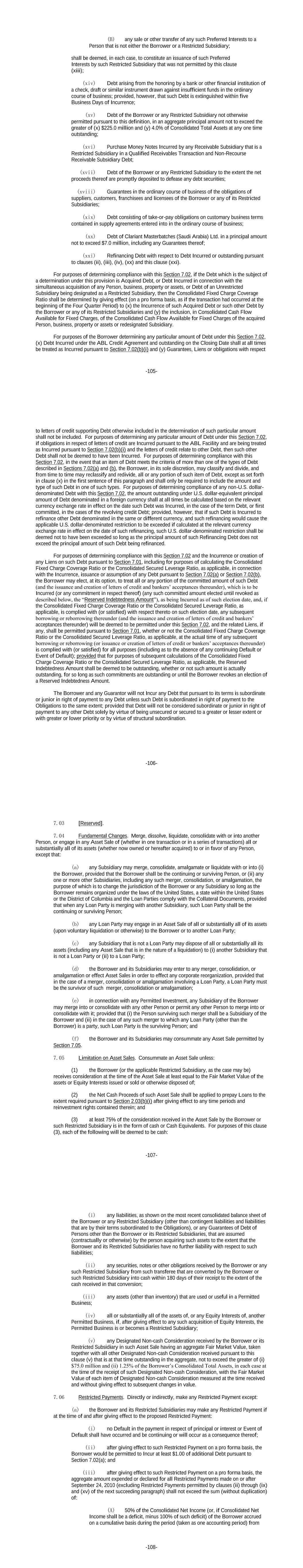 -105- (B) any sale or other transfer of any such Preferred Interests to a Person that is not either the Borrower or a Restricted Subsidiary; shall be deemed, in each case, to constitute an issuance of such Preferred Interests by such Restricted Subsidiary that was not permitted by this clause (xiii); (xiv) Debt arising from the honoring by a bank or other financial institution of a check, draft or similar instrument drawn against insufficient funds in the ordinary course of business; provided, however, that such Debt is extinguished within five Business Days of Incurrence; (xv) Debt of the Borrower or any Restricted Subsidiary not otherwise permitted pursuant to this definition, in an aggregate principal amount not to exceed the greater of (x) $225.0 million and (y) 4.0% of Consolidated Total Assets at any one time outstanding; (xvi) Purchase Money Notes Incurred by any Receivable Subsidiary that is a Restricted Subsidiary in a Qualified Receivables Transaction and Non-Recourse Receivable Subsidiary Debt; (xvii) Debt of the Borrower or any Restricted Subsidiary to the extent the net proceeds thereof are promptly deposited to defease any debt securities; (xviii) Guarantees in the ordinary course of business of the obligations of suppliers, customers, franchisees and licensees of the Borrower or any of its Restricted Subsidiaries; (xix) Debt consisting of take-or-pay obligations on customary business terms contained in supply agreements entered into in the ordinary course of business; (xx) Debt of Clariant Masterbatches (Saudi Arabia) Ltd. in a principal amount not to exceed $7.0 million, including any Guarantees thereof; (xxi) Refinancing Debt with respect to Debt Incurred or outstanding pursuant to clauses (ii), (iii), (iv), (xx) and this clause (xxi). For purposes of determining compliance with this Section 7.02, if the Debt which is the subject of a determination under this provision is Acquired Debt, or Debt Incurred in connection with the simultaneous acquisition of any Person, business, property or assets, or Debt of an Unrestricted Subsidiary being designated as a Restricted Subsidiary, then the Consolidated Fixed Charge Coverage Ratio shall be determined by giving effect (on a pro forma basis, as if the transaction had occurred at the beginning of the Four Quarter Period) to (x) the Incurrence of such Acquired Debt or such other Debt by the Borrower or any of its Restricted Subsidiaries and (y) the inclusion, in Consolidated Cash Flow Available for Fixed Charges, of the Consolidated Cash Flow Available for Fixed Charges of the acquired Person, business, property or assets or redesignated Subsidiary. For purposes of the Borrower determining any particular amount of Debt under this Section 7.02, (x) Debt Incurred under the ABL Credit Agreement and outstanding on the Closing Date shall at all times be treated as Incurred pursuant to Section 7.02(b)(i) and (y) Guarantees, Liens or obligations with respect -106- to letters of credit supporting Debt otherwise included in the determination of such particular amount shall not be included. For purposes of determining any particular amount of Debt under this Section 7.02, if obligations in respect of letters of credit are Incurred pursuant to the ABL Facility and are being treated as Incurred pursuant to Section 7.02(b)(i) and the letters of credit relate to other Debt, then such other Debt shall not be deemed to have been Incurred. For purposes of determining compliance with this Section 7.02, in the event that an item of Debt meets the criteria of more than one of the types of Debt described in Sections 7.02(a) and (b), the Borrower, in its sole discretion, may classify and divide, and from time to time may reclassify and redivide, all or any portion of such item of Debt, except as set forth in clause (x) in the first sentence of this paragraph and shall only be required to include the amount and type of such Debt in one of such types. For purposes of determining compliance of any non-U.S. dollar- denominated Debt with this Section 7.02, the amount outstanding under U.S. dollar-equivalent principal amount of Debt denominated in a foreign currency shall at all times be calculated based on the relevant currency exchange rate in effect on the date such Debt was Incurred, in the case of the term Debt, or first committed, in the cases of the revolving credit Debt; provided, however, that if such Debt is Incurred to refinance other Debt denominated in the same or different currency, and such refinancing would cause the applicable U.S. dollar-denominated restriction to be exceeded if calculated at the relevant currency exchange rate in effect on the date of such refinancing, such U.S. dollar-denominated restriction shall be deemed not to have been exceeded so long as the principal amount of such Refinancing Debt does not exceed the principal amount of such Debt being refinanced. For purposes of determining compliance with this Section 7.02 and the Incurrence or creation of any Liens on such Debt pursuant to Section 7.01, including for purposes of calculating the Consolidated Fixed Charge Coverage Ratio or the Consolidated Secured Leverage Ratio, as applicable, in connection with the Incurrence, issuance or assumption of any Debt pursuant to Section 7.02(a) or Section 7.02(b), the Borrower may elect, at its option, to treat all or any portion of the committed amount of such Debt (and the issuance and creation of letters of credit and bankers’ acceptances thereunder), which is to be Incurred (or any commitment in respect thereof) (any such committed amount elected until revoked as described below, the “Reserved Indebtedness Amount”), as being Incurred as of such election date, and, if the Consolidated Fixed Charge Coverage Ratio or the Consolidated Secured Leverage Ratio, as applicable, is complied with (or satisfied) with respect thereto on such election date, any subsequent borrowing or reborrowing thereunder (and the issuance and creation