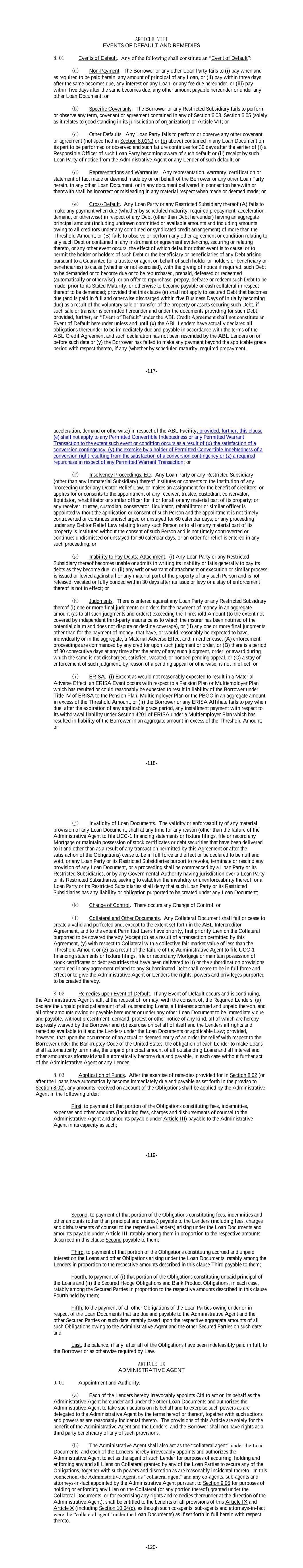 -117- ARTICLE VIII EVENTS OF DEFAULT AND REMEDIES 8.01 Events of Default. Any of the following shall constitute an “Event of Default”: (a) Non-Payment. The Borrower or any other Loan Party fails to (i) pay when and as required to be paid herein, any amount of principal of any Loan, or (ii) pay within three days after the same becomes due, any interest on any Loan, or any fee due hereunder, or (iii) pay within five days after the same becomes due, any other amount payable hereunder or under any other Loan Document; or (b) Specific Covenants. The Borrower or any Restricted Subsidiary fails to perform or observe any term, covenant or agreement contained in any of Section 6.03, Section 6.05 (solely as it relates to good standing in its jurisdiction of organization) or Article VII; or (c) Other Defaults. Any Loan Party fails to perform or observe any other covenant or agreement (not specified in Section 8.01(a) or (b) above) contained in any Loan Document on its part to be performed or observed and such failure continues for 30 days after the earlier of (i) a Responsible Officer of such Loan Party becoming aware of such default or (ii) receipt by such Loan Party of notice from the Administrative Agent or any Lender of such default; or (d) Representations and Warranties. Any representation, warranty, certification or statement of fact made or deemed made by or on behalf of the Borrower or any other Loan Party herein, in any other Loan Document, or in any document delivered in connection herewith or therewith shall be incorrect or misleading in any material respect when made or deemed made; or (e) Cross-Default. Any Loan Party or any Restricted Subsidiary thereof (A) fails to make any payment when due (whether by scheduled maturity, required prepayment, acceleration, demand, or otherwise) in respect of any Debt (other than Debt hereunder) having an aggregate principal amount (including undrawn committed or available amounts and including amounts owing to all creditors under any combined or syndicated credit arrangement) of more than the Threshold Amount, or (B) fails to observe or perform any other agreement or condition relating to any such Debt or contained in any instrument or agreement evidencing, securing or relating thereto, or any other event occurs, the effect of which default or other event is to cause, or to permit the holder or holders of such Debt or the beneficiary or beneficiaries of any Debt arising pursuant to a Guarantee (or a trustee or agent on behalf of such holder or holders or beneficiary or beneficiaries) to cause (whether or not exercised), with the giving of notice if required, such Debt to be demanded or to become due or to be repurchased, prepaid, defeased or redeemed (automatically or otherwise), or an offer to repurchase, prepay, defease or redeem such Debt to be made, prior to its Stated Maturity, or otherwise to become payable or cash collateral in respect thereof to be demanded; provided that this clause (e) shall not apply to secured Debt that becomes due (and is paid in full and otherwise discharged within five Business Days of initially becoming due) as a result of the voluntary sale or transfer of the property or assets securing such Debt, if such sale or transfer is permitted hereunder and under the documents providing for such Debt; provided, further, an “Event of Default” under the ABL Credit Agreement shall not constitute an Event of Default hereunder unless and until (x) the ABL Lenders have actually declared all obligations thereunder to be immediately due and payable in accordance with the terms of the ABL Credit Agreement and such declaration has not been rescinded by the ABL Lenders on or before such date or (y) the Borrower has failed to make any payment beyond the applicable grace period with respect thereto, if any (whether by scheduled maturity, required prepayment, -118- acceleration, demand or otherwise) in respect of the ABL Facility; provided, further, this clause (e) shall not apply to any Permitted Convertible Indebtedness or any Permitted Warrant Transaction to the extent such event or condition occurs as a result of (x) the satisfaction of a conversion contingency, (y) the exercise by a holder of Permitted Convertible Indebtedness of a conversion right resulting from the satisfaction of a conversion contingency or (z) a required repurchase in respect of any Permitted Warrant Transaction; or (f) Insolvency Proceedings, Etc. Any Loan Party or any Restricted Subsidiary (other than any Immaterial Subsidiary) thereof institutes or consents to the institution of any proceeding under any Debtor Relief Law, or makes an assignment for the benefit of creditors; or applies for or consents to the appointment of any receiver, trustee, custodian, conservator, liquidator, rehabilitator or similar officer for it or for all or any material part of its property; or any receiver, trustee, custodian, conservator, liquidator, rehabilitator or similar officer is appointed without the application or consent of such Person and the appointment is not timely controverted or continues undischarged or unstayed for 60 calendar days; or any proceeding under any Debtor Relief Law relating to any such Person or to all or any material part of its property is instituted without the consent of such Person and is not timely controverted or continues undismissed or unstayed for 60 calendar days, or an order for relief is entered in any such proceeding; or (g) Inability to Pay Debts; Attachment. (i) Any Loan Party or any Restricted Subsidiary thereof becomes unable or admits in writing its inability or fails generally to pay its debts as they become due, or (ii) any writ or warrant of attachment or execution or similar process is issued or levied against all or any material part of the property of any such Person and is not released, vacated or fully bonded within 30 days after its issue or levy or a stay of enforcement thereof is not in effect; or (h) Judgments. Ther