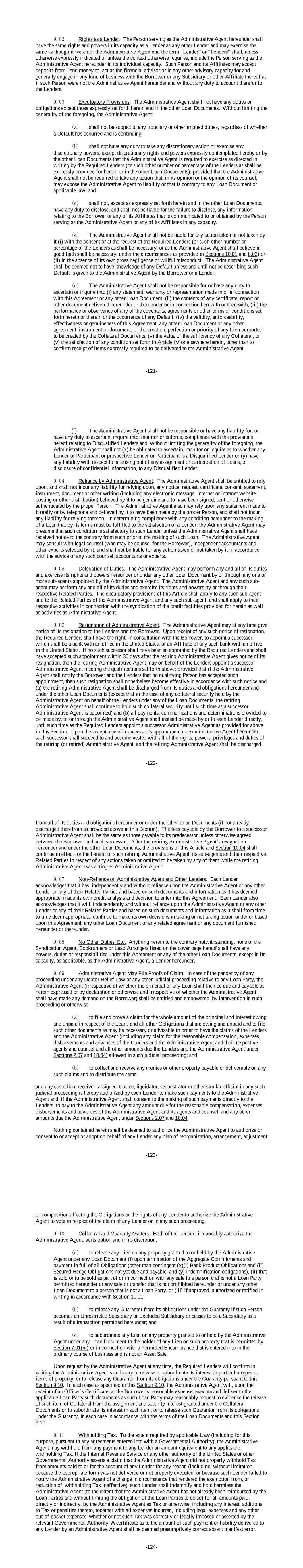 -121- 9.02 Rights as a Lender. The Person serving as the Administrative Agent hereunder shall have the same rights and powers in its capacity as a Lender as any other Lender and may exercise the same as though it were not the Administrative Agent and the term “Lender” or “Lenders” shall, unless otherwise expressly indicated or unless the context otherwise requires, include the Person serving as the Administrative Agent hereunder in its individual capacity. Such Person and its Affiliates may accept deposits from, lend money to, act as the financial advisor or in any other advisory capacity for and generally engage in any kind of business with the Borrower or any Subsidiary or other Affiliate thereof as if such Person were not the Administrative Agent hereunder and without any duty to account therefor to the Lenders. 9.03 Exculpatory Provisions. The Administrative Agent shall not have any duties or obligations except those expressly set forth herein and in the other Loan Documents. Without limiting the generality of the foregoing, the Administrative Agent: (a) shall not be subject to any fiduciary or other implied duties, regardless of whether a Default has occurred and is continuing; (b) shall not have any duty to take any discretionary action or exercise any discretionary powers, except discretionary rights and powers expressly contemplated hereby or by the other Loan Documents that the Administrative Agent is required to exercise as directed in writing by the Required Lenders (or such other number or percentage of the Lenders as shall be expressly provided for herein or in the other Loan Documents), provided that the Administrative Agent shall not be required to take any action that, in its opinion or the opinion of its counsel, may expose the Administrative Agent to liability or that is contrary to any Loan Document or applicable law; and (c) shall not, except as expressly set forth herein and in the other Loan Documents, have any duty to disclose, and shall not be liable for the failure to disclose, any information relating to the Borrower or any of its Affiliates that is communicated to or obtained by the Person serving as the Administrative Agent or any of its Affiliates in any capacity. (d) The Administrative Agent shall not be liable for any action taken or not taken by it (i) with the consent or at the request of the Required Lenders (or such other number or percentage of the Lenders as shall be necessary, or as the Administrative Agent shall believe in good faith shall be necessary, under the circumstances as provided in Sections 10.01 and 8.02) or (ii) in the absence of its own gross negligence or willful misconduct. The Administrative Agent shall be deemed not to have knowledge of any Default unless and until notice describing such Default is given to the Administrative Agent by the Borrower or a Lender. (e) The Administrative Agent shall not be responsible for or have any duty to ascertain or inquire into (i) any statement, warranty or representation made in or in connection with this Agreement or any other Loan Document, (ii) the contents of any certificate, report or other document delivered hereunder or thereunder or in connection herewith or therewith, (iii) the performance or observance of any of the covenants, agreements or other terms or conditions set forth herein or therein or the occurrence of any Default, (iv) the validity, enforceability, effectiveness or genuineness of this Agreement, any other Loan Document or any other agreement, instrument or document, or the creation, perfection or priority of any Lien purported to be created by the Collateral Documents, (v) the value or the sufficiency of any Collateral, or (v) the satisfaction of any condition set forth in Article IV or elsewhere herein, other than to confirm receipt of items expressly required to be delivered to the Administrative Agent. -122- (f) The Administrative Agent shall not be responsible or have any liability for, or have any duty to ascertain, inquire into, monitor or enforce, compliance with the provisions hereof relating to Disqualified Lenders and, without limiting the generality of the foregoing, the Administrative Agent shall not (x) be obligated to ascertain, monitor or inquire as to whether any Lender or Participant or prospective Lender or Participant is a Disqualified Lender or (y) have any liability with respect to or arising out of any assignment or participation of Loans, or disclosure of confidential information, to any Disqualified Lender. 9.04 Reliance by Administrative Agent. The Administrative Agent shall be entitled to rely upon, and shall not incur any liability for relying upon, any notice, request, certificate, consent, statement, instrument, document or other writing (including any electronic message, Internet or intranet website posting or other distribution) believed by it to be genuine and to have been signed, sent or otherwise authenticated by the proper Person. The Administrative Agent also may rely upon any statement made to it orally or by telephone and believed by it to have been made by the proper Person, and shall not incur any liability for relying thereon. In determining compliance with any condition hereunder to the making of a Loan that by its terms must be fulfilled to the satisfaction of a Lender, the Administrative Agent may presume that such condition is satisfactory to such Lender unless the Administrative Agent shall have received notice to the contrary from such prior to the making of such Loan. The Administrative Agent may consult with legal counsel (who may be counsel for the Borrower), independent accountants and other experts selected by it, and shall not be liable for any action taken or not taken by it in accordance with the advice of any such counsel, accountants or experts. 9.05 Delegation of Duties. The Administrative Agent may perform any and all of its duties and exercise its rights and powers hereunder or under any other Loan Document