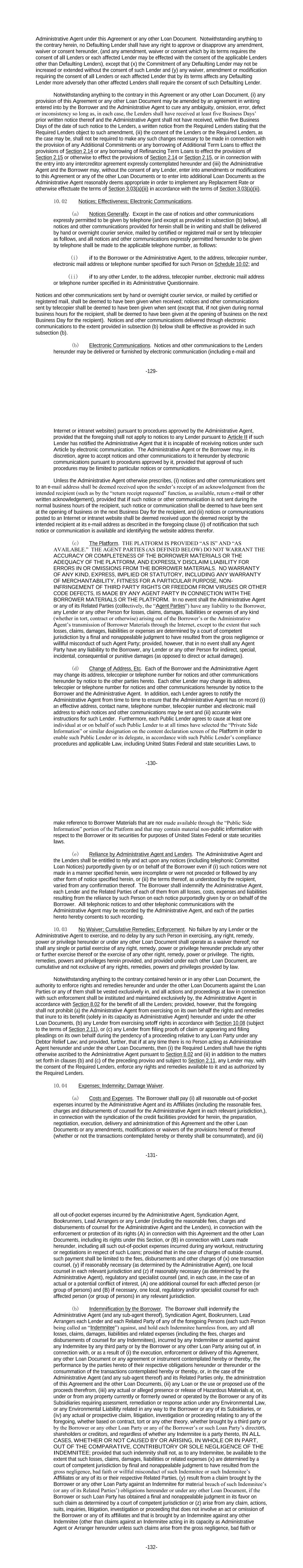 -129- Administrative Agent under this Agreement or any other Loan Document. Notwithstanding anything to the contrary herein, no Defaulting Lender shall have any right to approve or disapprove any amendment, waiver or consent hereunder, (and any amendment, waiver or consent which by its terms requires the consent of all Lenders or each affected Lender may be effected with the consent of the applicable Lenders other than Defaulting Lenders), except that (x) the Commitment of any Defaulting Lender may not be increased or extended without the consent of such Lender and (y) any waiver, amendment or modification requiring the consent of all Lenders or each affected Lender that by its terms affects any Defaulting Lender more adversely than other affected Lenders shall require the consent of such Defaulting Lender. Notwithstanding anything to the contrary in this Agreement or any other Loan Document, (i) any provision of this Agreement or any other Loan Document may be amended by an agreement in writing entered into by the Borrower and the Administrative Agent to cure any ambiguity, omission, error, defect or inconsistency so long as, in each case, the Lenders shall have received at least five Business Days’ prior written notice thereof and the Administrative Agent shall not have received, within five Business Days of the date of such notice to the Lenders, a written notice from the Required Lenders stating that the Required Lenders object to such amendment, (ii) the consent of the Lenders or the Required Lenders, as the case may be, shall not be required to make any such changes necessary to be made in connection with the provision of any Additional Commitments or any borrowing of Additional Term Loans to effect the provisions of Section 2.14 or any borrowing of Refinancing Term Loans to effect the provisions of Section 2.15 or otherwise to effect the provisions of Section 2.14 or Section 2.15, or in connection with the entry into any intercreditor agreement expressly contemplated hereunder and (iii) the Administrative Agent and the Borrower may, without the consent of any Lender, enter into amendments or modifications to this Agreement or any of the other Loan Documents or to enter into additional Loan Documents as the Administrative Agent reasonably deems appropriate in order to implement any Replacement Rate or otherwise effectuate the terms of Section 3.03(a)(ii) in accordance with the terms of Section 3.03(a)(ii). 10.02 Notices; Effectiveness; Electronic Communications. (a) Notices Generally. Except in the case of notices and other communications expressly permitted to be given by telephone (and except as provided in subsection (b) below), all notices and other communications provided for herein shall be in writing and shall be delivered by hand or overnight courier service, mailed by certified or registered mail or sent by telecopier as follows, and all notices and other communications expressly permitted hereunder to be given by telephone shall be made to the applicable telephone number, as follows: (i) if to the Borrower or the Administrative Agent, to the address, telecopier number, electronic mail address or telephone number specified for such Person on Schedule 10.02; and (ii) if to any other Lender, to the address, telecopier number, electronic mail address or telephone number specified in its Administrative Questionnaire. Notices and other communications sent by hand or overnight courier service, or mailed by certified or registered mail, shall be deemed to have been given when received; notices and other communications sent by telecopier shall be deemed to have been given when sent (except that, if not given during normal business hours for the recipient, shall be deemed to have been given at the opening of business on the next Business Day for the recipient). Notices and other communications delivered through electronic communications to the extent provided in subsection (b) below shall be effective as provided in such subsection (b). (b) Electronic Communications. Notices and other communications to the Lenders hereunder may be delivered or furnished by electronic communication (including e-mail and -130- Internet or intranet websites) pursuant to procedures approved by the Administrative Agent, provided that the foregoing shall not apply to notices to any Lender pursuant to Article II if such Lender has notified the Administrative Agent that it is incapable of receiving notices under such Article by electronic communication. The Administrative Agent or the Borrower may, in its discretion, agree to accept notices and other communications to it hereunder by electronic communications pursuant to procedures approved by it, provided that approval of such procedures may be limited to particular notices or communications. Unless the Administrative Agent otherwise prescribes, (i) notices and other communications sent to an e-mail address shall be deemed received upon the sender’s receipt of an acknowledgement from the intended recipient (such as by the “return receipt requested” function, as available, return e-mail or other written acknowledgement), provided that if such notice or other communication is not sent during the normal business hours of the recipient, such notice or communication shall be deemed to have been sent at the opening of business on the next Business Day for the recipient, and (ii) notices or communications posted to an Internet or intranet website shall be deemed received upon the deemed receipt by the intended recipient at its e-mail address as described in the foregoing clause (i) of notification that such notice or communication is available and identifying the website address therefor. (c) The Platform. THE PLATFORM IS PROVIDED “AS IS” AND “AS AVAILABLE.” THE AGENT PARTIES (AS DEFINED BELOW) DO NOT WARRANT THE ACCURACY OR COMPLETENESS OF THE BORROWER MATERIALS OR THE ADEQUACY OF THE PLATFORM, AND EXPRESSLY DISCLAIM LIABILITY FOR ERRORS IN OR O