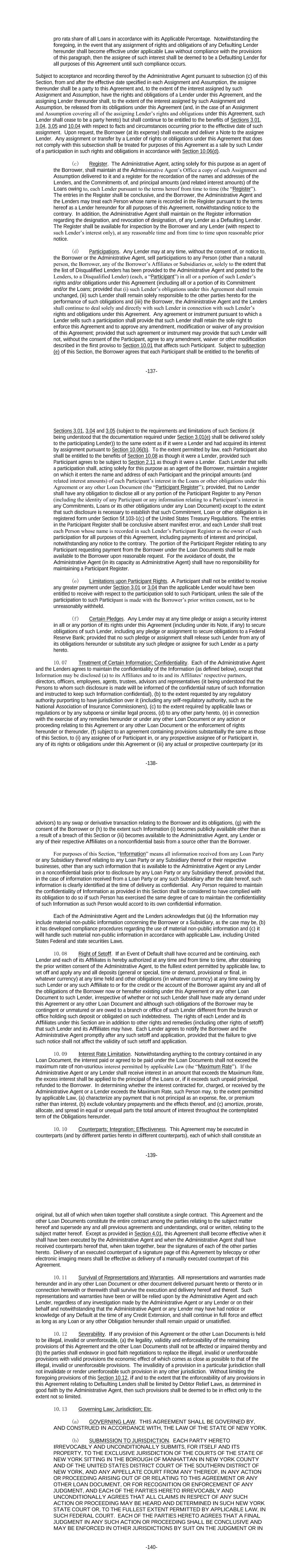 -137- pro rata share of all Loans in accordance with its Applicable Percentage. Notwithstanding the foregoing, in the event that any assignment of rights and obligations of any Defaulting Lender hereunder shall become effective under applicable Law without compliance with the provisions of this paragraph, then the assignee of such interest shall be deemed to be a Defaulting Lender for all purposes of this Agreement until such compliance occurs. Subject to acceptance and recording thereof by the Administrative Agent pursuant to subsection (c) of this Section, from and after the effective date specified in each Assignment and Assumption, the assignee thereunder shall be a party to this Agreement and, to the extent of the interest assigned by such Assignment and Assumption, have the rights and obligations of a Lender under this Agreement, and the assigning Lender thereunder shall, to the extent of the interest assigned by such Assignment and Assumption, be released from its obligations under this Agreement (and, in the case of an Assignment and Assumption covering all of the assigning Lender’s rights and obligations under this Agreement, such Lender shall cease to be a party hereto) but shall continue to be entitled to the benefits of Sections 3.01, 3.04, 3.05 and 10.04 with respect to facts and circumstances occurring prior to the effective date of such assignment. Upon request, the Borrower (at its expense) shall execute and deliver a Note to the assignee Lender. Any assignment or transfer by a Lender of rights or obligations under this Agreement that does not comply with this subsection shall be treated for purposes of this Agreement as a sale by such Lender of a participation in such rights and obligations in accordance with Section 10.06(d). (c) Register. The Administrative Agent, acting solely for this purpose as an agent of the Borrower, shall maintain at the Administrative Agent’s Office a copy of each Assignment and Assumption delivered to it and a register for the recordation of the names and addresses of the Lenders, and the Commitments of, and principal amounts (and related interest amounts) of the Loans owing to, each Lender pursuant to the terms hereof from time to time (the “Register”). The entries in the Register shall be conclusive, and the Borrower, the Administrative Agent and the Lenders may treat each Person whose name is recorded in the Register pursuant to the terms hereof as a Lender hereunder for all purposes of this Agreement, notwithstanding notice to the contrary. In addition, the Administrative Agent shall maintain on the Register information regarding the designation, and revocation of designation, of any Lender as a Defaulting Lender. The Register shall be available for inspection by the Borrower and any Lender (with respect to such Lender’s interest only), at any reasonable time and from time to time upon reasonable prior notice. (d) Participations. Any Lender may at any time, without the consent of, or notice to, the Borrower or the Administrative Agent, sell participations to any Person (other than a natural person, the Borrower, any of the Borrower’s Affiliates or Subsidiaries or, solely to the extent that the list of Disqualified Lenders has been provided to the Administrative Agent and posted to the Lenders, to a Disqualified Lender) (each, a “Participant”) in all or a portion of such Lender’s rights and/or obligations under this Agreement (including all or a portion of its Commitment and/or the Loans; provided that (i) such Lender’s obligations under this Agreement shall remain unchanged, (ii) such Lender shall remain solely responsible to the other parties hereto for the performance of such obligations and (iii) the Borrower, the Administrative Agent and the Lenders shall continue to deal solely and directly with such Lender in connection with such Lender’s rights and obligations under this Agreement. Any agreement or instrument pursuant to which a Lender sells such a participation shall provide that such Lender shall retain the sole right to enforce this Agreement and to approve any amendment, modification or waiver of any provision of this Agreement; provided that such agreement or instrument may provide that such Lender will not, without the consent of the Participant, agree to any amendment, waiver or other modification described in the first proviso to Section 10.01 that affects such Participant. Subject to subsection (e) of this Section, the Borrower agrees that each Participant shall be entitled to the benefits of -138- Sections 3.01, 3.04 and 3.05 (subject to the requirements and limitations of such Sections (it being understood that the documentation required under Section 3.01(e) shall be delivered solely to the participating Lender)) to the same extent as if it were a Lender and had acquired its interest by assignment pursuant to Section 10.06(b). To the extent permitted by law, each Participant also shall be entitled to the benefits of Section 10.08 as though it were a Lender, provided such Participant agrees to be subject to Section 2.11 as though it were a Lender. Each Lender that sells a participation shall, acting solely for this purpose as an agent of the Borrower, maintain a register on which it enters the name and address of each Participant and the principal amounts (and related interest amounts) of each Participant’s interest in the Loans or other obligations under this Agreement or any other Loan Document (the “Participant Register”); provided, that no Lender shall have any obligation to disclose all or any portion of the Participant Register to any Person (including the identity of any Participant or any information relating to a Participant’s interest in any Commitments, Loans or its other obligations under any Loan Document) except to the extent that such disclosure is necessary to establish that such Commitment, Loan or other obligation is in registered form under Section 5f.103-1(c) of the United