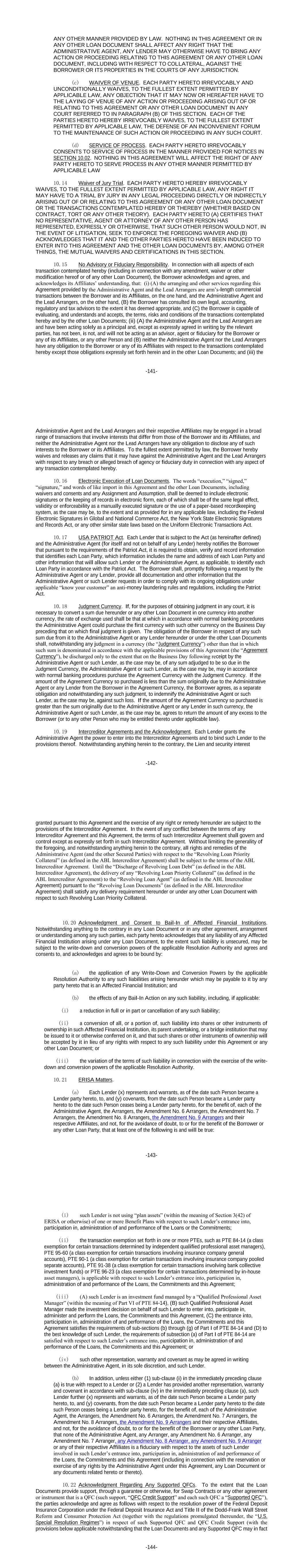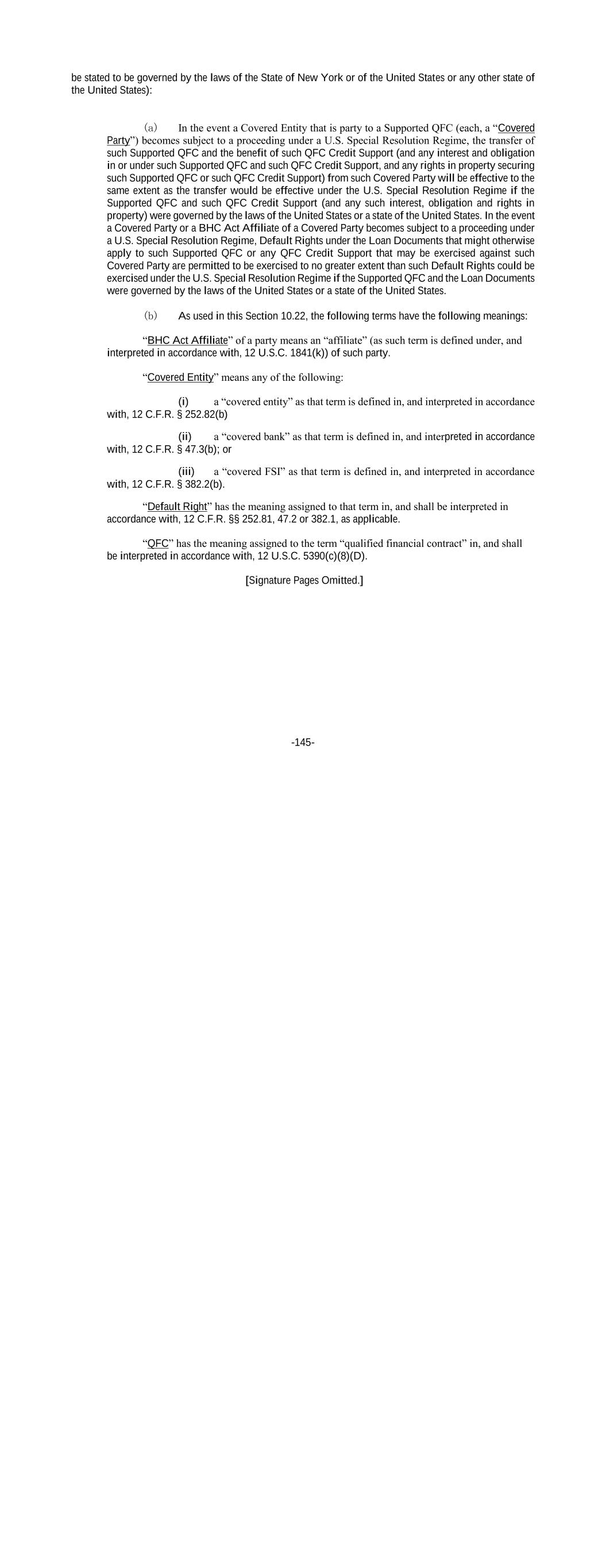 -145- be stated to be governed by the laws of the State of New York or of the United States or any other state of the United States): (a) In the event a Covered Entity that is party to a Supported QFC (each, a “Covered Party”) becomes subject to a proceeding under a U.S. Special Resolution Regime, the transfer of such Supported QFC and the benefit of such QFC Credit Support (and any interest and obligation in or under such Supported QFC and such QFC Credit Support, and any rights in property securing such Supported QFC or such QFC Credit Support) from such Covered Party will be effective to the same extent as the transfer would be effective under the U.S. Special Resolution Regime if the Supported QFC and such QFC Credit Support (and any such interest, obligation and rights in property) were governed by the laws of the United States or a state of the United States. In the event a Covered Party or a BHC Act Affiliate of a Covered Party becomes subject to a proceeding under a U.S. Special Resolution Regime, Default Rights under the Loan Documents that might otherwise apply to such Supported QFC or any QFC Credit Support that may be exercised against such Covered Party are permitted to be exercised to no greater extent than such Default Rights could be exercised under the U.S. Special Resolution Regime if the Supported QFC and the Loan Documents were governed by the laws of the United States or a state of the United States. (b) As used in this Section 10.22, the following terms have the following meanings: “BHC Act Affiliate” of a party means an “affiliate” (as such term is defined under, and interpreted in accordance with, 12 U.S.C. 1841(k)) of such party. “Covered Entity” means any of the following: (i) a “covered entity” as that term is defined in, and interpreted in accordance with, 12 C.F.R. § 252.82(b) (ii) a “covered bank” as that term is defined in, and interpreted in accordance with, 12 C.F.R. § 47.3(b); or (iii) a “covered FSI” as that term is defined in, and interpreted in accordance with, 12 C.F.R. § 382.2(b). “Default Right” has the meaning assigned to that term in, and shall be interpreted in accordance with, 12 C.F.R. §§ 252.81, 47.2 or 382.1, as applicable. “QFC” has the meaning assigned to the term “qualified financial contract” in, and shall be interpreted in accordance with, 12 U.S.C. 5390(c)(8)(D). [Signature Pages Omitted.]