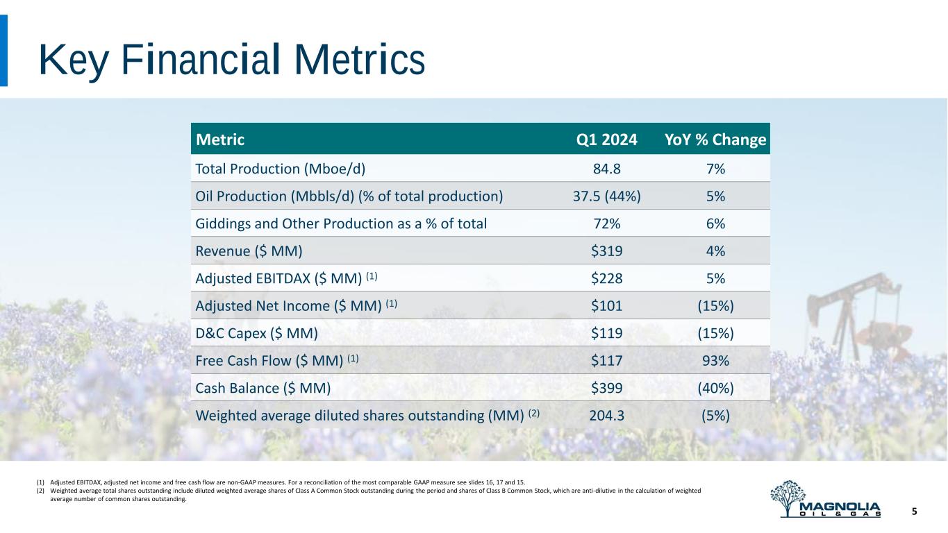 Giddings Bolt-On Acquisition 4 April Acquisition Highlights ❑ Acquired >27,000 net acres in Giddings (>80,000 gross) from a private operator for ~$125 million; closed on April 30th ❑ Includes ~1,000 BOEPD (~35% oil, ~68% liquids) ❑ Primarily in Fayette, Washington and Lee counties ❑ Low PDP assets are within our existing acreage footprint; in a highly productive area we know well ❑ Significantly increases Magnolia’s development opportunities through: ❑ Increased working interest in future high-return development locations (adds on average ~13% WI to existing overlapping leases) ❑ New locations with high working interest added to already deep inventory (~70% of net acreage are new leases) ❑ Additional royalty interest Existing Acreage Acquired Acreage Increased WI