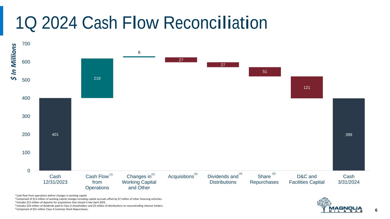 Key Financial Metrics (1) Adjusted EBITDAX, adjusted net income and free cash flow are non-GAAP measures. For a reconciliation of the most comparable GAAP measure see slides 16, 17 and 15. (2) Weighted average total shares outstanding include diluted weighted average shares of Class A Common Stock outstanding during the period and shares of Class B Common Stock, which are anti-dilutive in the calculation of weighted average number of common shares outstanding. 5 Metric Q1 2024 YoY % Change Total Production (Mboe/d) 84.8 7% Oil Production (Mbbls/d) (% of total production) 37.5 (44%) 5% Giddings and Other Production as a % of total 72% 6% Revenue ($ MM) $319 4% Adjusted EBITDAX ($ MM) (1) $228 5% Adjusted Net Income ($ MM) (1) $101 (15%) D&C Capex ($ MM) $119 (15%) Free Cash Flow ($ MM) (1) $117 93% Cash Balance ($ MM) $399 (40%) Weighted average diluted shares outstanding (MM) (2) 204.3 (5%)