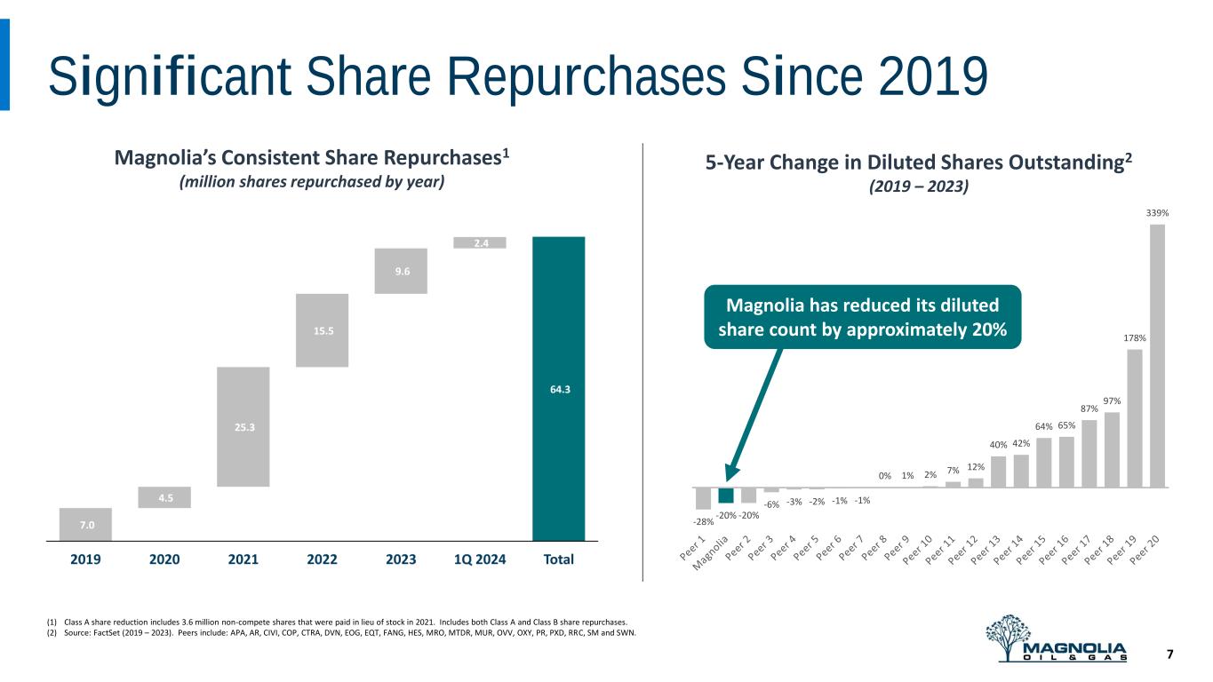 1Q 2024 Cash Flow Reconciliation 6 401 218 6 27 27 51 121 399 0 100 200 300 400 500 600 700 Cash 12/31/2023 Cash Flow from Operations Changes in Working Capital and Other Acquisitions Dividends and Distributions Share Repurchases D&C and Facilities Capital Cash 3/31/2024 (1) (4)(3)(2) (5) $ In M ill io n s 1 Cash flow from operations before changes in working capital 2 Comprised of $13 million of working capital changes including capital accruals offset by $7 million of other financing activities. 3 Includes $13 million of deposits for acquisitions that closed in late April 2024. 4 Includes $24 million of dividends paid to Class A shareholders and $3 million of distributions to noncontrolling interest holders. 5 Comprised of $51 million Class A Common Stock Repurchases.