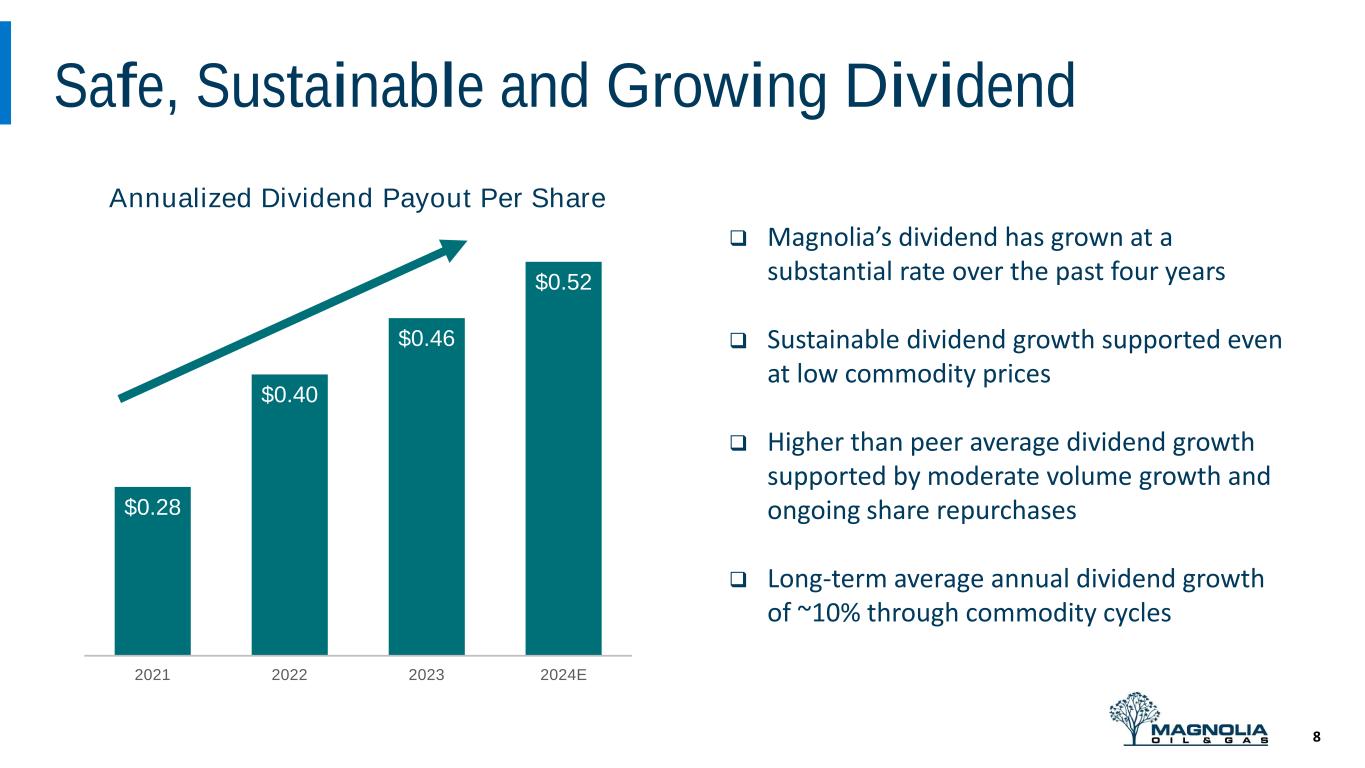-28% -20% -20% -6% -3% -2% -1% -1% 0% 1% 2% 7% 12% 40% 42% 64% 65% 87% 97% 178% 339% Significant Share Repurchases Since 2019 (1) Class A share reduction includes 3.6 million non-compete shares that were paid in lieu of stock in 2021. Includes both Class A and Class B share repurchases. (2) Source: FactSet (2019 – 2023). Peers include: APA, AR, CIVI, COP, CTRA, DVN, EOG, EQT, FANG, HES, MRO, MTDR, MUR, OVV, OXY, PR, PXD, RRC, SM and SWN. 7 5-Year Change in Diluted Shares Outstanding2 (2019 – 2023) Magnolia has reduced its diluted share count by approximately 20% Magnolia’s Consistent Share Repurchases1 (million shares repurchased by year)