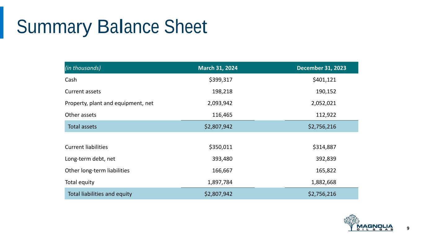 Safe, Sustainable and Growing Dividend 8 $0.28 $0.40 $0.46 $0.52 2021 2022 2023 2024E Annualized Dividend Payout Per Share ❑ Magnolia’s dividend has grown at a substantial rate over the past four years ❑ Sustainable dividend growth supported even at low commodity prices ❑ Higher than peer average dividend growth supported by moderate volume growth and ongoing share repurchases ❑ Long-term average annual dividend growth of ~10% through commodity cycles
