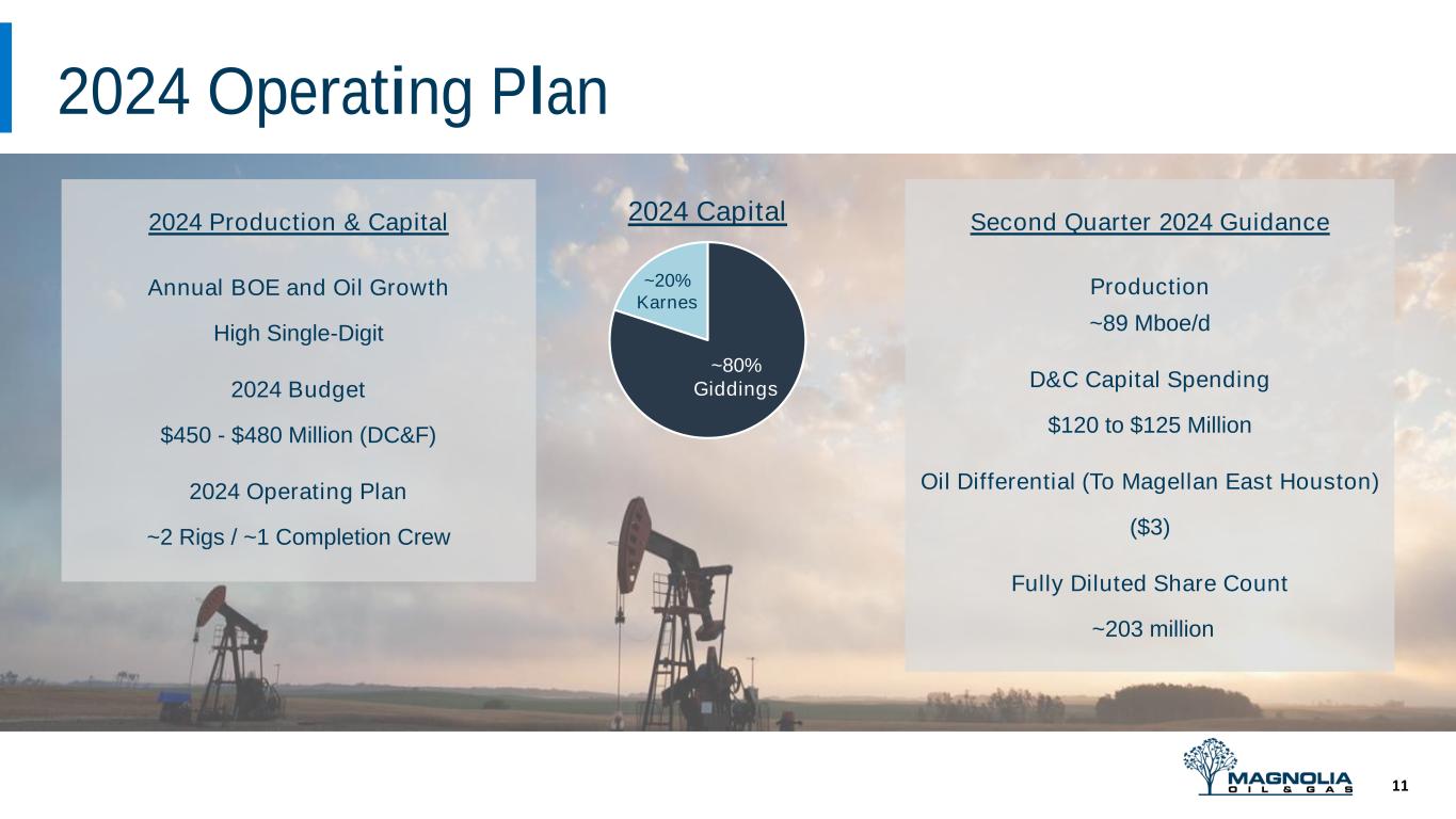 Magnolia continues to operate two drilling rigs and one completion crew and expects to maintain this level of activity throughout the year. While this activity level is similar to the 2023 operating plan, lower well costs combined with improved operating efficiencies allow for more wells to be drilled, completed and turned in line during 2024 and help to support Magnolia’s overall high-margin growth. Most of this year’s development activity will consist of multi-well development pads in the Giddings area, with a proportionally smaller amount of development planned in the Karnes area, in addition to some appraisal wells on our assets. For Giddings development activity in 2024, we currently expect to drill multi-well pads with somewhat longer lateral lengths of approximately 8,500 feet as compared to last year.