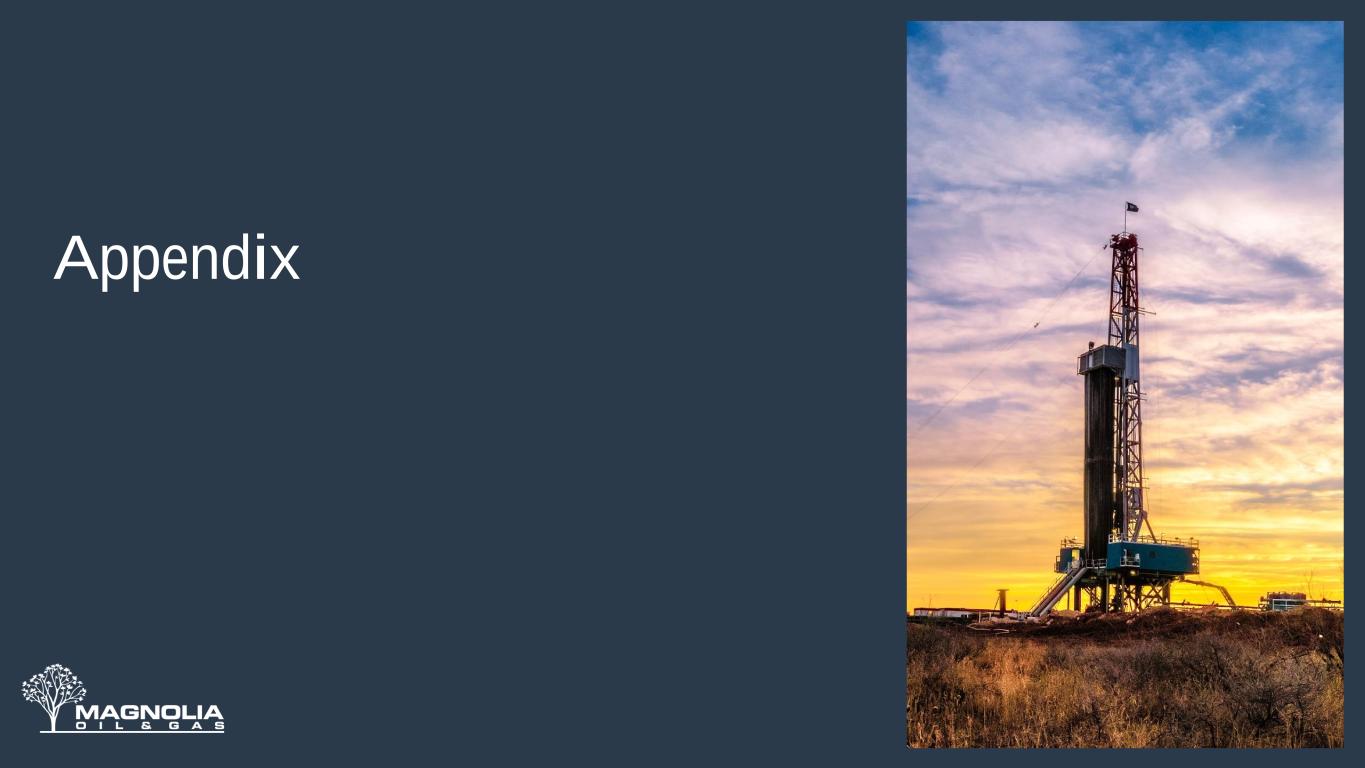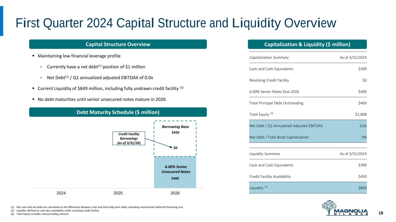 Adjusted Net Income Reconciliation 17 (1) Represents corporate income taxes at an assumed annual effective tax rate of 18.9% and 19.6% for the quarters ended March 31, 2024 and 2023, respectively. (2) Adjusted Net Income is a non-GAAP measure. For reasons management believes this is useful to investors, refer to slide 2 “Non-GAAP Financial Measure”. (3) Shares of Class B Common Stock, and corresponding Magnolia LLC Units, are anti-dilutive in the calculation of weighted average number of common shares outstanding. (in thousands) For the Quarters Ended March 31, 2024 March 31, 2023 Net income $97,597 $106,677 Adjustments: Loss on revaluation of contingent consideration 4,205 - Impairment of oil and natural gas properties - 15,735 Change in estimated income tax(1) (795) (3,089) Adjusted Net Income (2) $101,007 $119,323 (in thousands) For the Quarters Ended Total Share Count March 31, 2024 March 31, 2023 Diluted weighted average shares of Class A Common Stock outstanding during the period 182,424 192,054 Weighted average shares of Class B Common Stock outstanding during the period (3) 21,827 21,827 Total weighted average shares of Class A and B Common Stock, including dilutive impact of other securities (3) 204,251 213,881