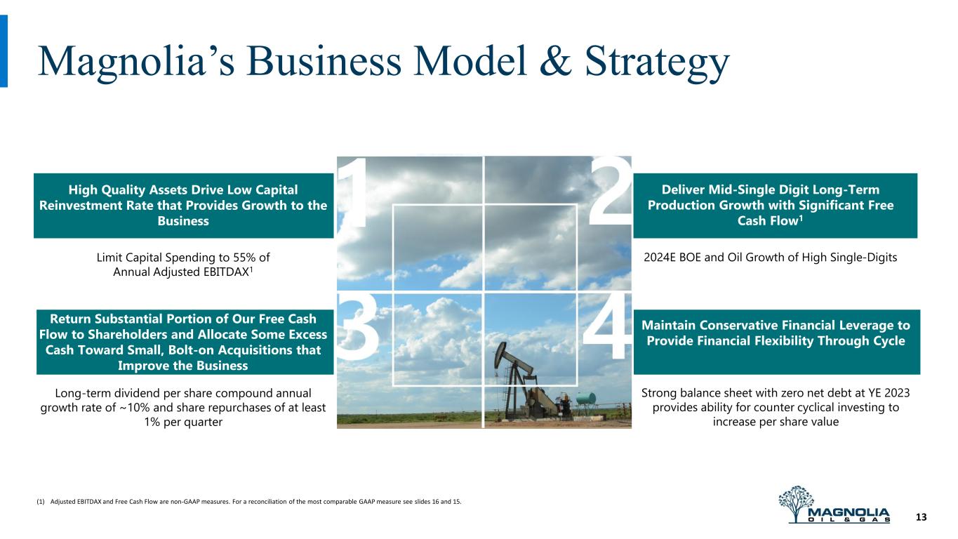 Disclaimer 2 12% FORWARD LOOKING STATEMENTS The information in this press release includes forward-looking statements within the meaning of Section 27A of the Securities Act of 1933, as amended, and Section 21E of the Securities Exchange Act of 1934, as amended. All statements, other than statements of present or historical fact included in this press release, regarding Magnolia’s strategy, future operations, financial position, estimated revenues and losses, projected costs, prospects, plans and objectives of management are forward looking statements. When used in this press release, the words could, should, will, may, believe, anticipate, intend, estimate, expect, project, the negative of such terms and other similar expressions are intended to identify forward-looking statements, although not all forward-looking statements contain such identifying words. These forward-looking statements are based on management’s current expectations and assumptions about future events. Except as otherwise required by applicable law, Magnolia disclaims any duty to update any forward-looking statements, all of which are expressly qualified by the statements in this section, to reflect events or circumstances after the date of this press release. Magnolia cautions you that these forward-looking statements are subject to all of the risks and uncertainties, most of which are difficult to predict and many of which are beyond the control of Magnolia, incident to the development, production, gathering and sale of oil, natural gas and natural gas liquids. In addition, Magnolia cautions you that the forward looking statements contained in this press release are subject to the following factors: (i) the supply and demand for oil, natural gas, NGLs, and other products or services, including impacts of actions taken by OPEC and other state-controlled oil companies; (ii) the outcome of any legal proceedings that may be instituted against Magnolia; (iii) Magnolia’s ability to realize the anticipated benefits of its acquisitions, which may be affected by, among other things, competition and the ability of Magnolia to grow and manage growth profitably; (iv) changes in applicable laws or regulations; (v) geopolitical and business conditions in key regions of the world; and (vi) the possibility that Magnolia may be adversely affected by other economic, business, and/or competitive factors, including inflation. Should one or more of the risks or uncertainties described in this press release occur, or should underlying assumptions prove incorrect, actual results and plans could differ materially from those expressed in any forward-looking statements. Additional information concerning these and other factors that may impact the operations and projections discussed herein can be found in Magnolia’s filings with the SEC, including its Annual Report on Form 10-K for the fiscal year ended December 31, 2023. Magnolia’s SEC filings are available publicly on the SEC’s website at www.sec.gov. NON-GAAP FINANCIAL MEASURES This presentation includes non-GAAP financial measures, including adjusted net income, free cash flow, adjusted EBITDAX, adjusted cash operating costs, adjusted cash operating margin and adjusted operating income margin. Magnolia believes these metrics are useful because they allow Magnolia to more effectively evaluate its operating performance and compare the results of its operations from period to period and against its peers without regard to accounting methods or capital structure. Magnolia does not consider these non-GAAP measures in isolation or as an alternative to similar financial measures determined in accordance with GAAP. The computations of these non-GAAP measures may not be comparable to other similarly titled measures of other companies. Adjusted net income and adjusted EBITDAX should not be considered an alternative to, or more meaningful than, net income as determined in accordance with GAAP. Certain items excluded from free cash flow, adjusted net income, adjusted EBITDAX, adjusted cash operating costs, adjusted cash operating margin and adjusted operating margin are significant components in understanding and assessing a company’s financial performance and should not be construed as an inference that its results will be unaffected by unusual or non-recurring terms. As performance measures, adjusted net income, adjusted EBITDAX, adjusted cash operating costs, adjusted cash operating margin and adjusted operating income margin may be useful to investors in facilitating comparisons to others in the Company’s industry because certain items can vary substantially in the oil and gas industry from company to company depending upon accounting methods, book value of assets, and capital structure, among other factors. Management believes excluding these items facilitates investors and analysts in evaluating and comparing the underlying operating and financial performance of our business from period to period by eliminating differences caused by the existence and timing of certain expense and income items that would not otherwise be apparent on a GAAP basis. As a liquidity measure, management believes free cash flow is useful for investors and widely accepted by those following the oil and gas industry as financial indicators of a company’s ability to generate cash to internally fund drilling and completion activities, fund acquisitions, and service debt. Our presentation of adjusted net income, adjusted EBITDAX, free cash flow, adjusted cash operating costs, adjusted cash operating margin and adjusted operating income margin may not be comparable to similar measures of other companies in our industry. A free cash flow reconciliation is shown on page 15, adjusted EBITDAX reconciliation is shown on page 16 of the presentation, adjusted net income is shown on page 17, and adjusted cash operating costs, adjusted cash operating margin and adjusted operating income margin reconciliations are s