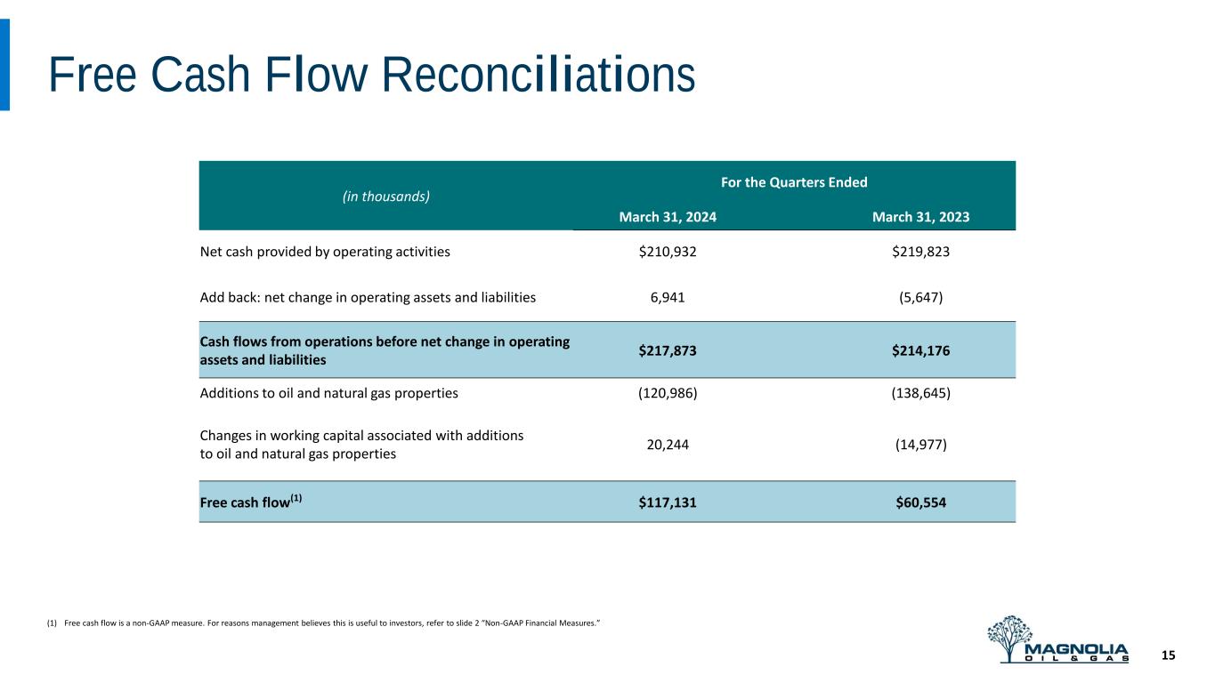 Committed to Sustainability 14 (1) Gas flared as a percent of total production. (2) Number of work-related injuries and illnesses per 200,000 workhours. 2023 Sustainability Report Highlights Include: ❑ Magnolia record for lowest annual flaring rate1 at 0.11%, a reduction of almost 90% since 2019 ❑ Addition of scope 2 emissions reporting; providing further disclosure of the Company’s operations ❑ Continued production of low intensity barrels ❑ 2022 scope 1 intensity of 14.9 metric tons CO2e/Mboe, approximately 10% below 2019 levels ❑ Focused on strengthening local communities through employment opportunities and utilizing local vendors ❑ Commitment to safe operations – low total recordable incident rate and strong HSE training initiatives Flaring Intensity(1) 0.99% 0.69% 0.28% 0.11% 2019 2020 2021 2022 0.57 0.49 2021 2022 Total Recordable Incident Rate(2) (TRIR) Board Diversity and Independence 25% FEMALE 2 of 8 Board members are women. 25% MINORITIES 2 of 8 Board members identifies as a minority. 75% INDEPENDENT 6 of 8 Board members are independent.
