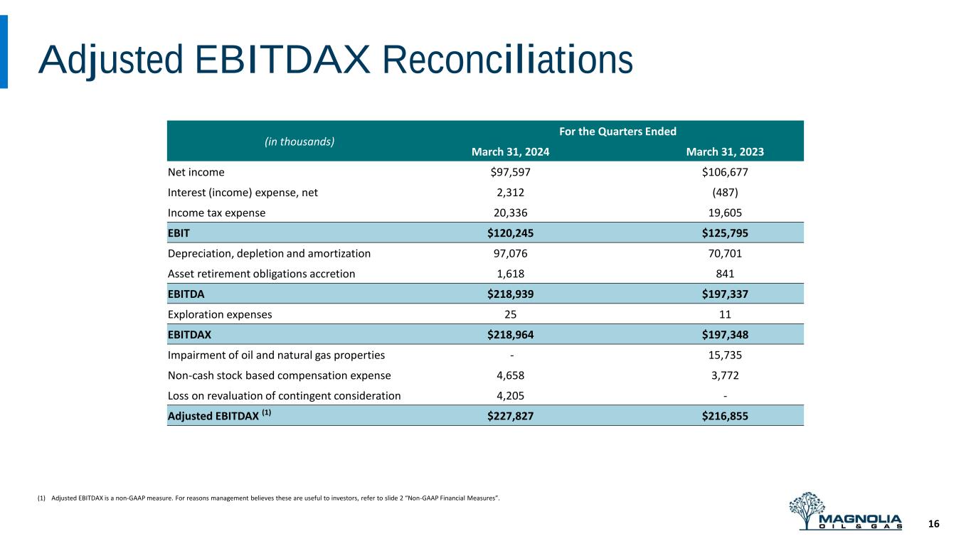 Free Cash Flow Reconciliations 15 (1) Free cash flow is a non-GAAP measure. For reasons management believes this is useful to investors, refer to slide 2 “Non-GAAP Financial Measures.” (in thousands) For the Quarters Ended March 31, 2024 March 31, 2023 Net cash provided by operating activities $210,932 $219,823 Add back: net change in operating assets and liabilities 6,941 (5,647) Cash flows from operations before net change in operating assets and liabilities $217,873 $214,176 Additions to oil and natural gas properties (120,986) (138,645) Changes in working capital associated with additions to oil and natural gas properties 20,244 (14,977) Free cash flow(1) $117,131 $60,554
