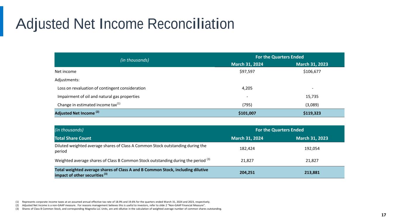 Adjusted EBITDAX Reconciliations 16 (1) Adjusted EBITDAX is a non-GAAP measure. For reasons management believes these are useful to investors, refer to slide 2 “Non-GAAP Financial Measures”. (in thousands) For the Quarters Ended March 31, 2024 March 31, 2023 Net income $97,597 $106,677 Interest (income) expense, net 2,312 (487) Income tax expense 20,336 19,605 EBIT $120,245 $125,795 Depreciation, depletion and amortization 97,076 70,701 Asset retirement obligations accretion 1,618 841 EBITDA $218,939 $197,337 Exploration expenses 25 11 EBITDAX $218,964 $197,348 Impairment of oil and natural gas properties - 15,735 Non-cash stock based compensation expense 4,658 3,772 Loss on revaluation of contingent consideration 4,205 - Adjusted EBITDAX (1) $227,827 $216,855