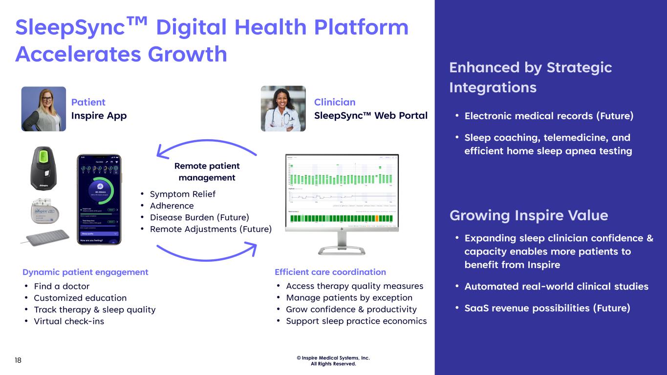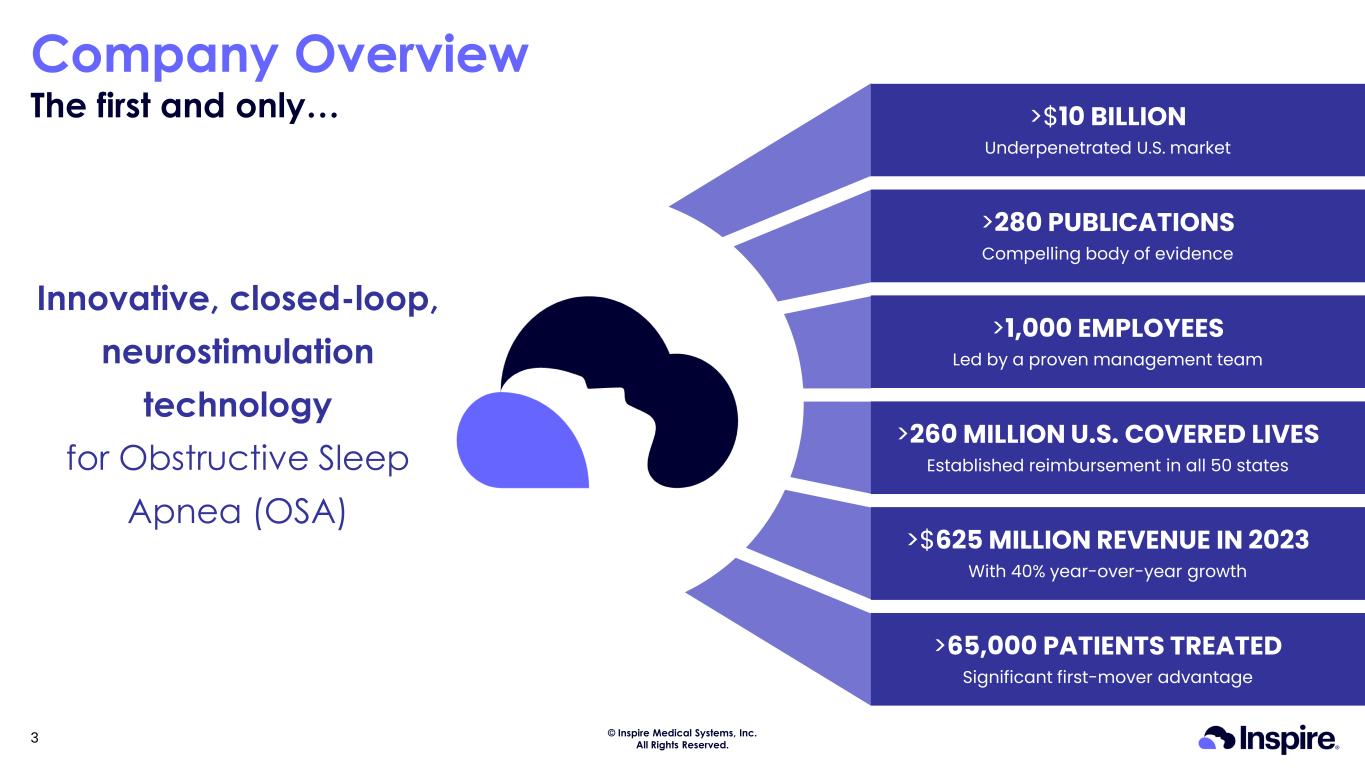 © Inspire Medical Systems, Inc. All Rights Reserved. Disclaimer 2 This presentation contains forward-looking statements within the meaning of the Private Securities Litigation Reform Act of 1995. All statements other than statements of historical facts are forward-looking statements. In some cases, you can identify forward-looking statements by terms such as ‘‘may,’’ ‘‘will,’’ ‘‘should,’’ ‘‘expect,’’ ‘‘plan,’’ ‘‘anticipate,’’ ‘‘could,’’ “future,” “outlook,” ‘‘intend,’’ ‘‘target,’’ ‘‘project,’’ ‘‘contemplate,’’ ‘‘believe,’’ ‘‘estimate,’’ ‘‘predict,’’ ‘‘potential,’’ ‘‘continue,’’ or the negative of these terms or other similar expressions, although not all forward-looking statements contain these words. The forward-looking statements in this presentation relate to, among other things, statements regarding the planned investments in our business, our growth strategies, the expected timing of regulatory approval and market introduction for new products, including the Inspire V neurostimulator, the potential impact that our growth strategies and initiatives may have on our business, full year 2024 financial and operational outlook, the ability of our SleepSync digital health platform to drive growth, and positive insurance coverage of Inspire therapy and improvements in patient flow, care pathway capacity, market access, clinical data growth, product development, indication expansion, market development, and prior authorization approvals. These forward-looking statements are based on management’s current expectations and involve known and unknown risks and uncertainties that may cause our actual results, performance or achievements to be materially different from any future results, performance or achievements expressed or implied by the forward-looking statements. Such risks and uncertainties include, among others, estimates regarding the annual total addressable market for our Inspire therapy in the U.S. and our market opportunity outside the U.S.; future results of operations, financial position, research and development costs, capital requirements and our needs for additional financing; commercial success and market acceptance of our Inspire therapy; the impacts of public health crises and pandemics; general and international economic, political, and other risks, including currency and stock market fluctuations and the uncertain economic environment; challenges experienced by patients in obtaining prior authorization; our ability to achieve and maintain adequate levels of coverage or reimbursement for our Inspire system or any future products we may seek to commercialize; competitive companies and technologies in our industry; our ability to enhance our Inspire system, expand our indications and develop and commercialize additional products; our business model and strategic plans for our products, technologies and business, including our implementation thereof; our ability to accurately forecast customer demand for our Inspire system and manage our inventory; our dependence on third-party suppliers, contract manufacturers and shipping carriers; consolidation in the healthcare industry; our ability to expand, manage and maintain our direct sales and marketing organization, and to market and sell our Inspire system in markets outside of the U.S.; risks associated with international operations; our ability to manage our growth; our ability to increase the number of active medical centers implanting Inspire therapy; our ability to hire and retain our senior management and other highly qualified personnel; risk of product liability claims; risks related to information technology and cybersecurity; risk of damage to or interruptions at our facilities; our ability to obtain regulatory approvals for, and commercialize, our Inspire therapy and system, or the effect of delays in obtaining regulatory approvals or commercializing; FDA or other U.S. or foreign regulatory actions affecting us or the healthcare industry generally, including healthcare reform measures in the U.S. and international markets; the timing or likelihood of regulatory filings and approvals; risks related to our debt and capital structure; our ability to establish and maintain intellectual property protection for our Inspire therapy and system or avoid claims of infringement; tax risks; risks that we may be deemed an investment company under the Investment Company Act of 1940; regulatory risks; the volatility of the trading price of our common stock; and our expectations about market trends. Other important factors that could cause actual results, performance or achievements to differ materially from those contemplated in this presentation can be found under the captions “Risk Factors” and “Management’s Discussion and Analysis of Financial Condition and Results of Operations” in our most recently filed Annual Report on Form 10-K as updated in our most recently filed Quarterly Report on Form 10-Q, and as such factors may be updated from time to time in our other filings with the SEC, which are accessible on the SEC’s website at www.sec.gov and the Investors page of our website at www.inspiresleep.com. These and other important factors could cause actual results to differ materially from those indicated by the forward-looking statements made in this presentation. Any such forward-looking statements represent management’s estimates as of the date of this presentation. While we may elect to update such forward-looking statements at some point in the future, unless required by applicable law, we disclaim any obligation to do so, even if subsequent events cause our views to change. Thus, one should not assume that our silence over time means that actual events are bearing out as expressed or implied in such forward-looking statements. These forward-looking statements should not be rel