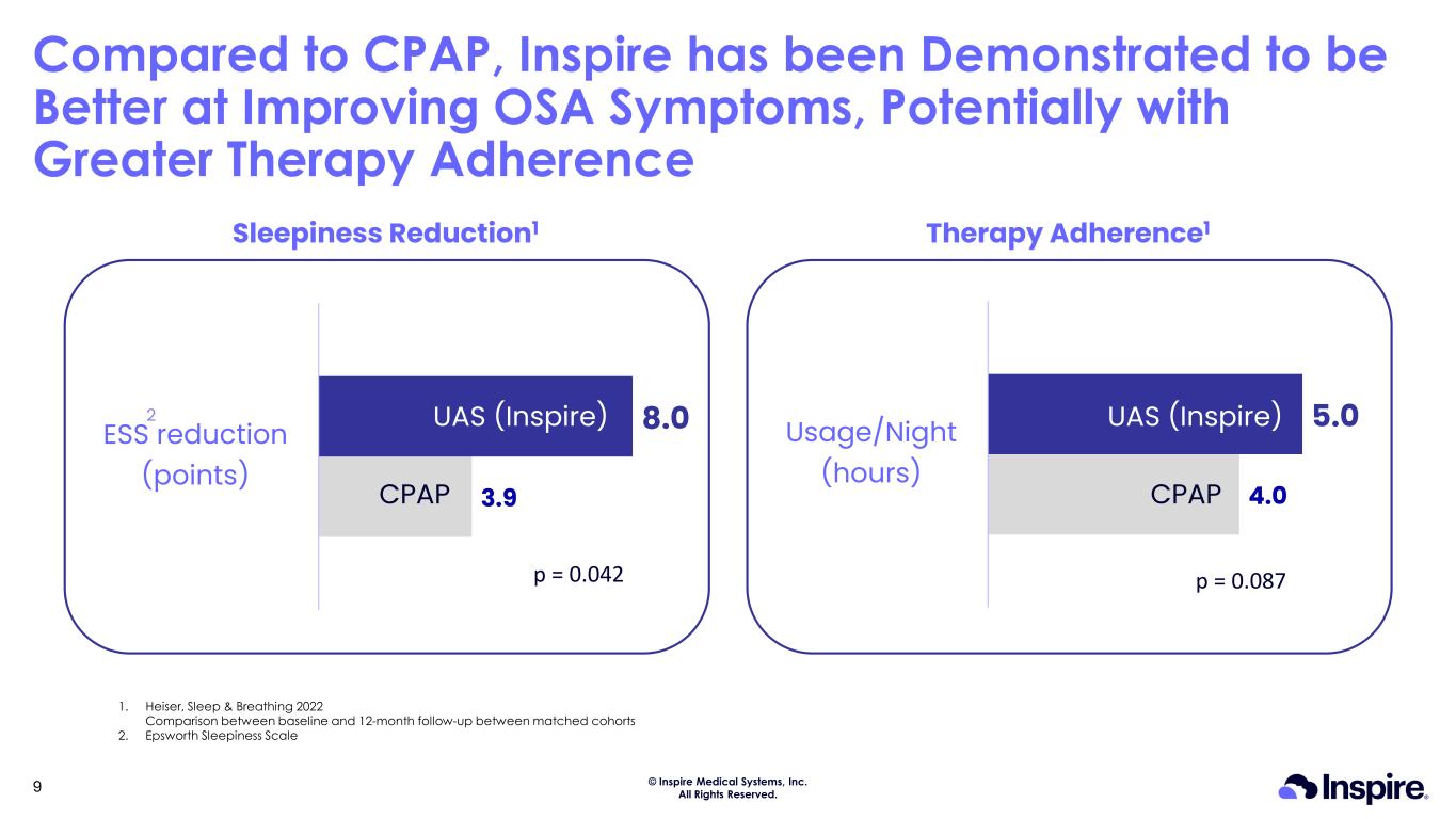 © Inspire Medical Systems, Inc. All Rights Reserved.8 Strong Market Opportunity Exists for an Alternative to CPAP that is Effective and Minimally Invasive 1. Source: World Health Organization. 2. Company estimates. 3. Represents moderate to severe OSA. Source: McKinsey & Company, 2010. Adults with Moderate to Severe OSA Prescribed CPAP2 = ~2 million •Less: 65% CPAP Compliant 35% of CPAP Non- Compliant Adults = ~700,000 •Less: 30% Anatomy Challenges 70% Inspire Anatomy Eligible = ~500,000 •Multiplied by our average selling price Inspire U.S. Market = ~$10 billion Published literature estimates CPAP non-compliance rates of 35% - 65%• Sleep apnea affects +100 million people worldwide1 • Approximately 17 million individuals in the U.S. with moderate to severe OSA • Annually, ~2 million adult patients are prescribed a CPAP device 2 • Annual U.S. economic costs of untreated moderate to severe OSA are estimated to be between $65 - $165 billion3 • OSA economic costs are potentially greater than asthma, heart failure, stroke, and hypertensive disease • OSA is associated with an increase in: • Rate & severity of vehicle accidents • Increased healthcare utilization • Reduction of work performance • Occupational injuries Prevalence & Economic Costs