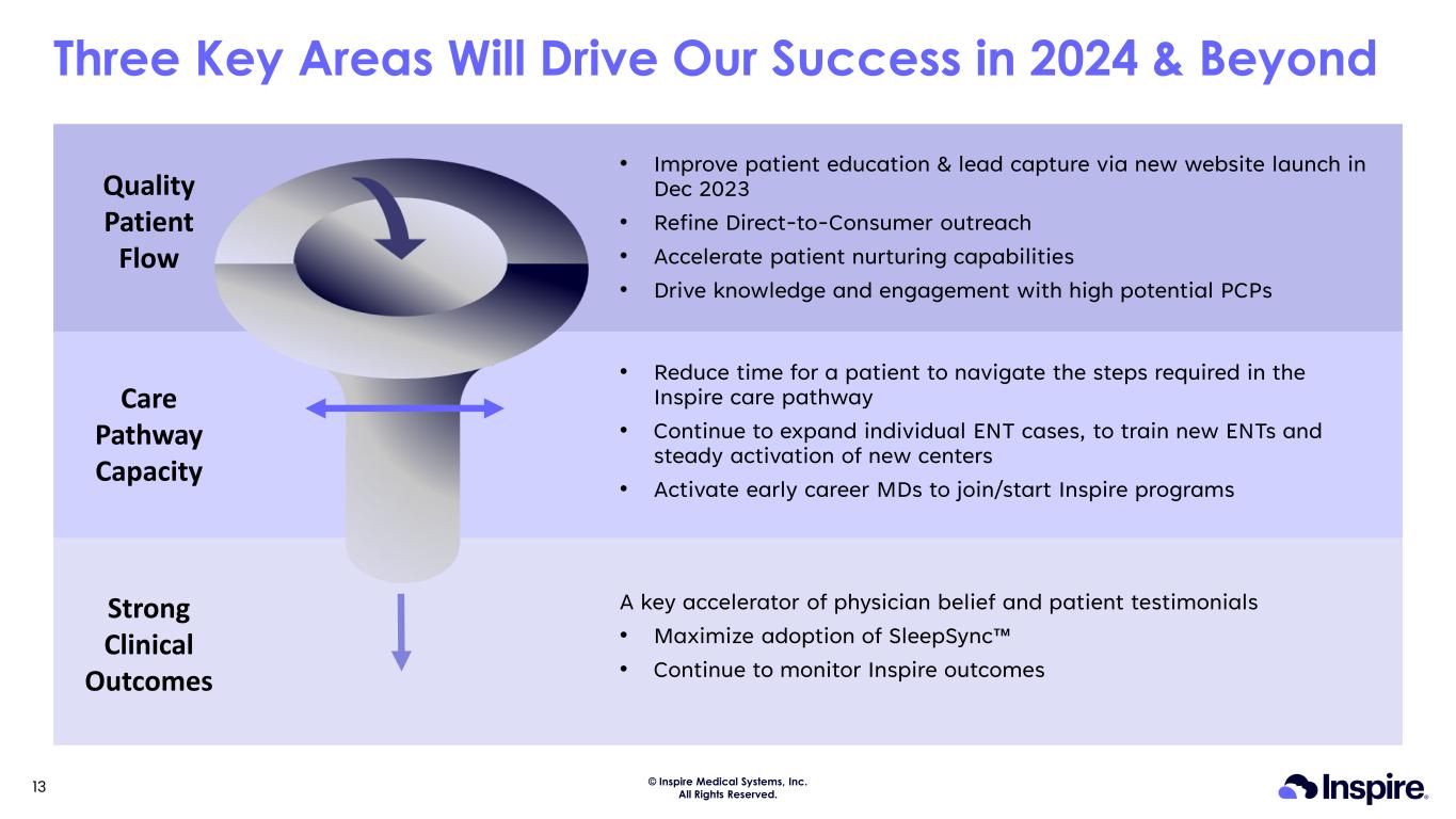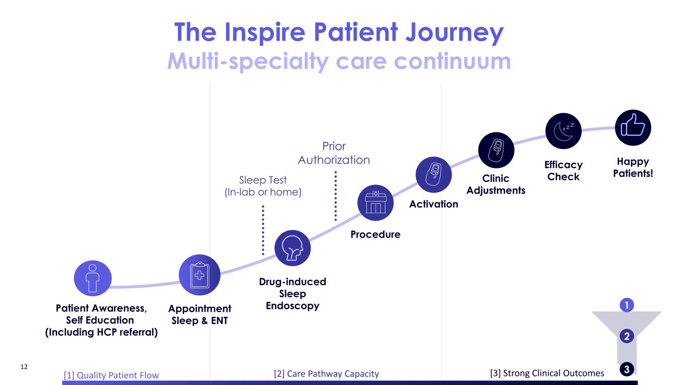 Sleep Test (In-lab or home) Activation Procedure Drug-induced Sleep Endoscopy Happy Patients! Patient Awareness, Self Education (Including HCP referral) Appointment Sleep & ENT Efficacy Check Clinic Adjustments Prior Authorization The Inspire Patient Journey Multi-specialty care continuum 1 2 3[1] Quality Patient Flow [2] Care Pathway Capacity [3] Strong Clinical Outcomes 12