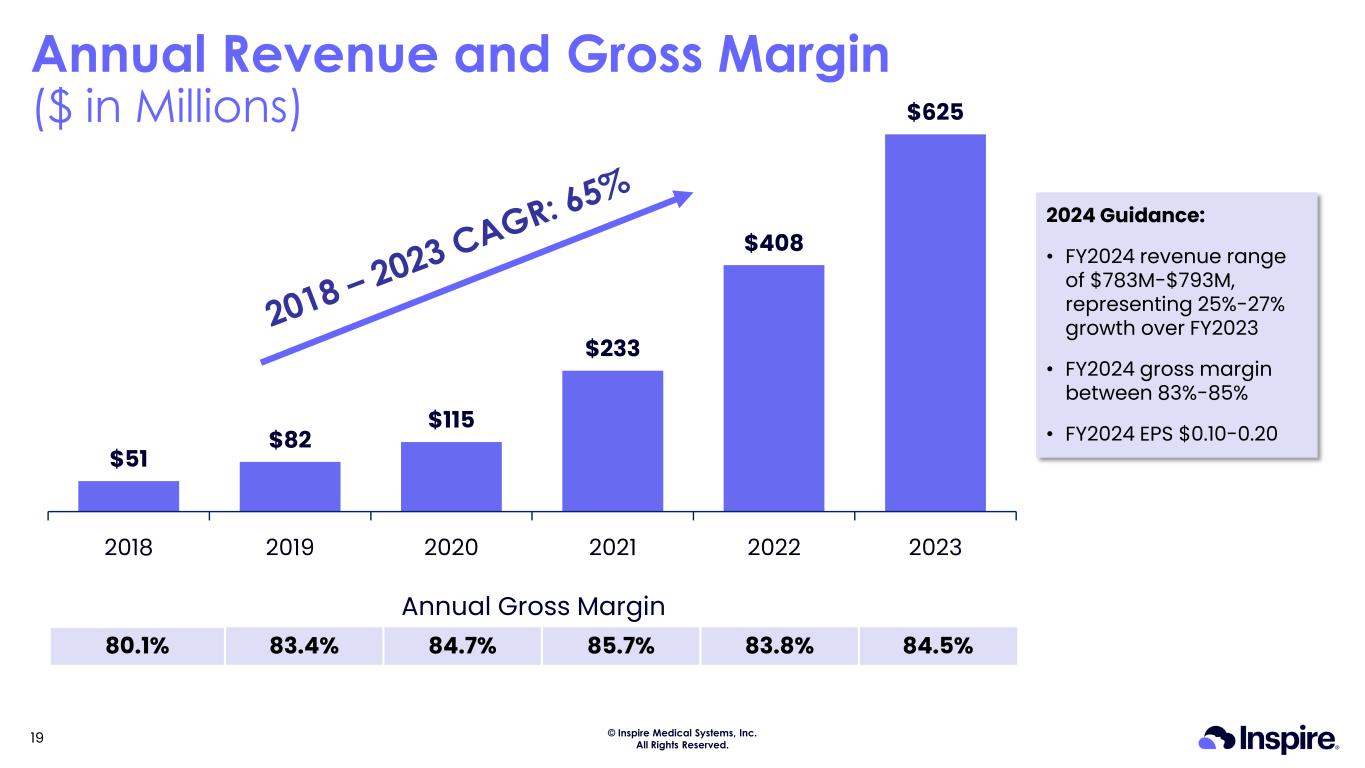 Inspire is increasing its full year 2024 revenue guidance to between $783 million to $793 million, which represents growth of 25% to 27% over full year 2023 revenue of $624.8 million. This compares to the prior revenue guidance of $775 million to $785 million.