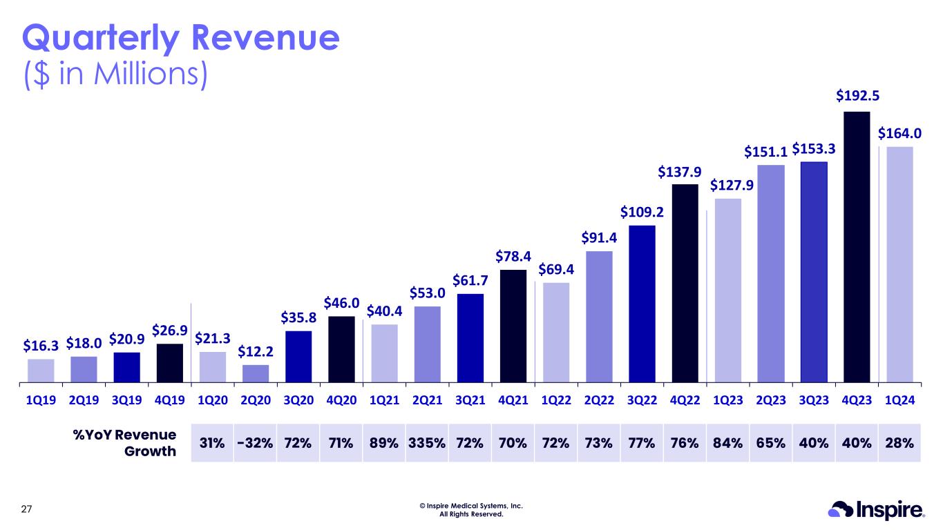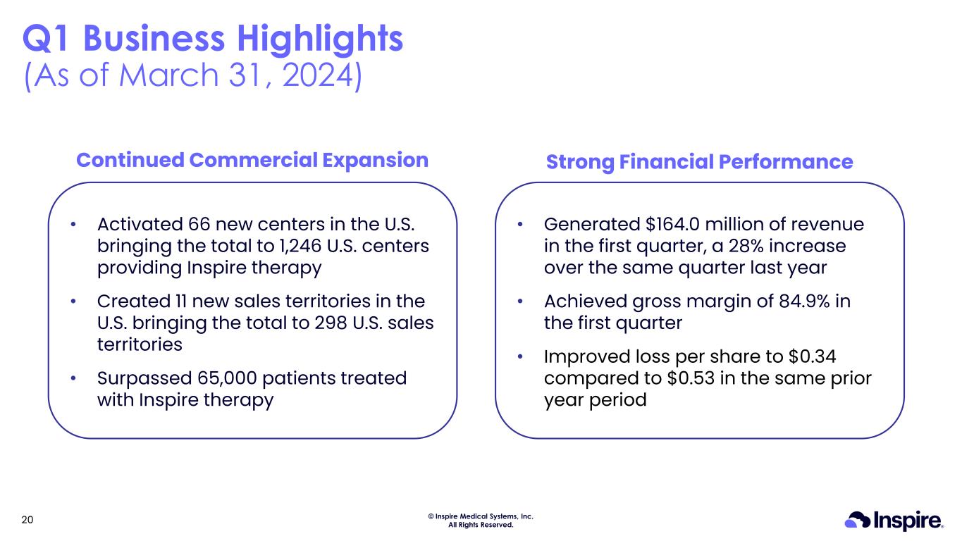 "We are pleased with our strong performance in the first quarter, growing revenue 28% year-over-year. Our revenue growth was again driven by increased market penetration in existing centers, expansion into new territories, and increased physician and patient awareness of our Inspire therapy," said Tim Herbert, Chairman and Chief Executive Officer of Inspire Medical Systems. "Given our strong performance in the quarter and our improved outlook for the remainder of 2024, we are increasing our revenue guidance and we now expect to be profitable for the full year 2024.”